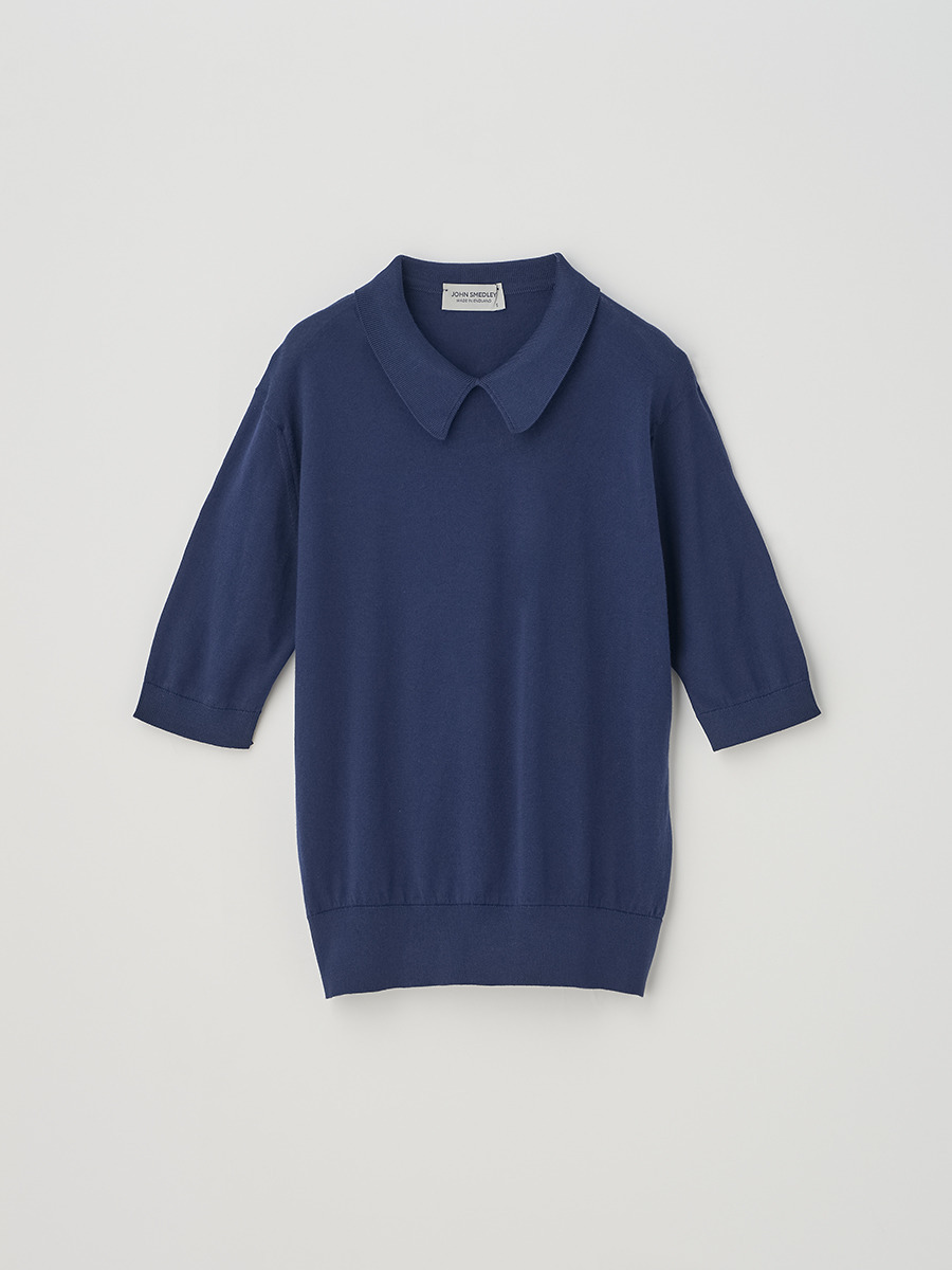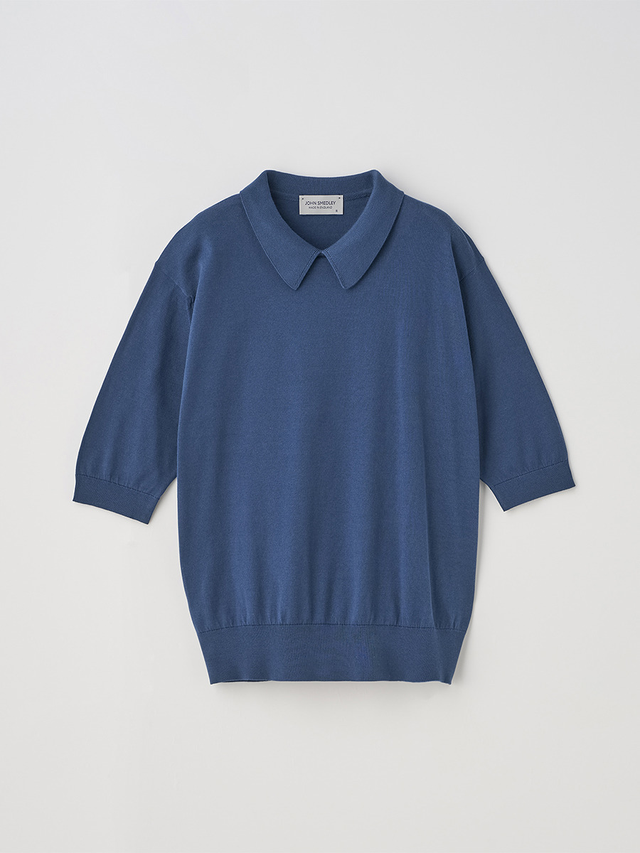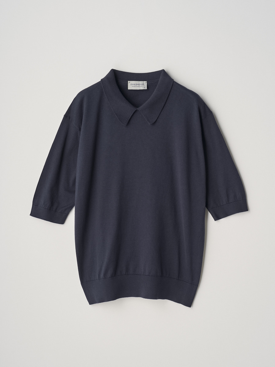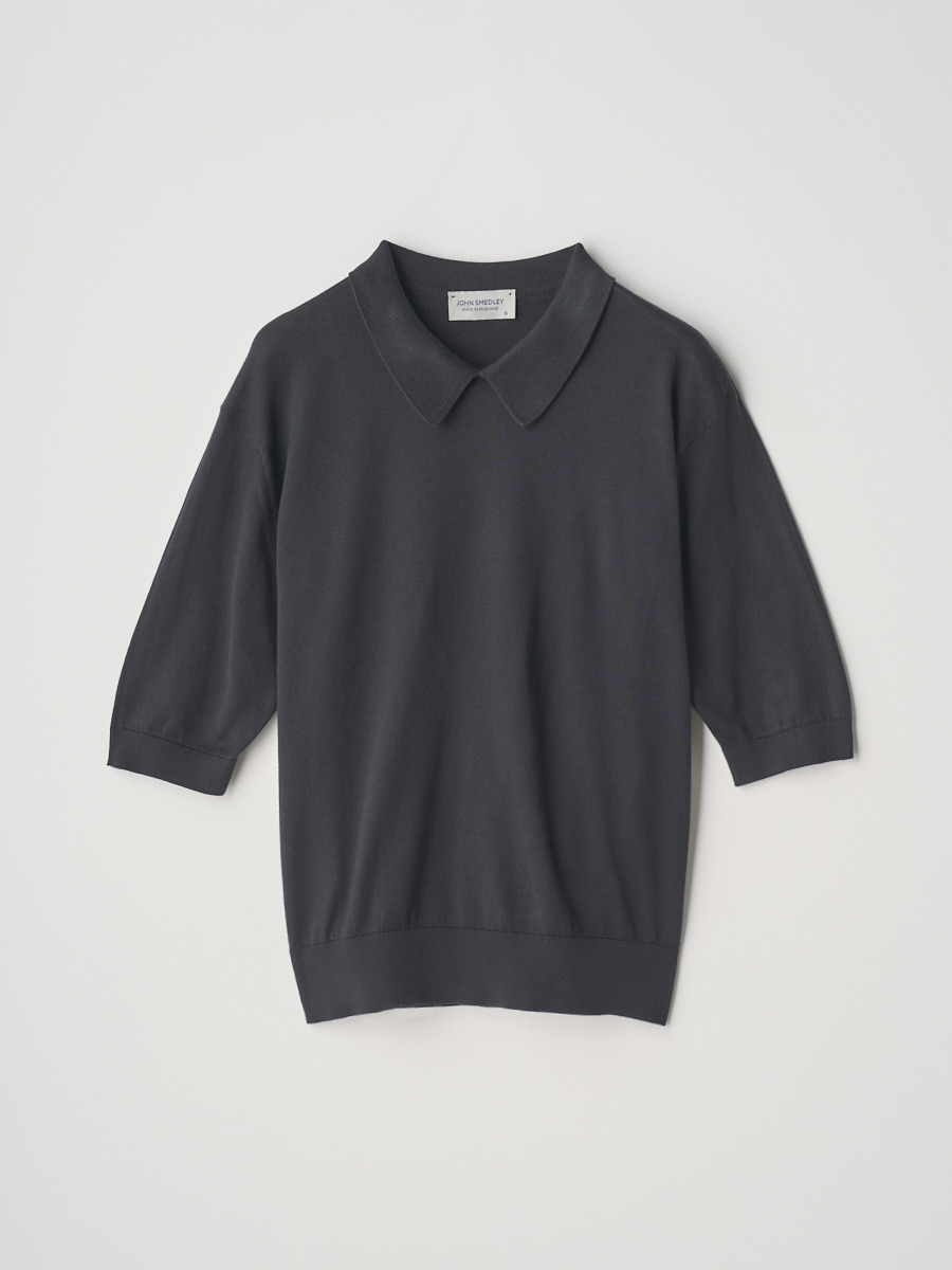 ほどよくゆとりのあるボディに、JOHN SMEDLEYのアーカイブコレクションからやや尖った襟のデザインを採用。ボタンレスとすることでスポーティーさを抑え、上品かつモダンな印象のアイテムに仕上げました。