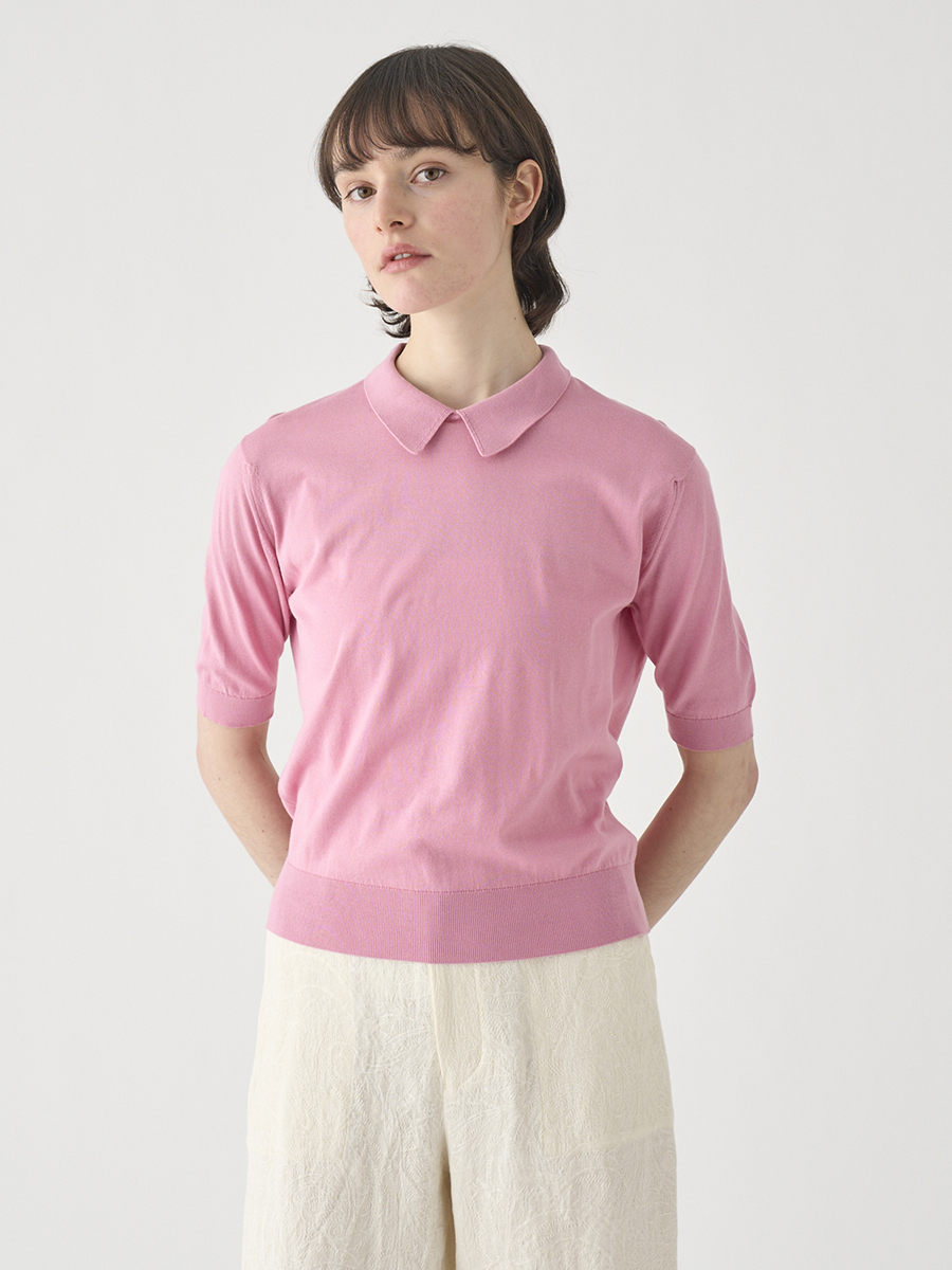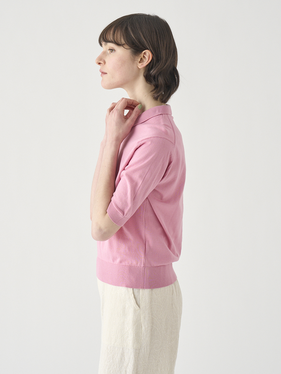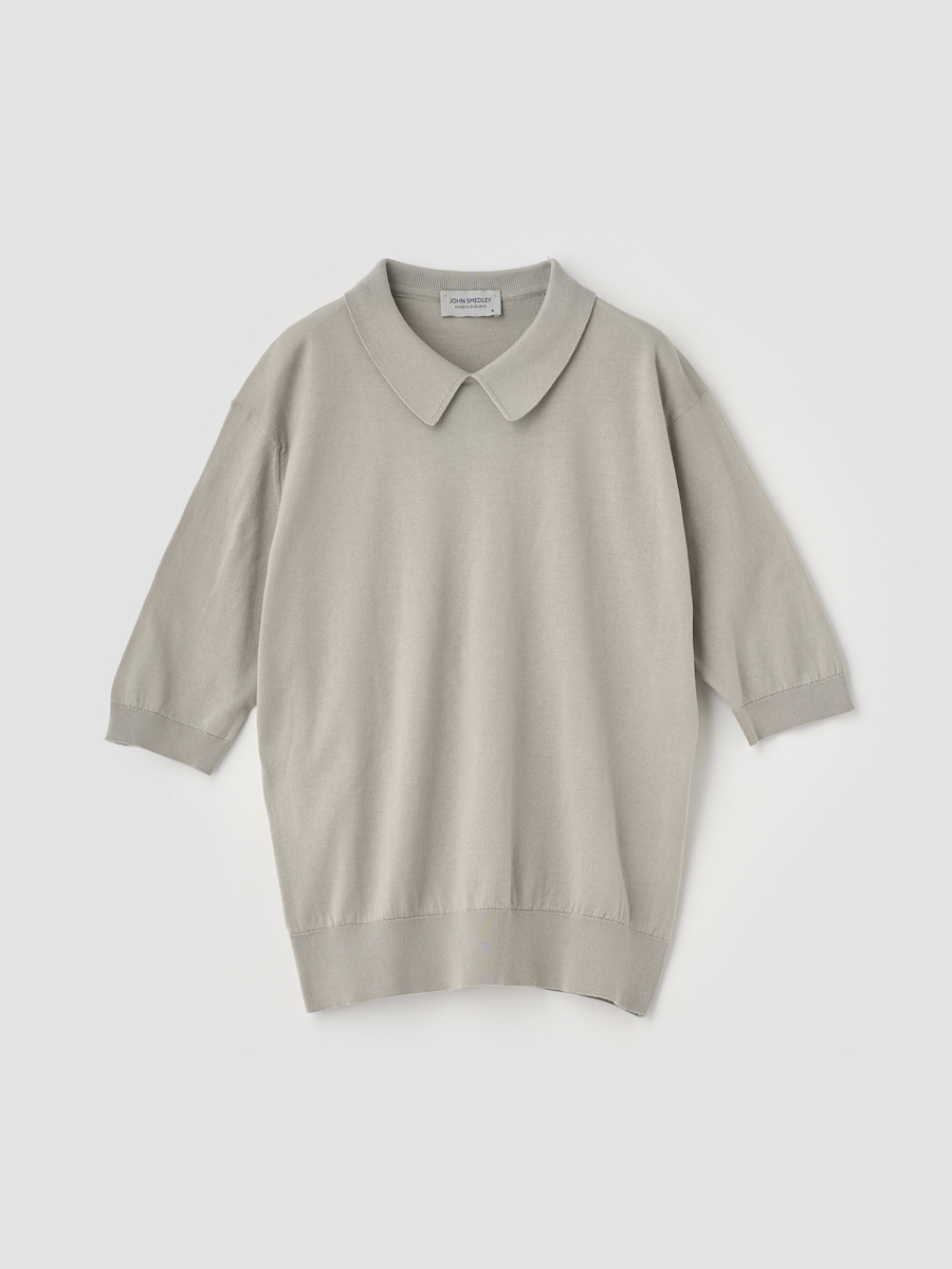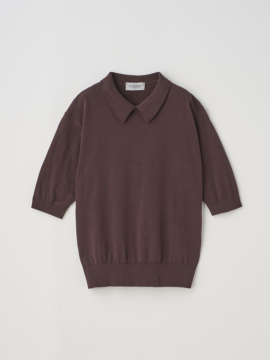 ほどよくゆとりのあるボディに、JOHN SMEDLEYのアーカイブコレクションからやや尖った襟のデザインを採用。ボタンレスとすることでスポーティーさを抑え、上品かつモダンな印象のアイテムに仕上げました。