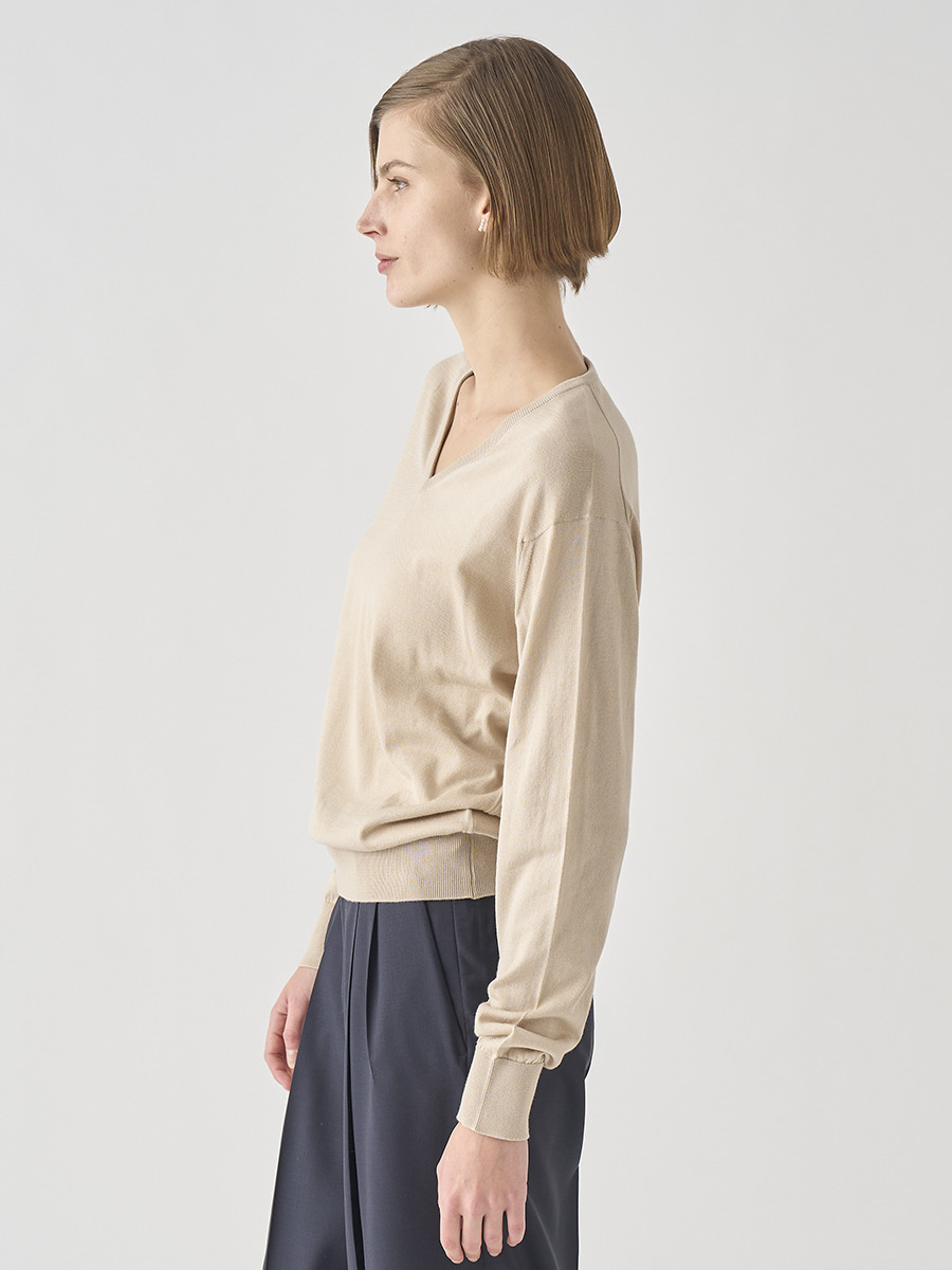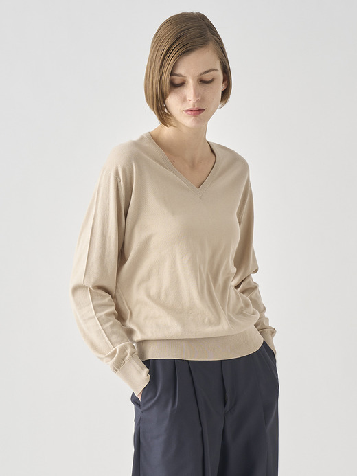ドロップショルダーで身頃にはゆとりをもたせ、ネックはやや広めのVネックにすることで、イージーな着用感ながらもエレガントな雰囲気に。ウエスト周りはスッキリとさせることで、メンズライクになりすぎない絶妙なバランス。ON/OFFを問わず、幅広いスタイルにマッチするアイテムです。