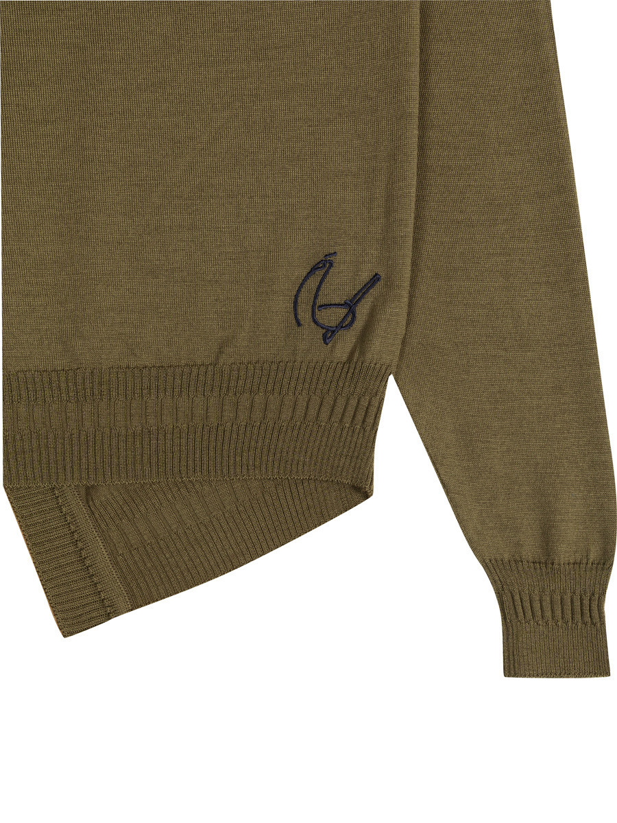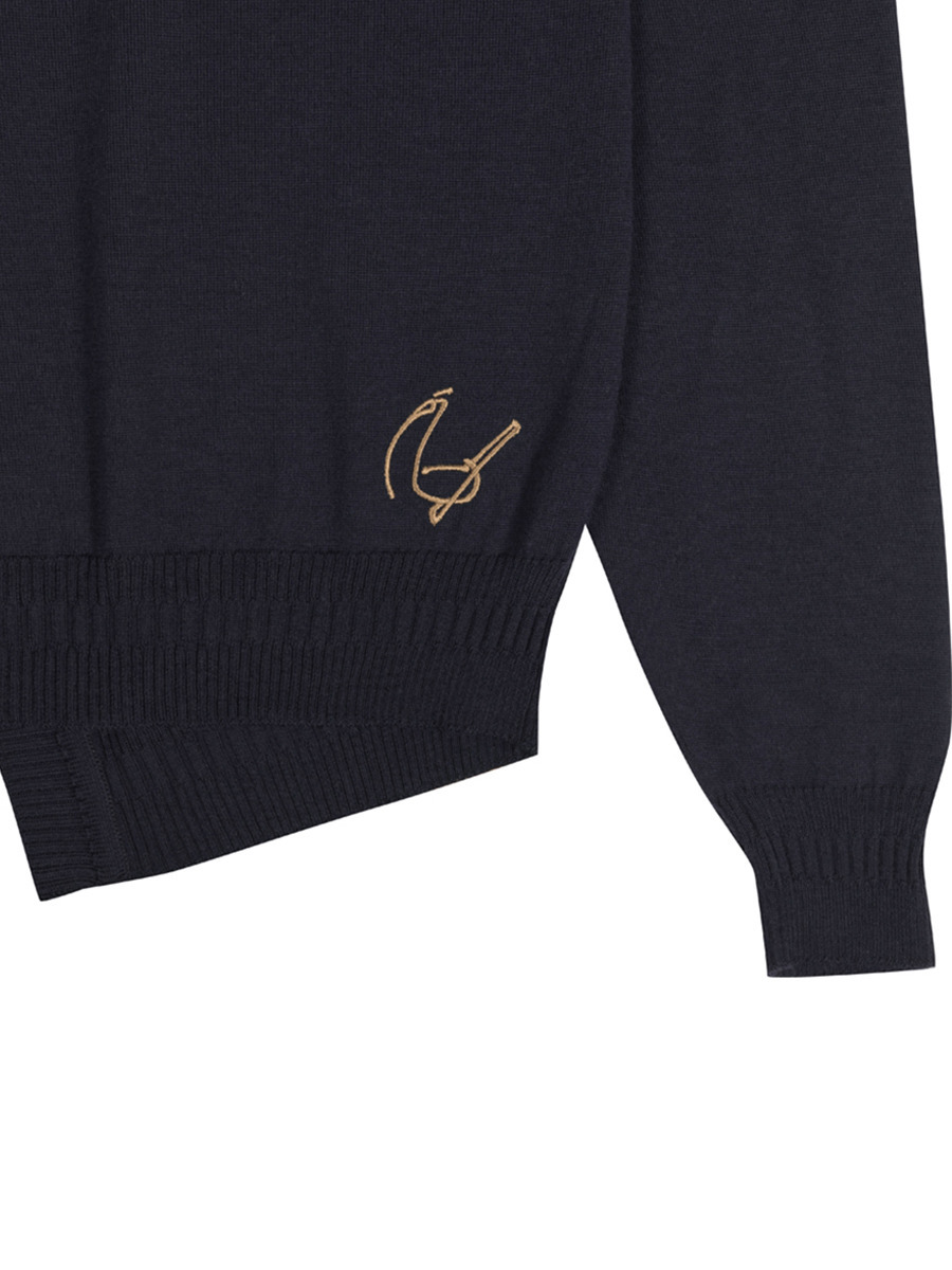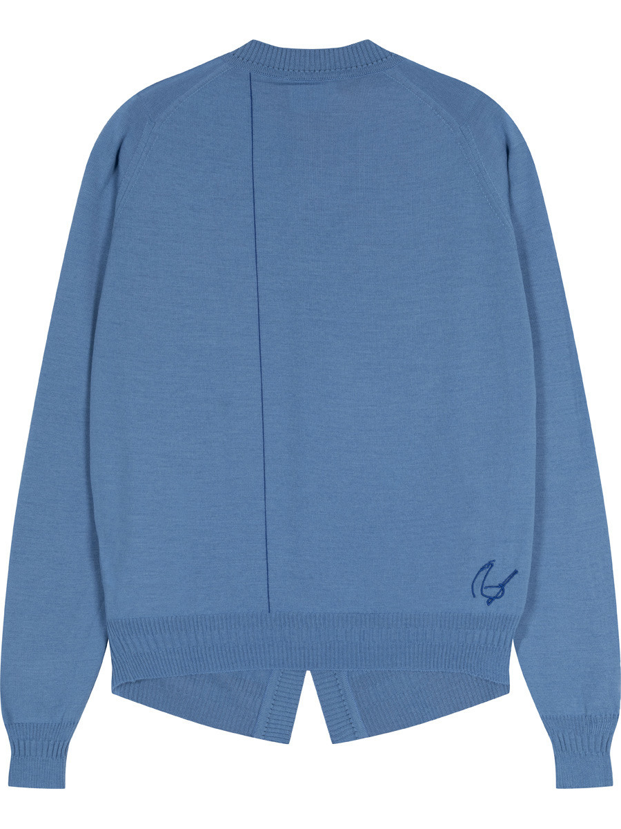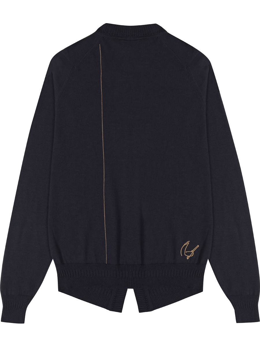彼の父親のスタイルである1940年代をイメージし、現代的にアップデート。特徴的なウエストコート風の裾に、前立てと袖口のワイドリブディテール。スーツとの組み合わせを想定して特別に仕立てられたやや短めでシャープなシルエットは、完成までに数十回の試作を重ね、トラウザーのライン上に優雅なドレープを描きながら完璧に収まります。