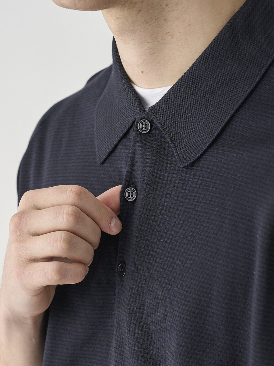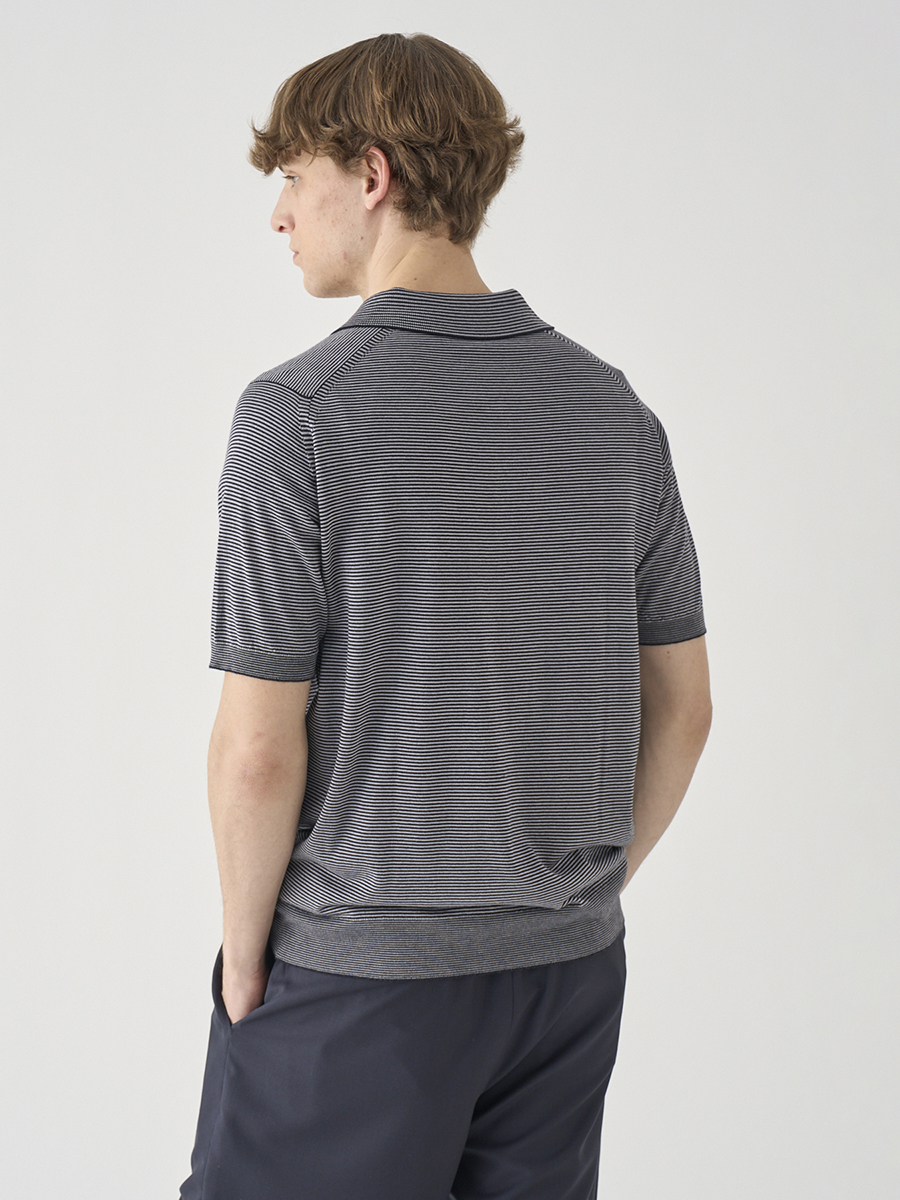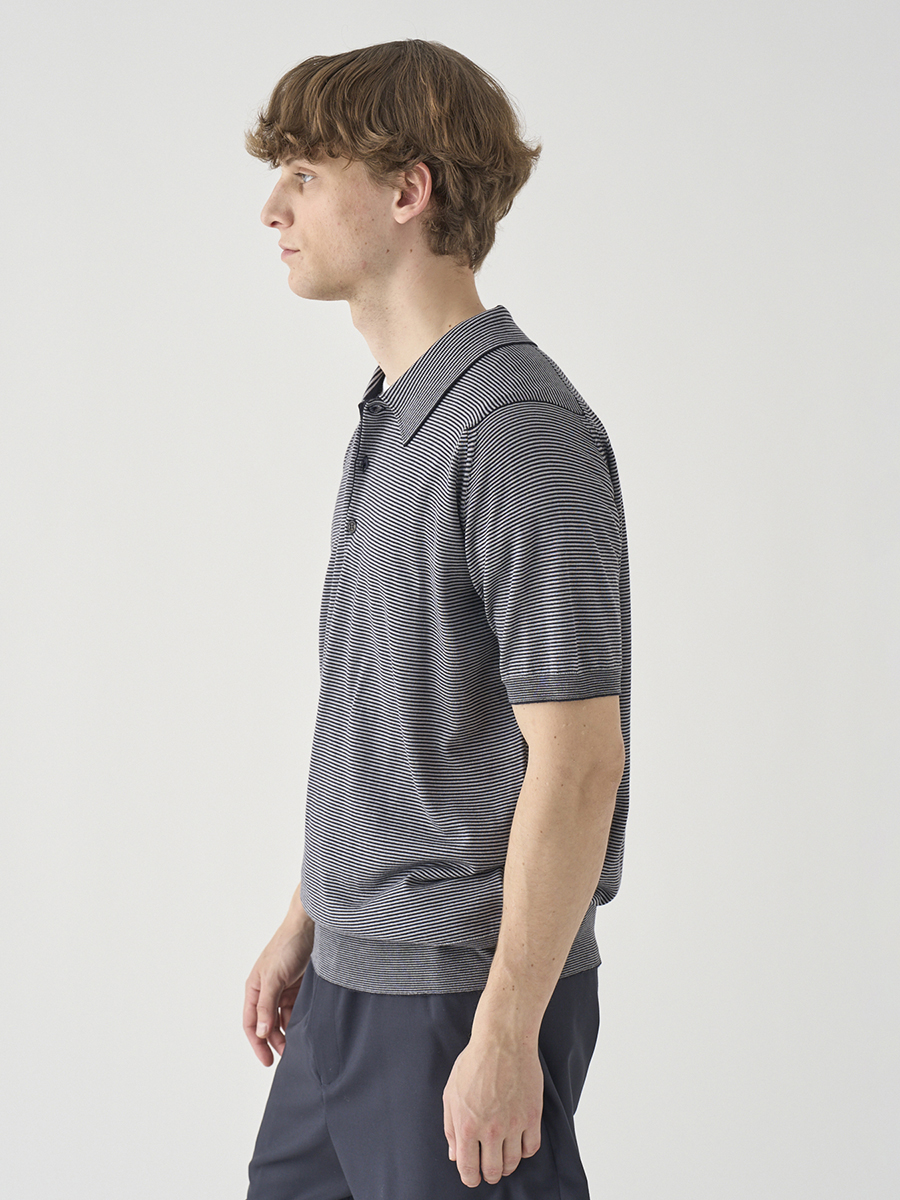 2026年のシーズンコンセプトを表現したマイクロボーダー柄ニットポロシャツ。一見すると無地のようにも見えるごく繊細なボーダー柄は主張しすぎず、コーディネートにさりげないニュアンスを与えます。袖口と裾にはリブをあしらい、ゆとりがありつつも程よくフィットするデザインは、ジャケットやカーディガンとの重ね着にも。カットソーとは異なる、ニットならではの質感がコーディネートを上品に格上げします。