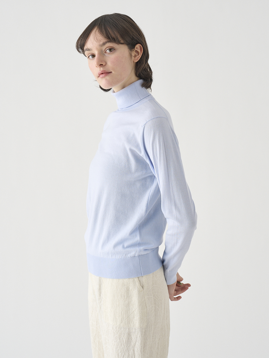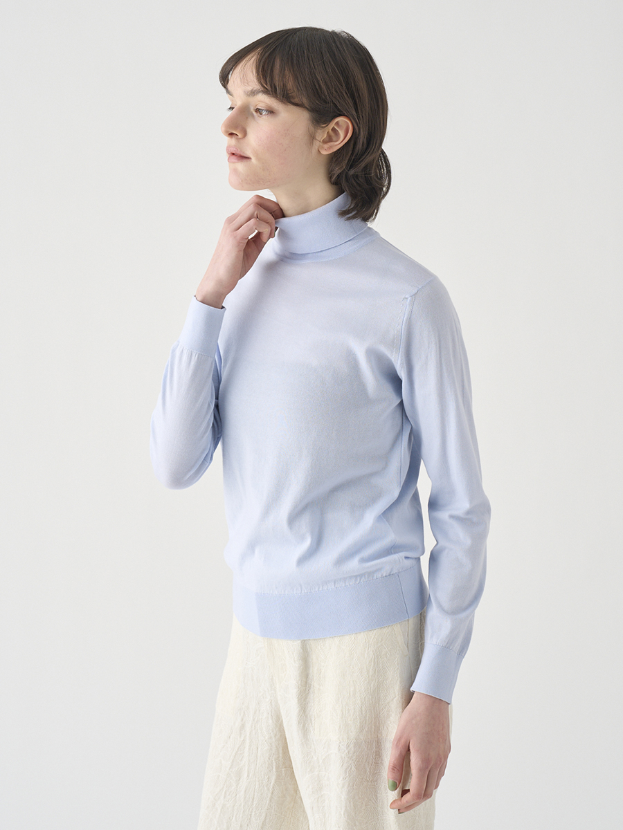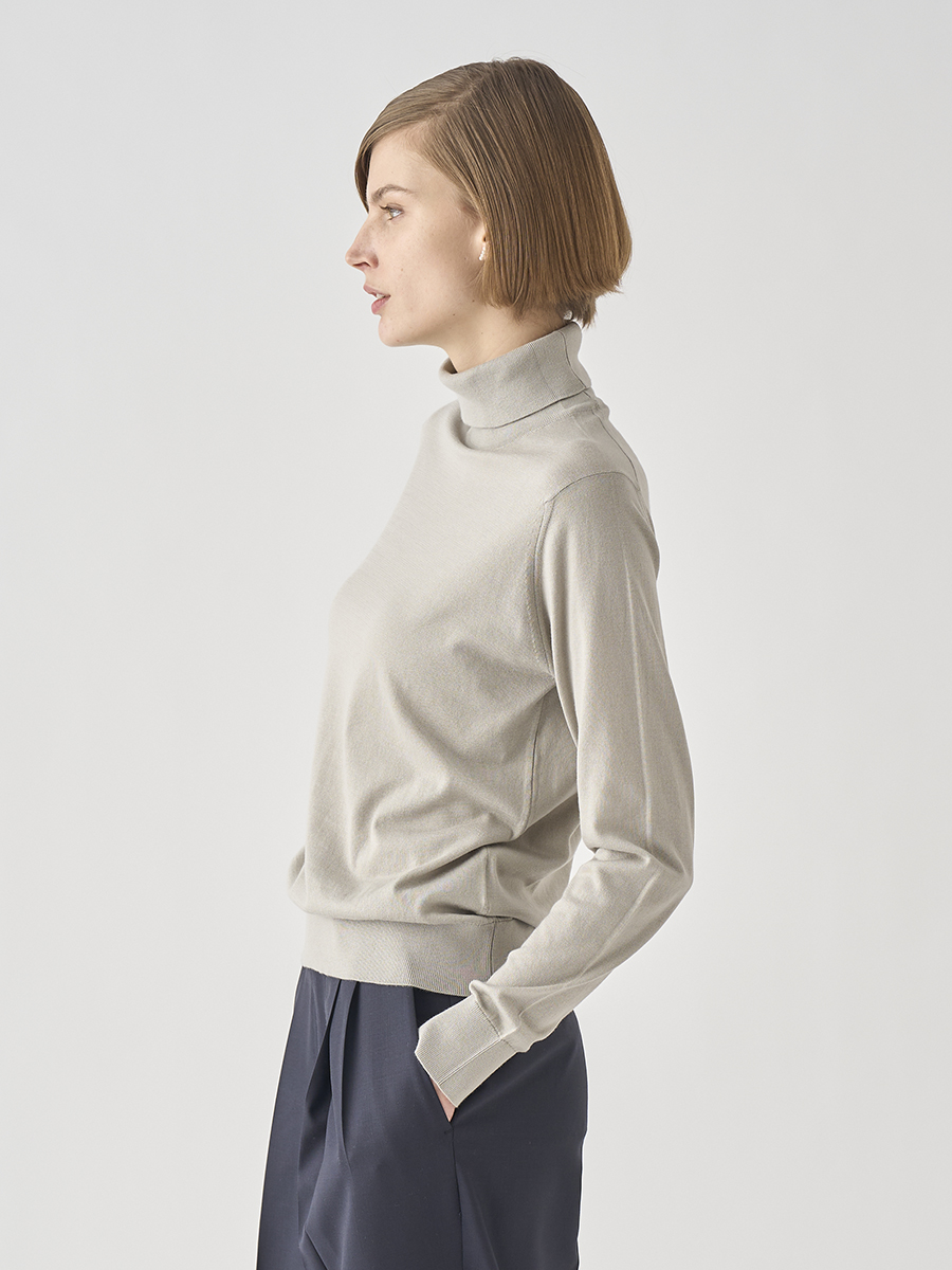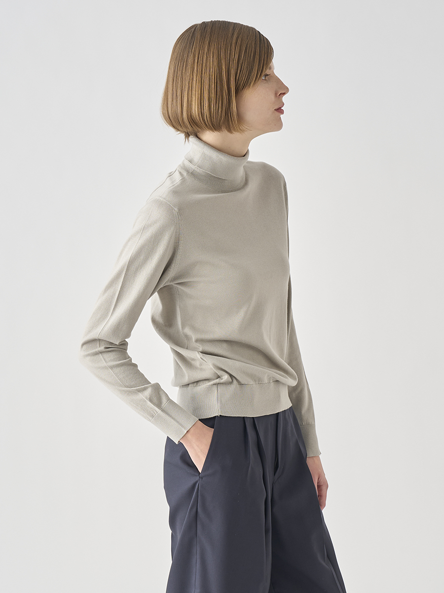 首元に触れる面積の大きいタートルネックだからこそ、なめらかで肌馴染みの良い上質なシーアイランドコットンの素材の良さが引き立ちます。シンプルでミニマルなデザインながらも、タイトすぎない絶妙なサイジング。常に現代的な新しさのある定番アイテムです。
