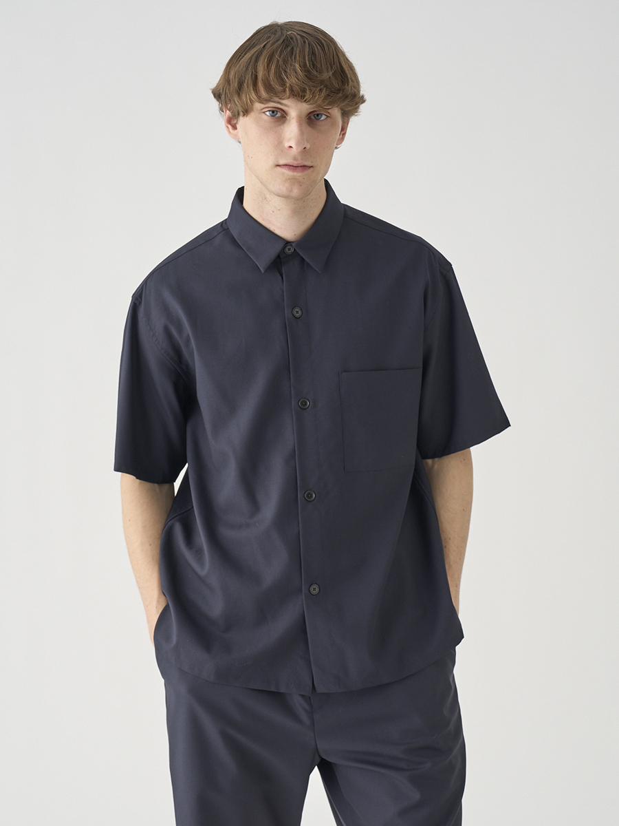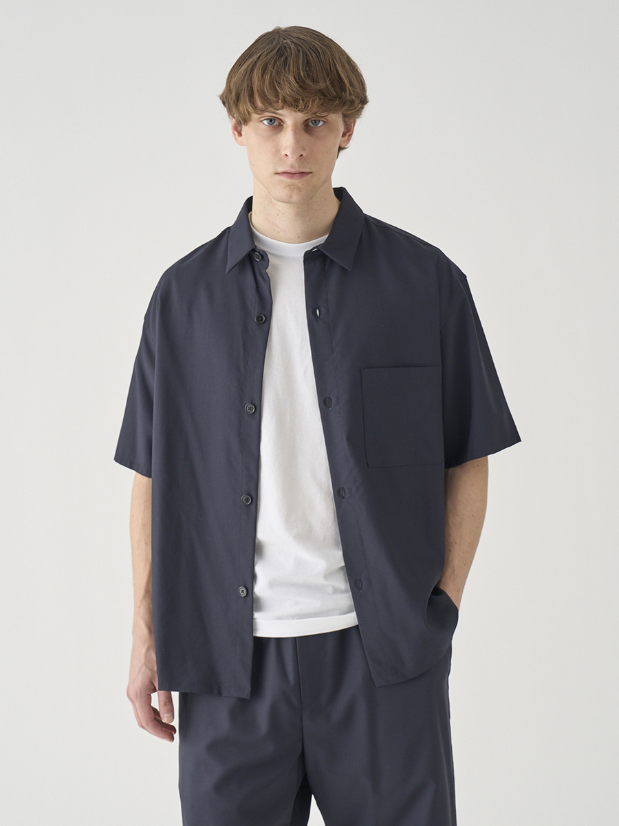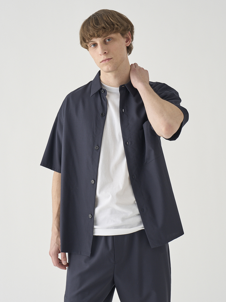 リラックスシルエットのレギュラーカラー半袖シャツ。ニットTシャツの上に軽く羽織るのにも適したフォルムです。