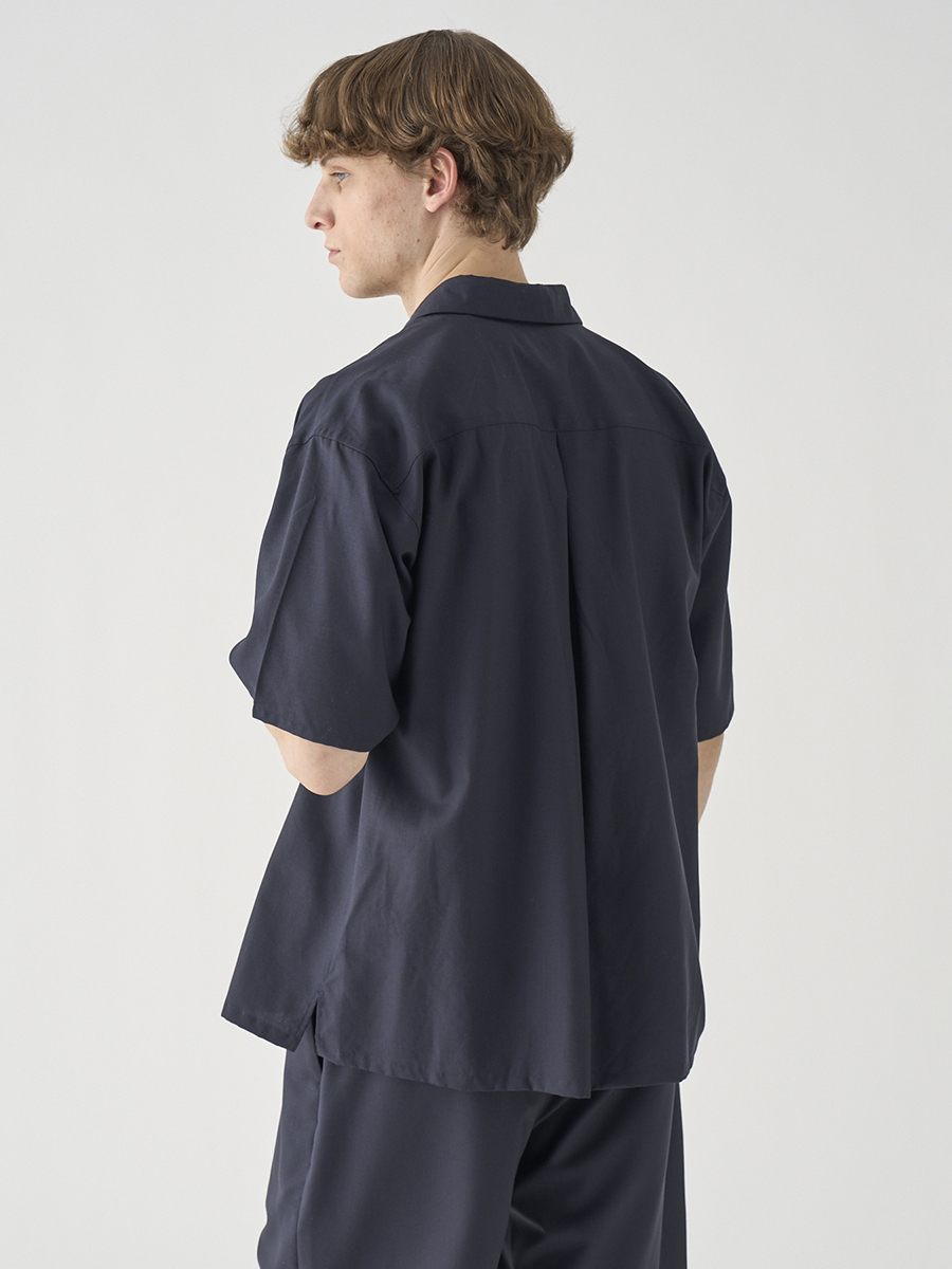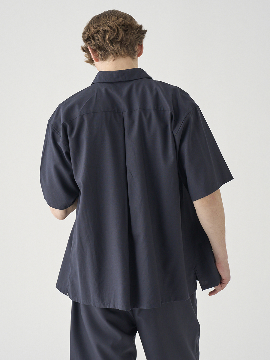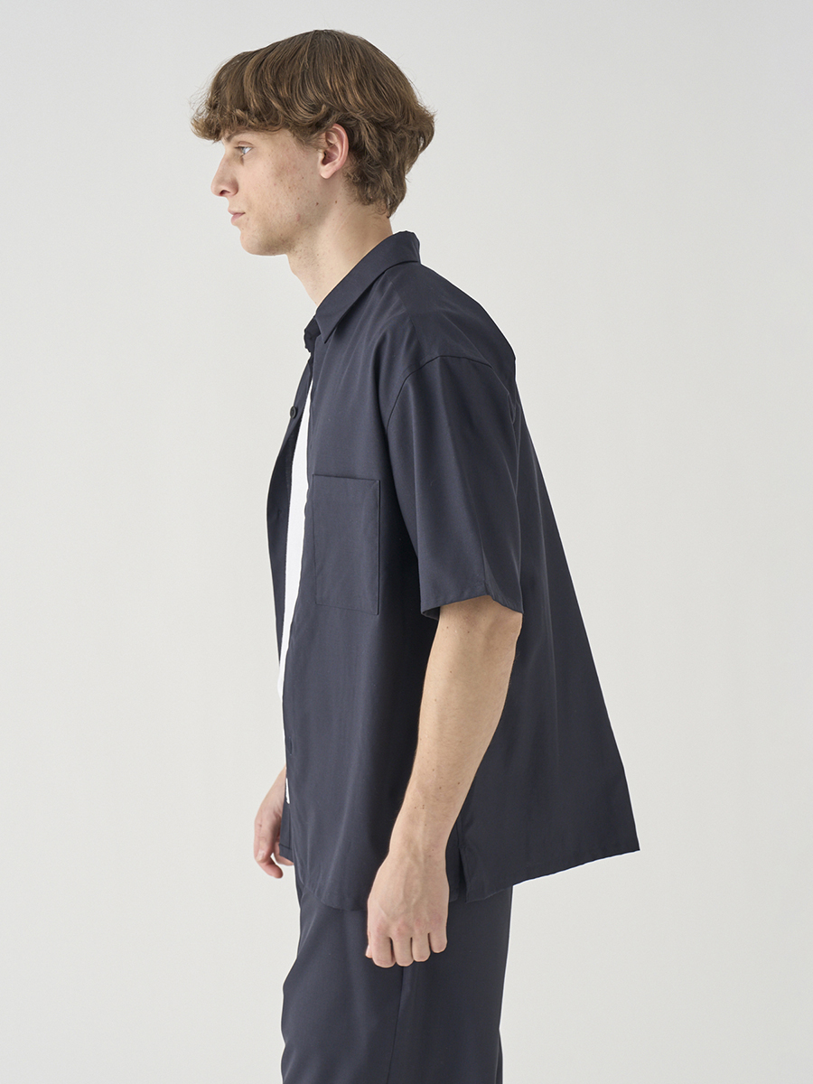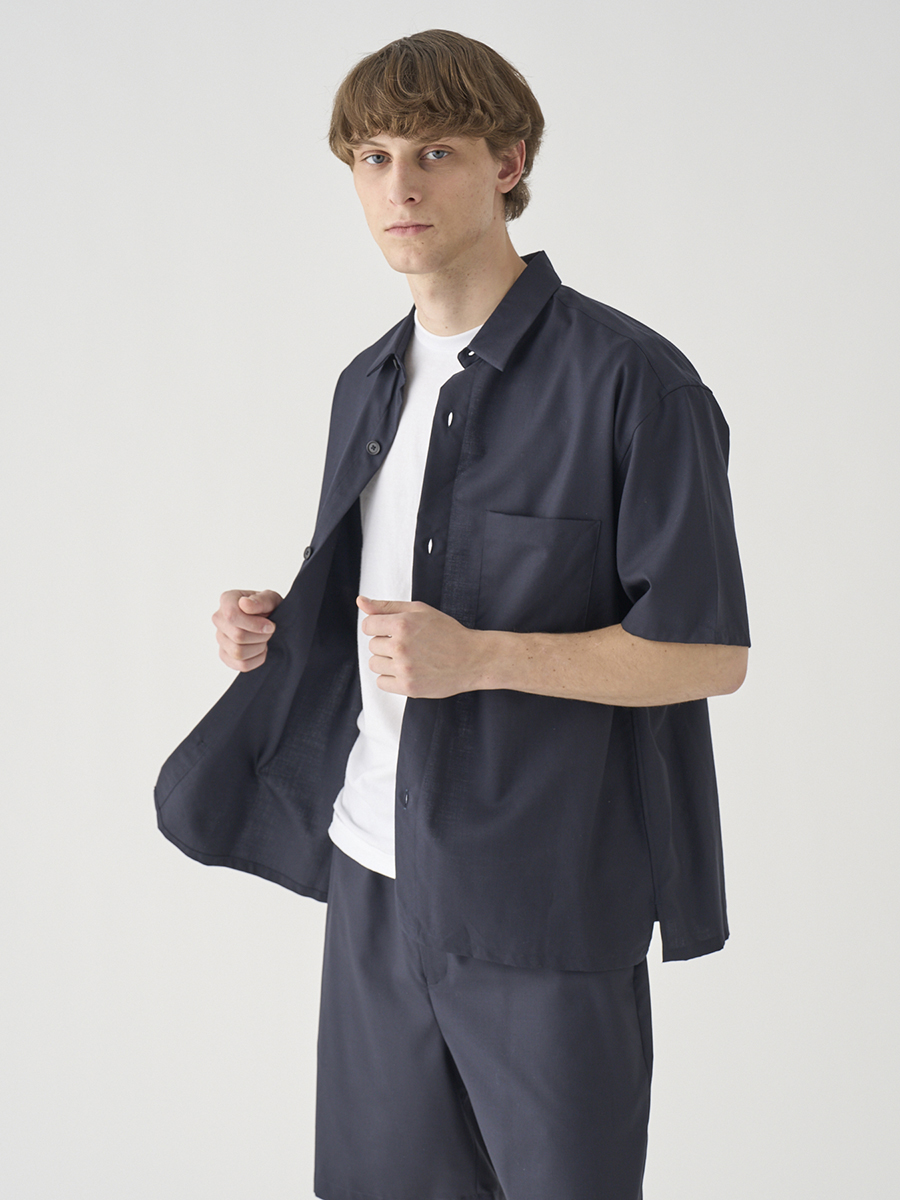 リラックスシルエットのレギュラーカラー半袖シャツ。ニットTシャツの上に軽く羽織るのにも適したフォルムです。