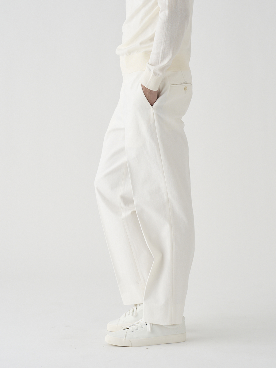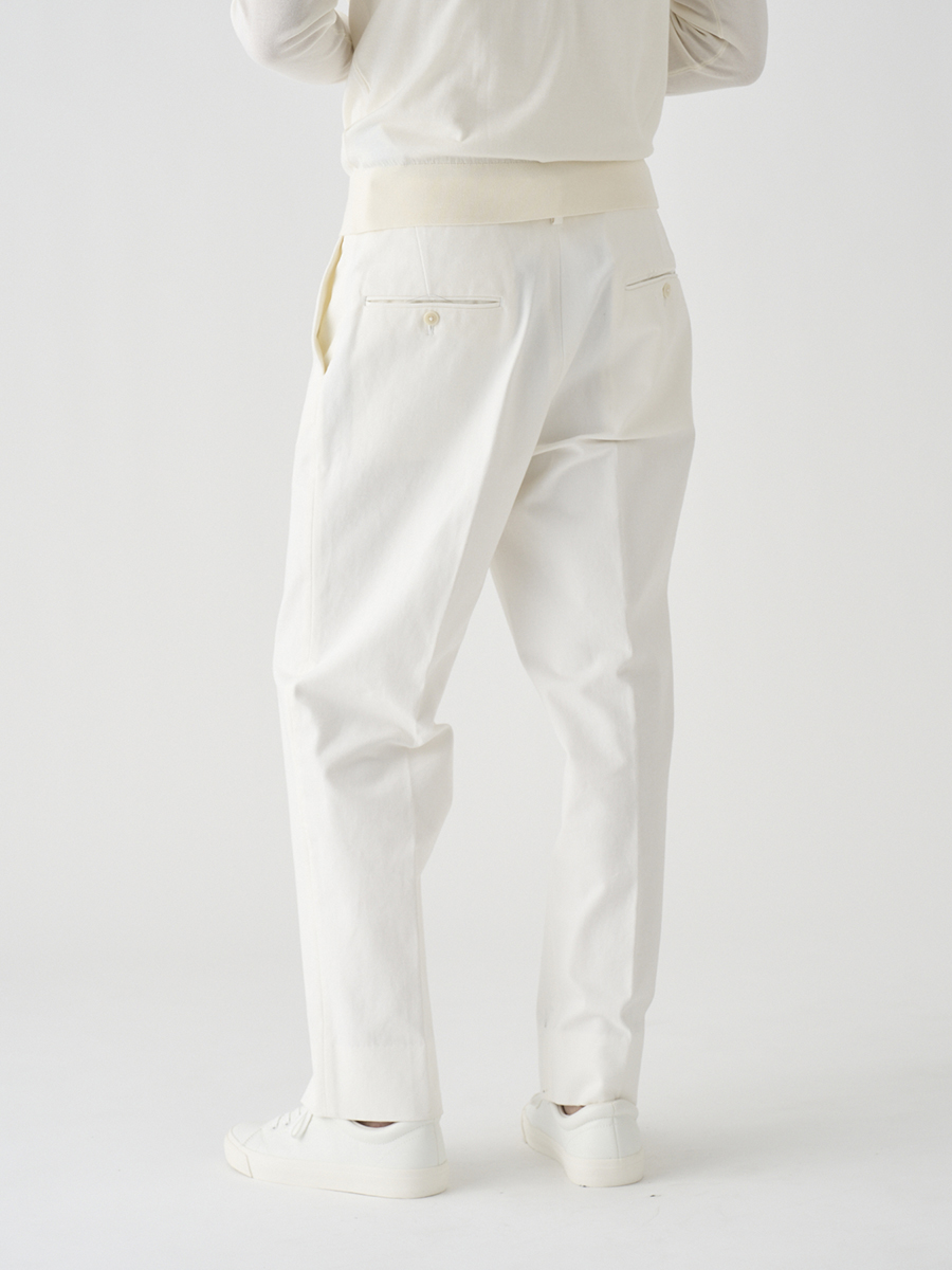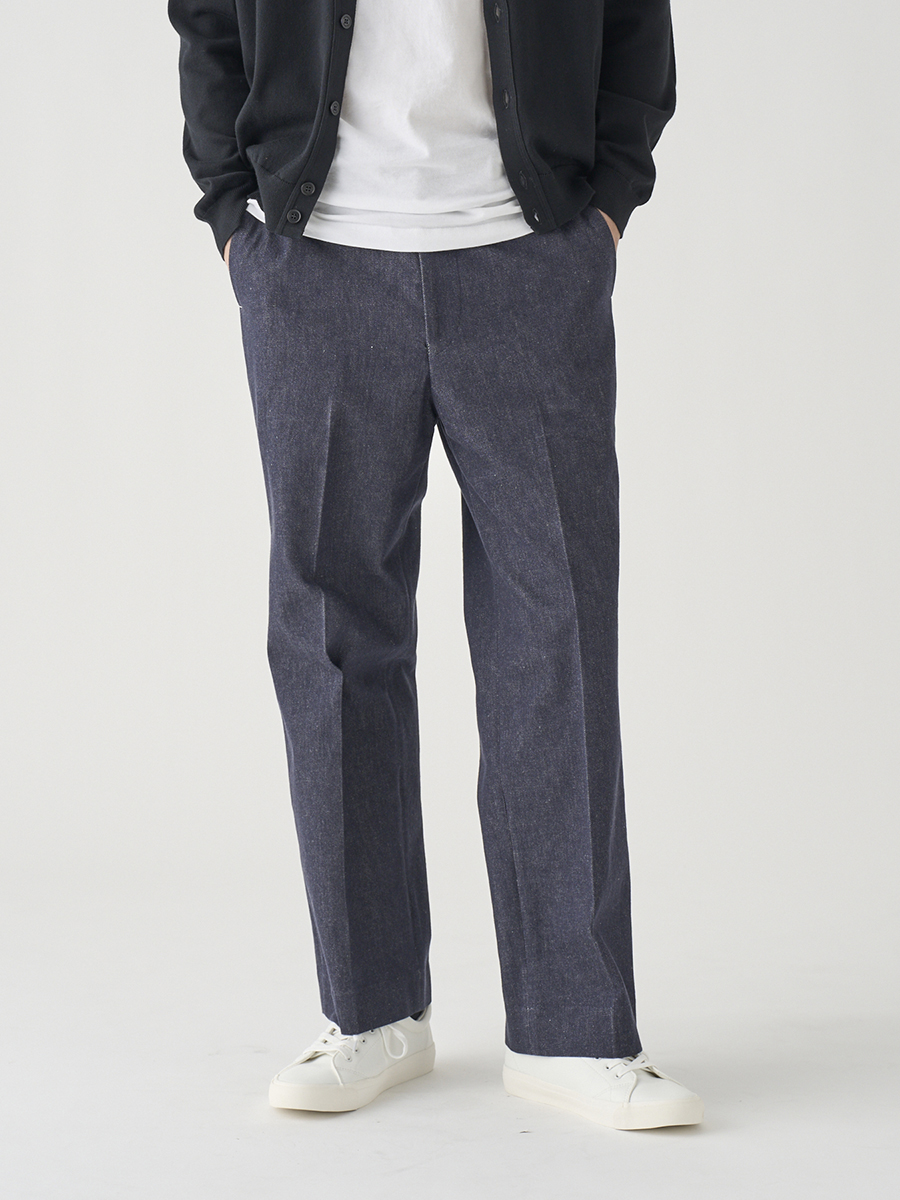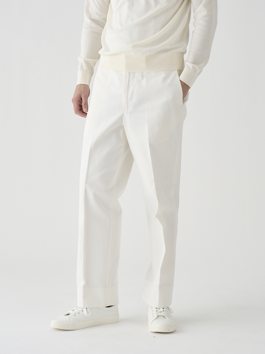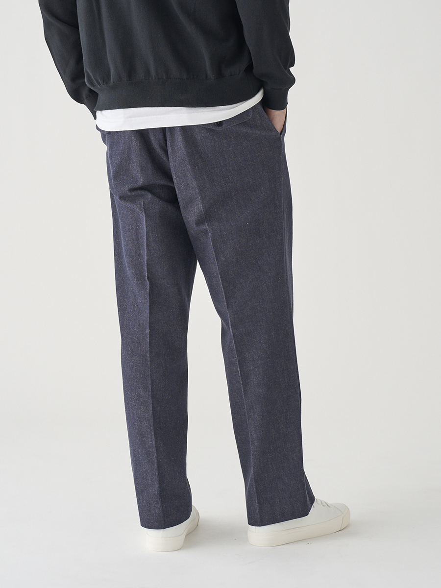 白配色ステッチでカジュアル感を出しながらも、パターンはスラックスベースでドレスパンツのように設計したデニムパンツ。また、マーベルトは別注で作成した太幅で、脇にはタックを入れ、後中心にもスリットを入れることでウエストにゆとりを持たせています。
