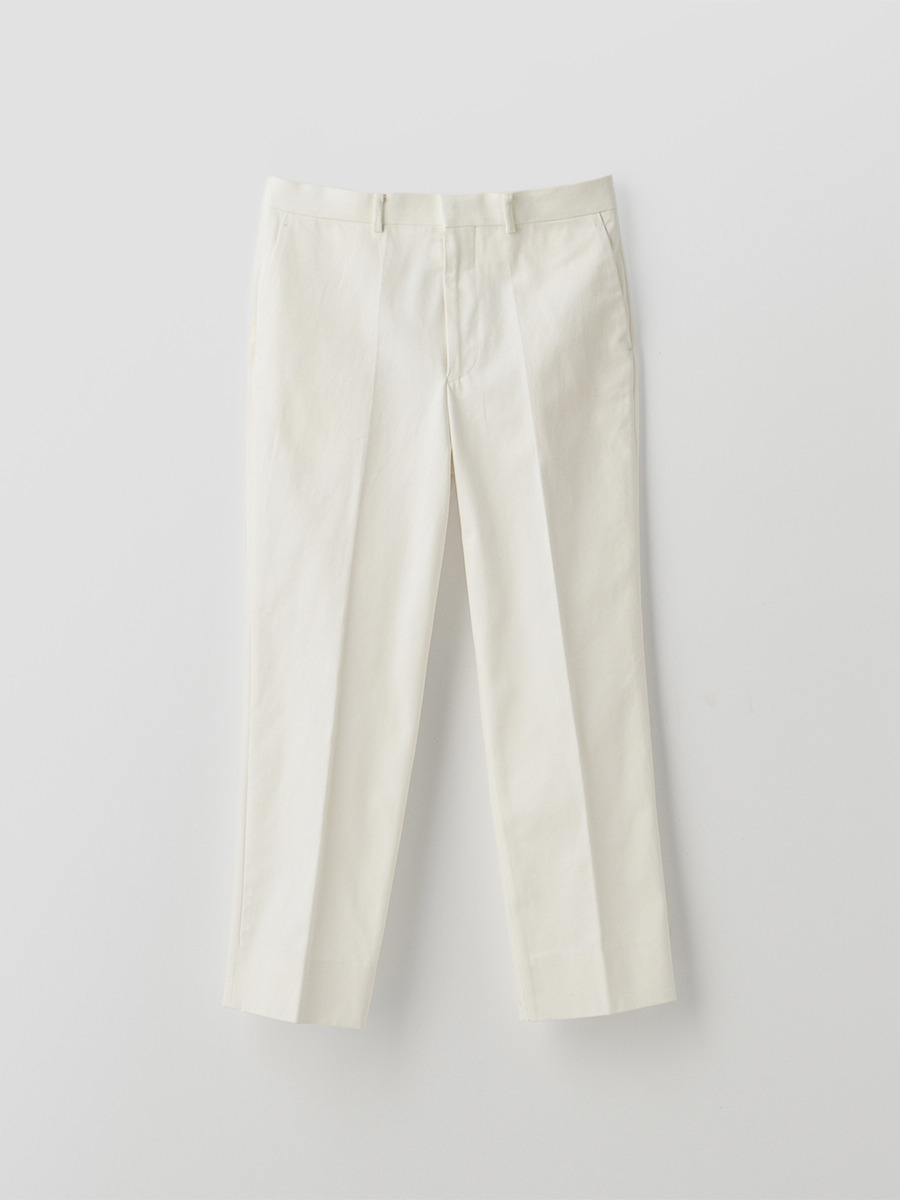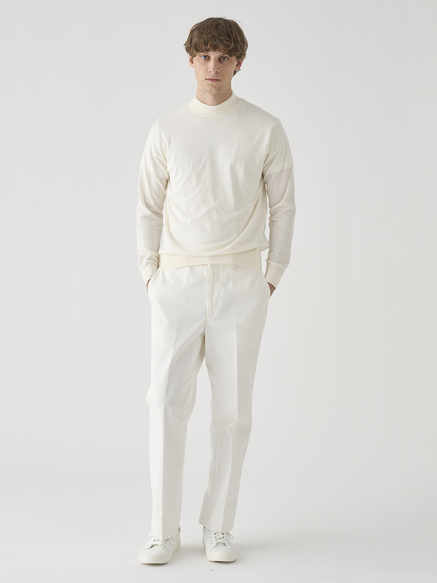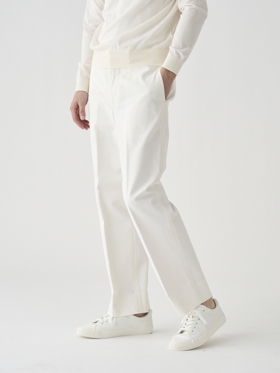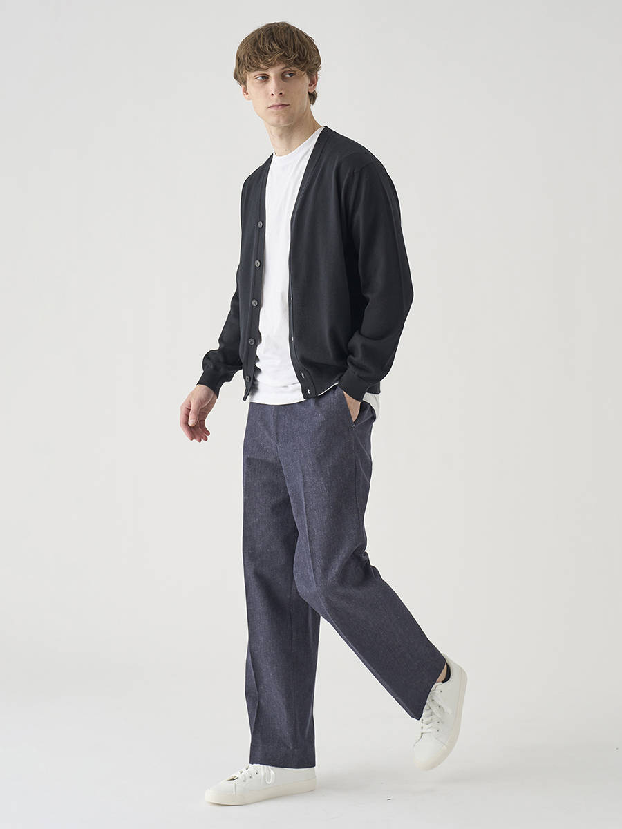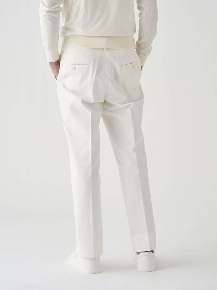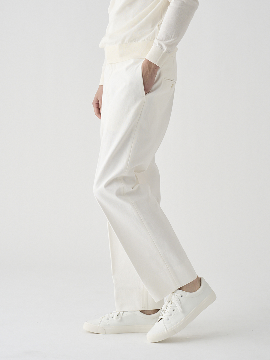 白配色ステッチでカジュアル感を出しながらも、パターンはスラックスベースでドレスパンツのように設計したデニムパンツ。また、マーベルトは別注で作成した太幅で、脇にはタックを入れ、後中心にもスリットを入れることでウエストにゆとりを持たせています。