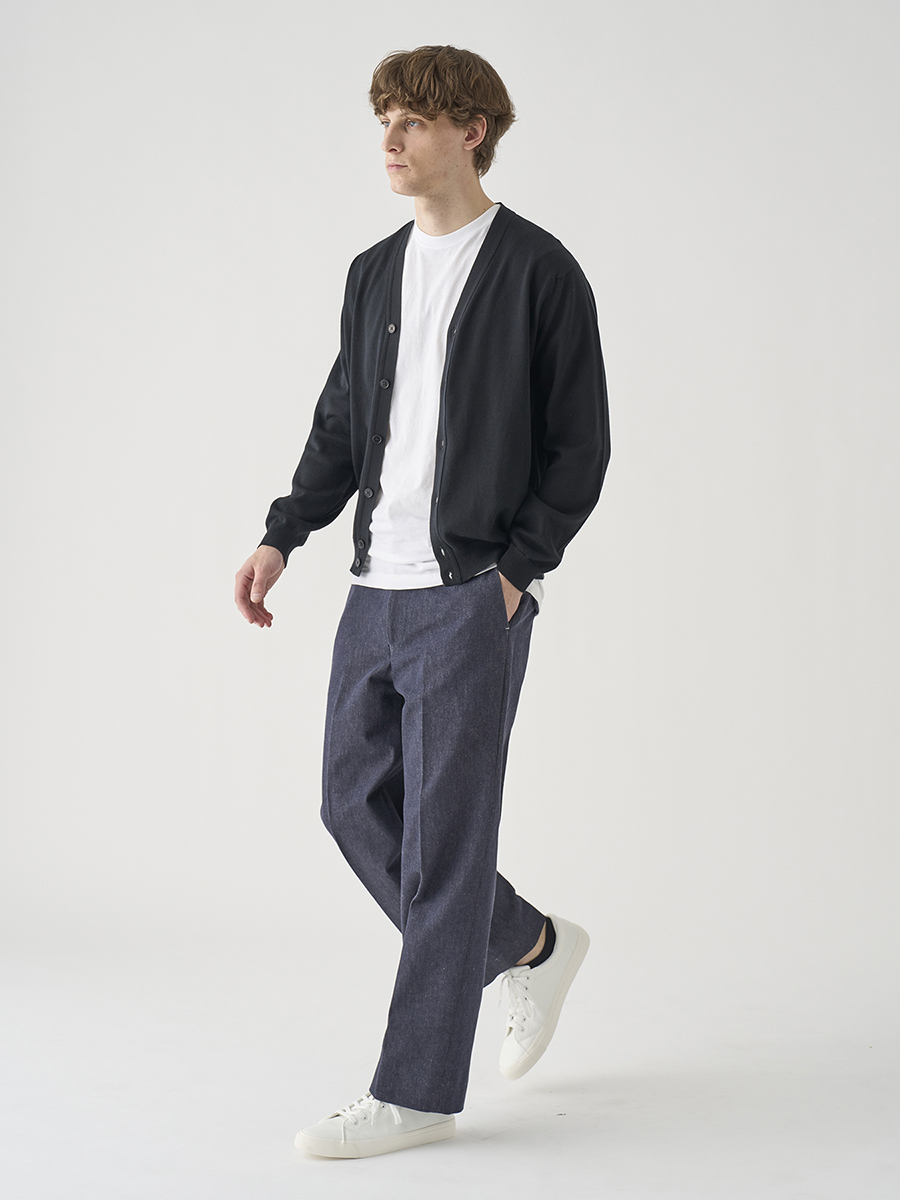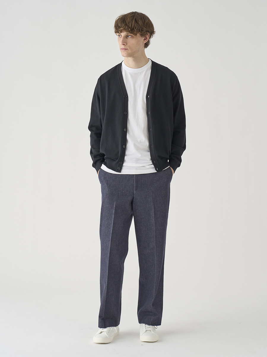 岡山の工場で、糸染め・織布・仕上げまで一貫して丁寧に生産された11.5オンスデニム。インディゴではなく、色落ちしづらい反応染料(リアクティブダイ)を用いた糸染めで、長くきれいな色合いを保てるのが特徴です。
