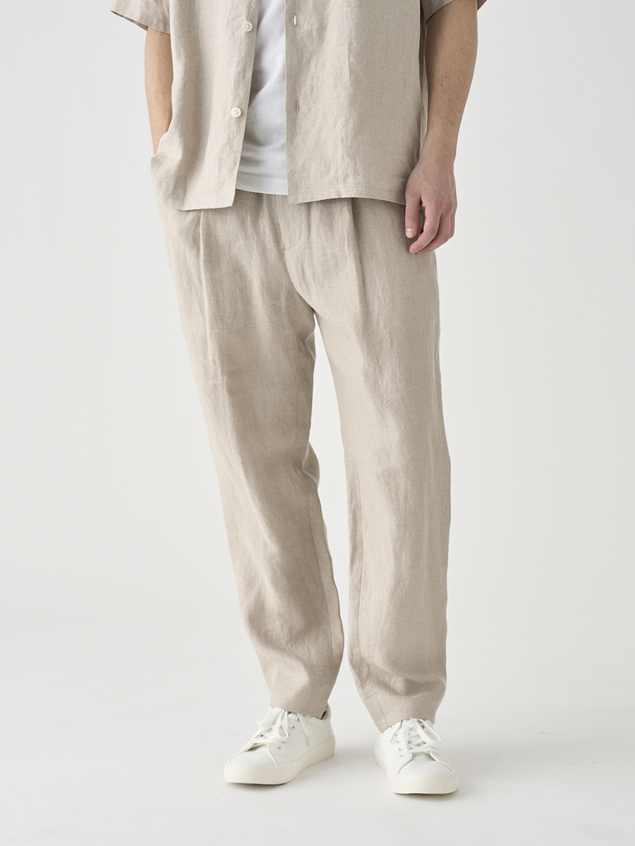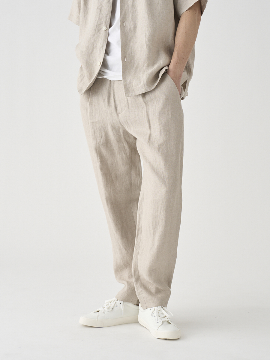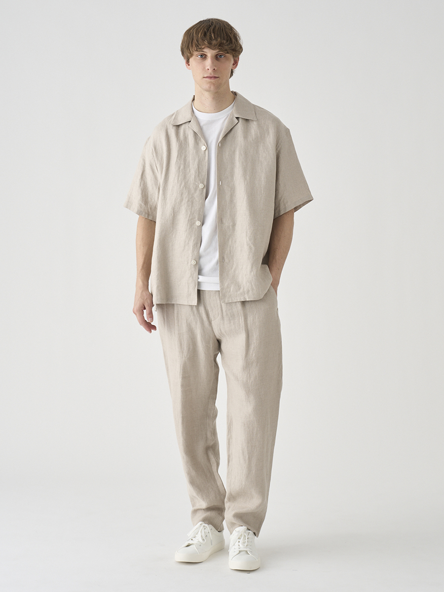 原料にFrench Linenを使用し、織りから加工までを日本国内で行っている「Japan Linen」を採用。C.C Finishという加工を施す事により、繊維を優しく叩きほぐし、ソフトでふっくらとした洗いざらし風の着心地の良い素材に仕上がります。