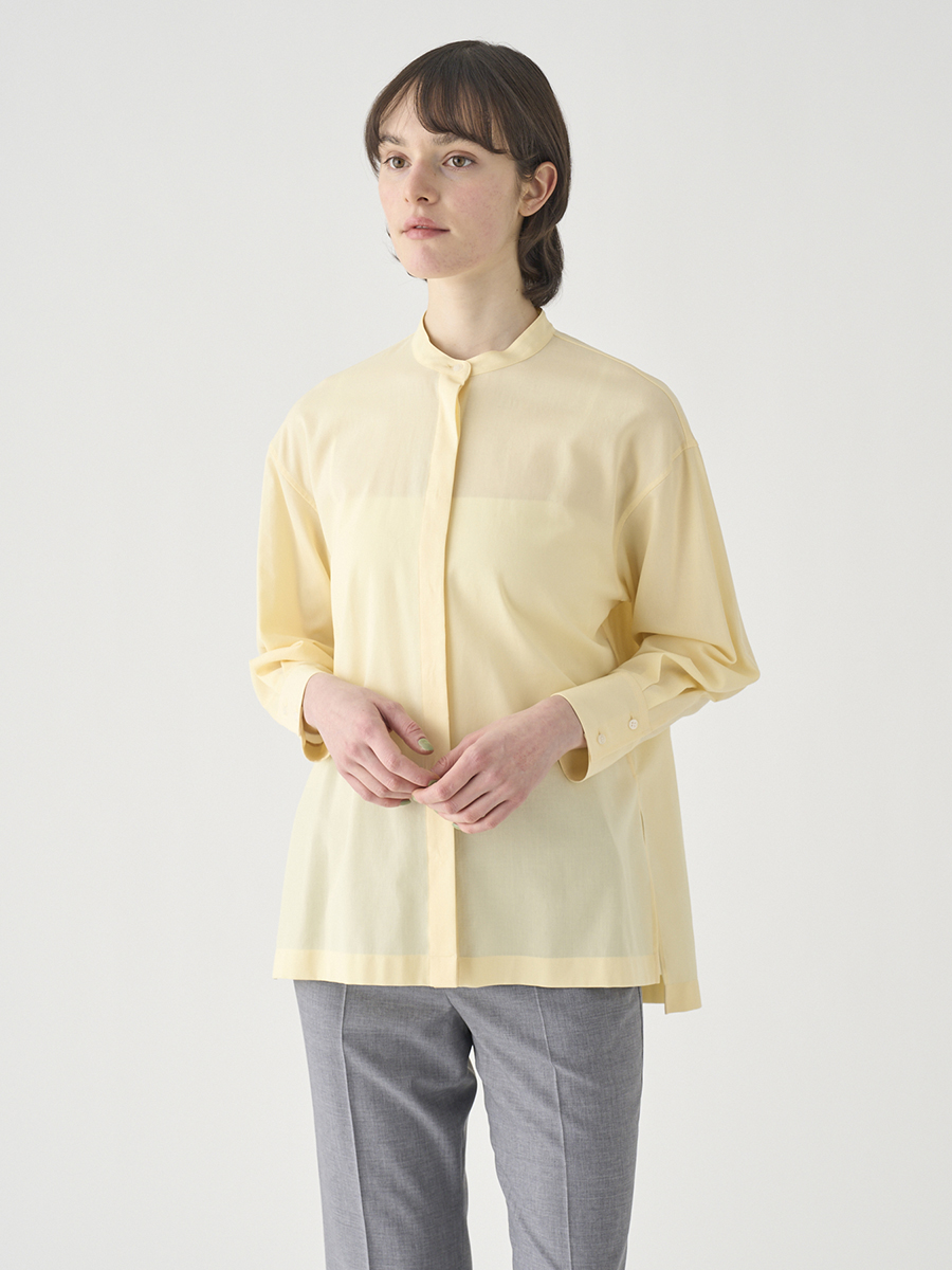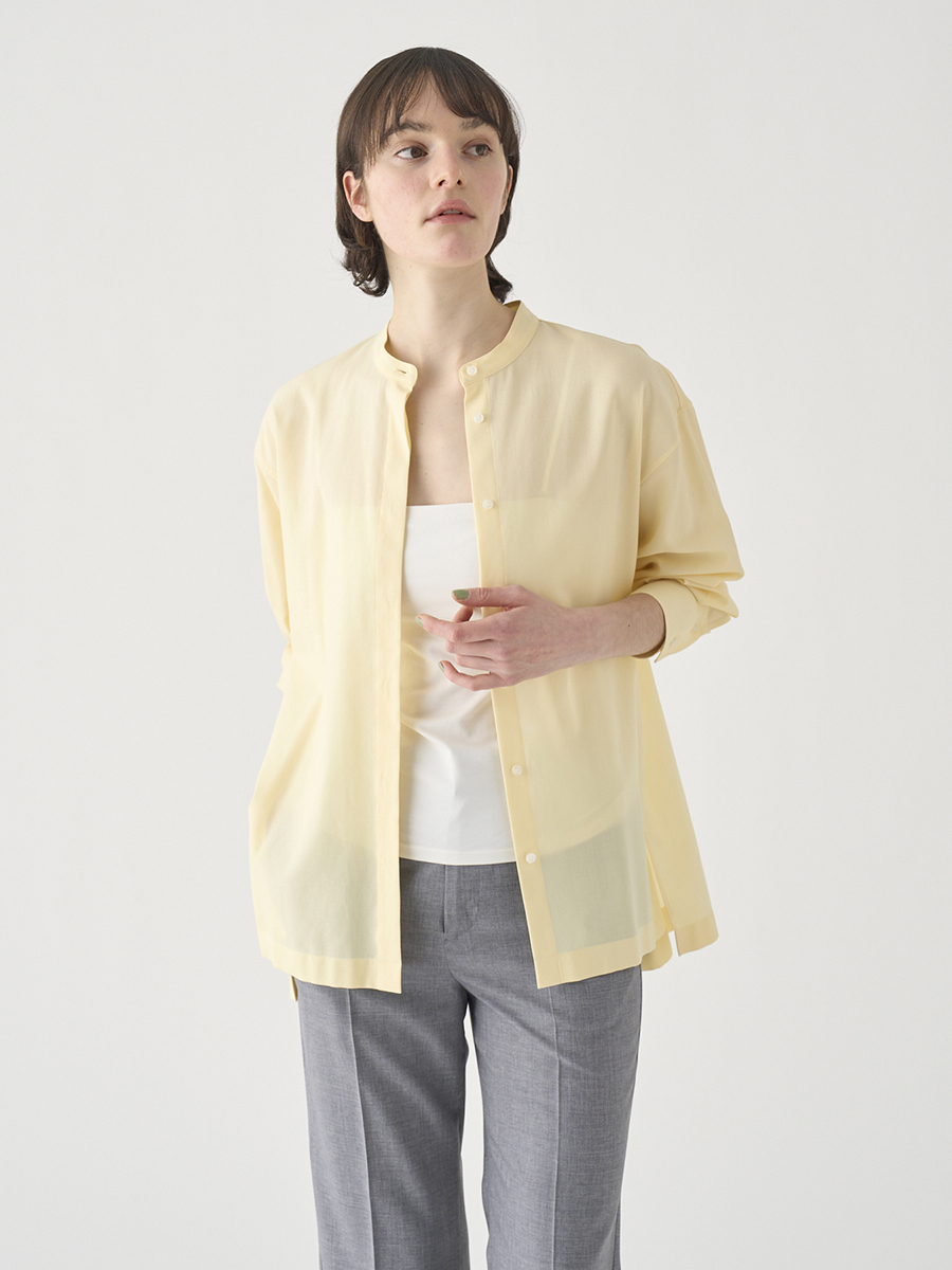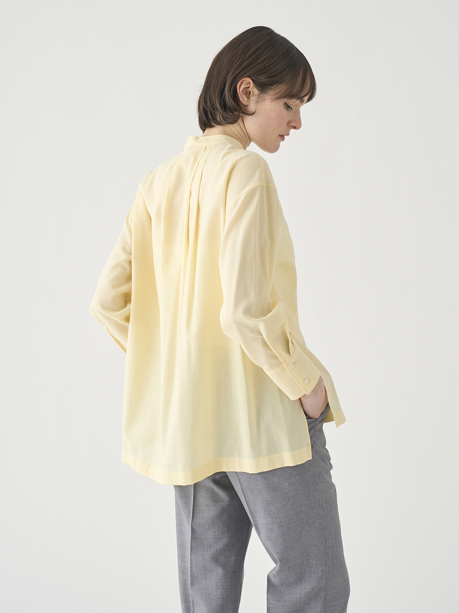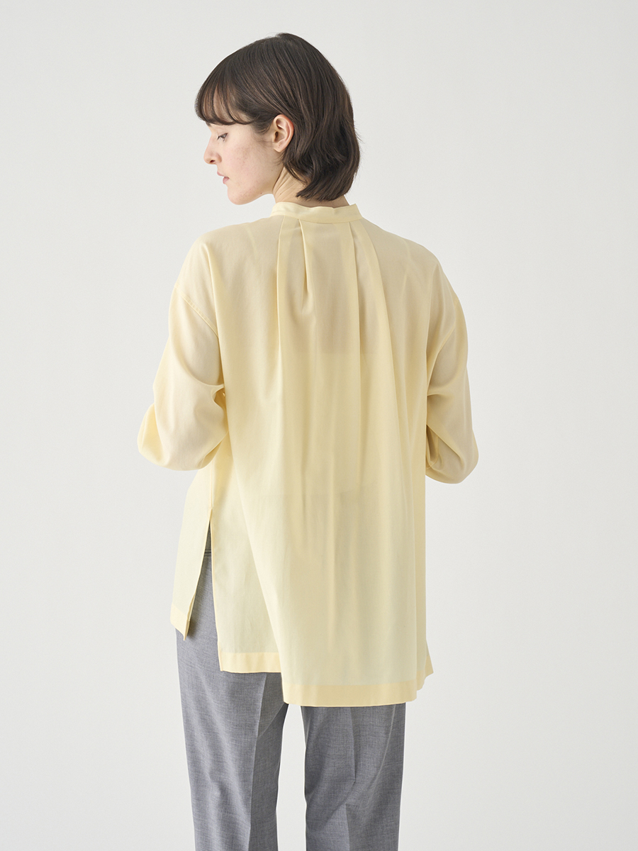 マニッシュなスタンドカラーのチュニックシャツ。背中に施した4本のタックが、ふんわりとした優しいボリュームを生み出します。ややシアーな質感が軽やかさを演出し、羽織としても一枚着としても活躍する汎用性の高い1枚。インナー次第でさまざまな着こなしが楽しめます。