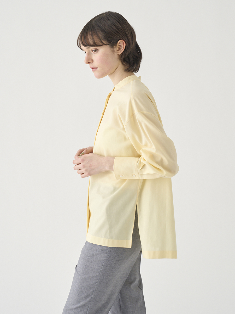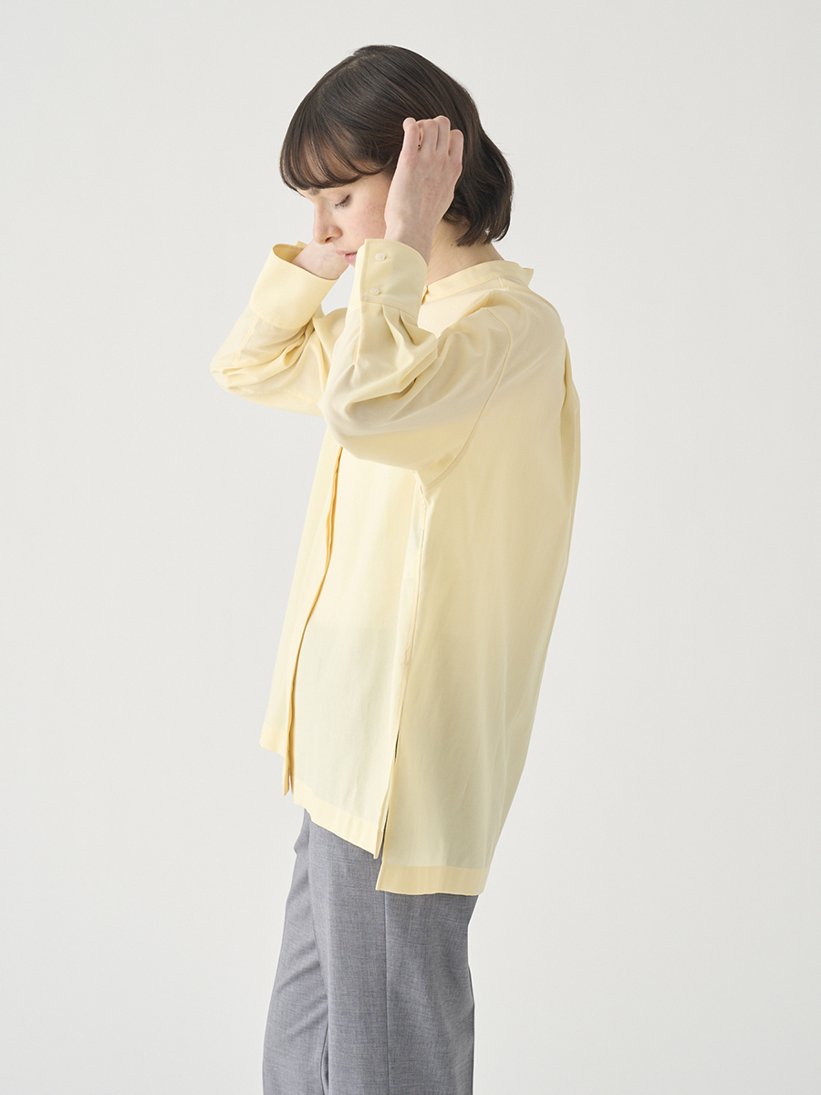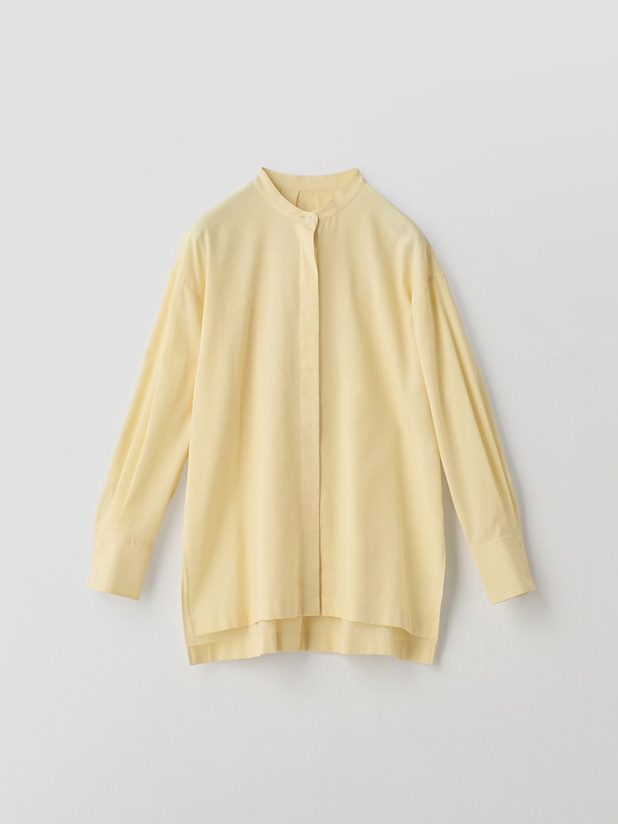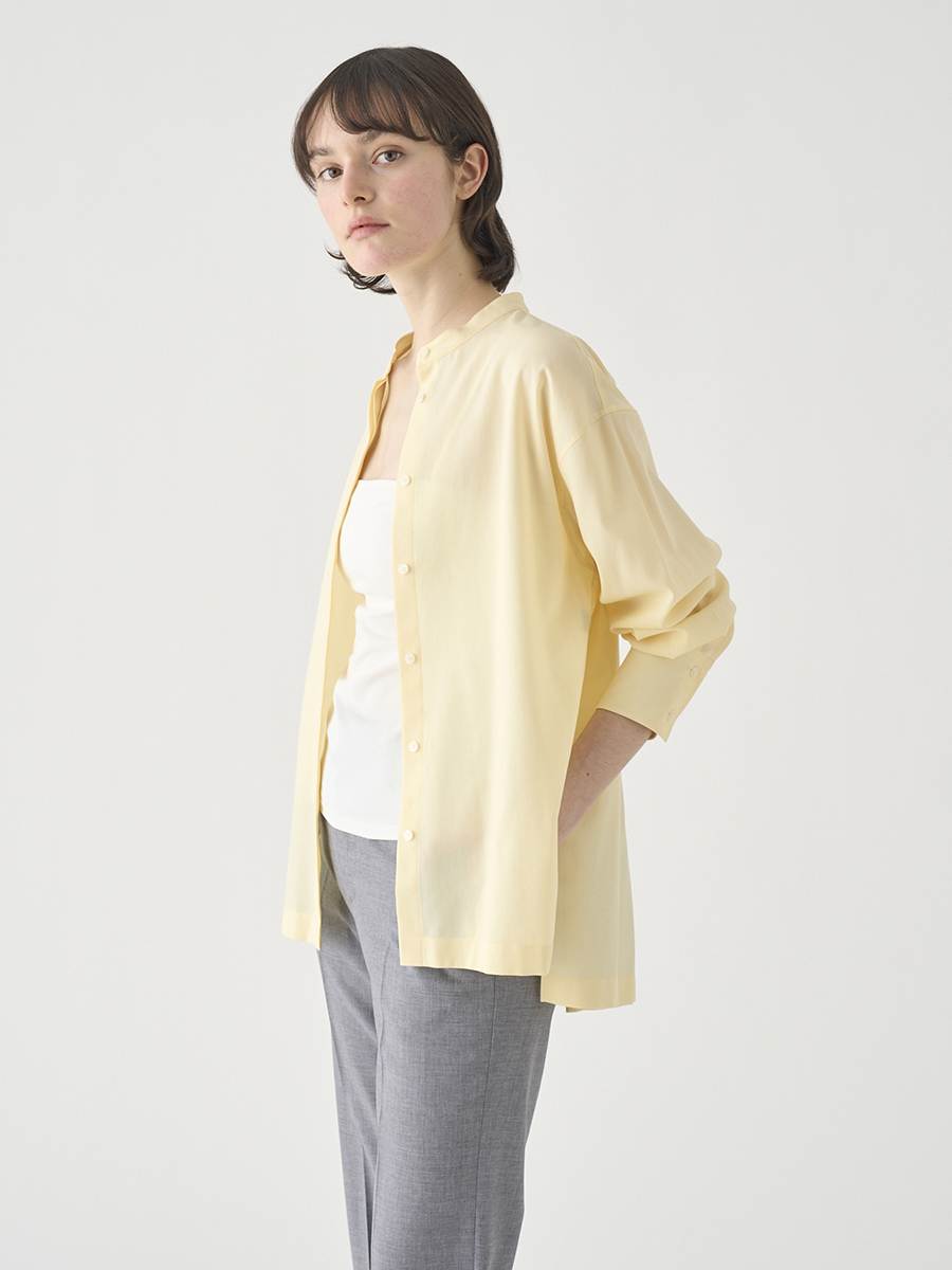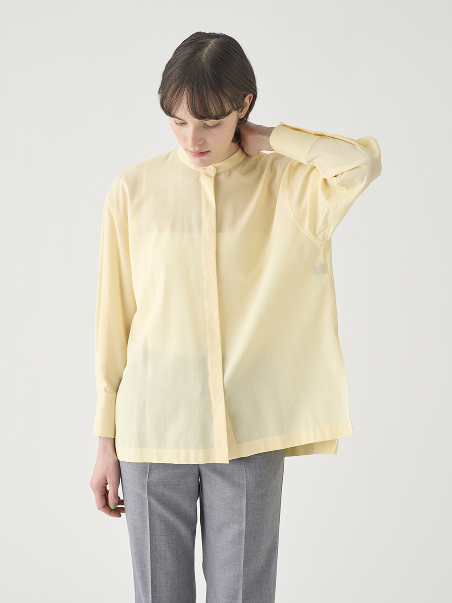 マニッシュなスタンドカラーのチュニックシャツ。背中に施した4本のタックが、ふんわりとした優しいボリュームを生み出します。ややシアーな質感が軽やかさを演出し、羽織としても一枚着としても活躍する汎用性の高い1枚。インナー次第でさまざまな着こなしが楽しめます。