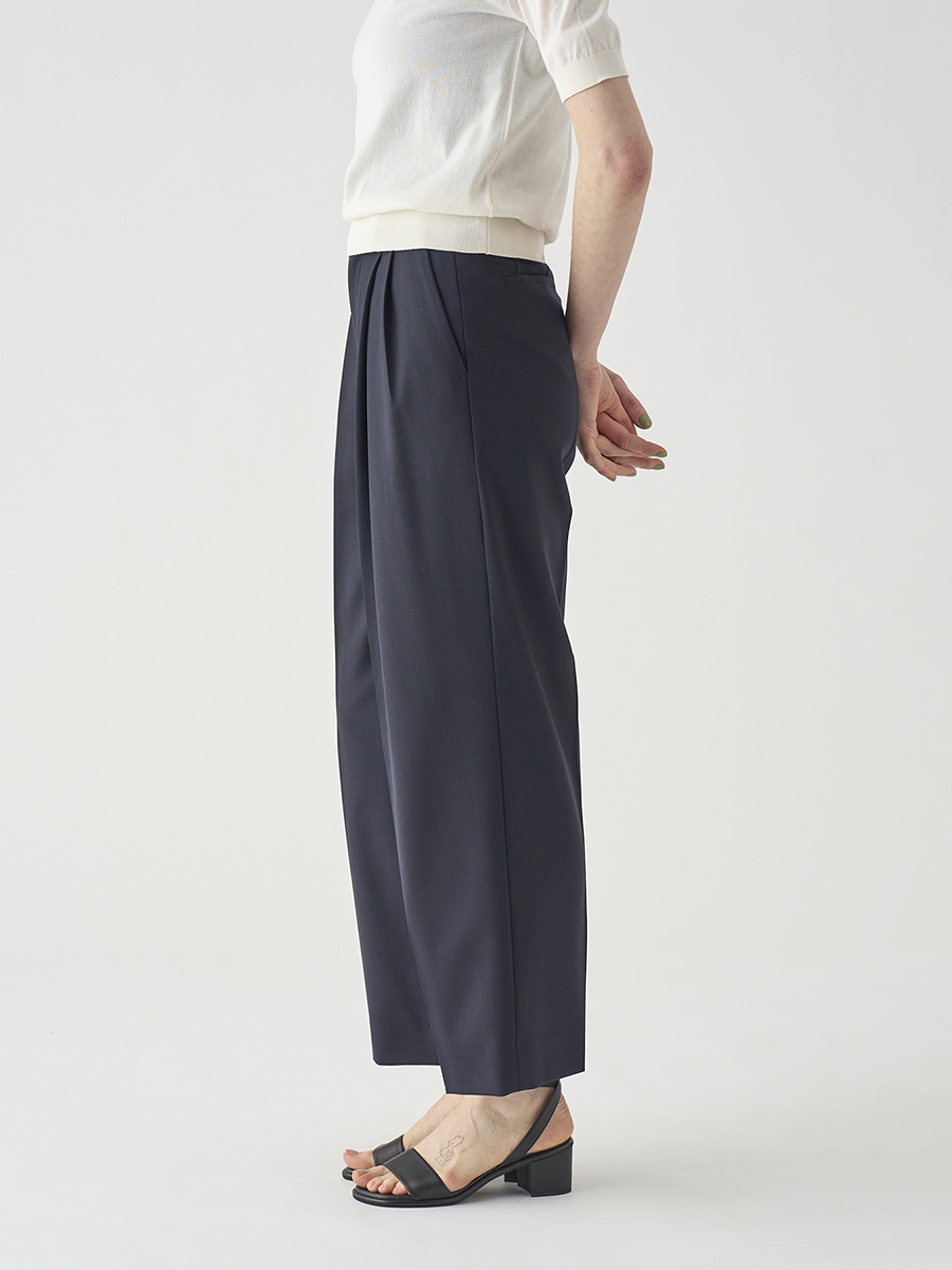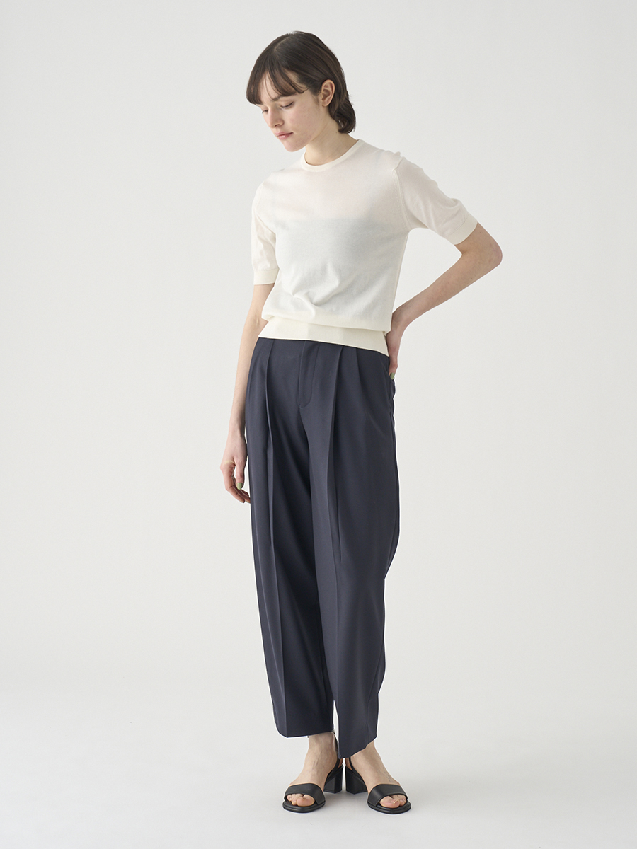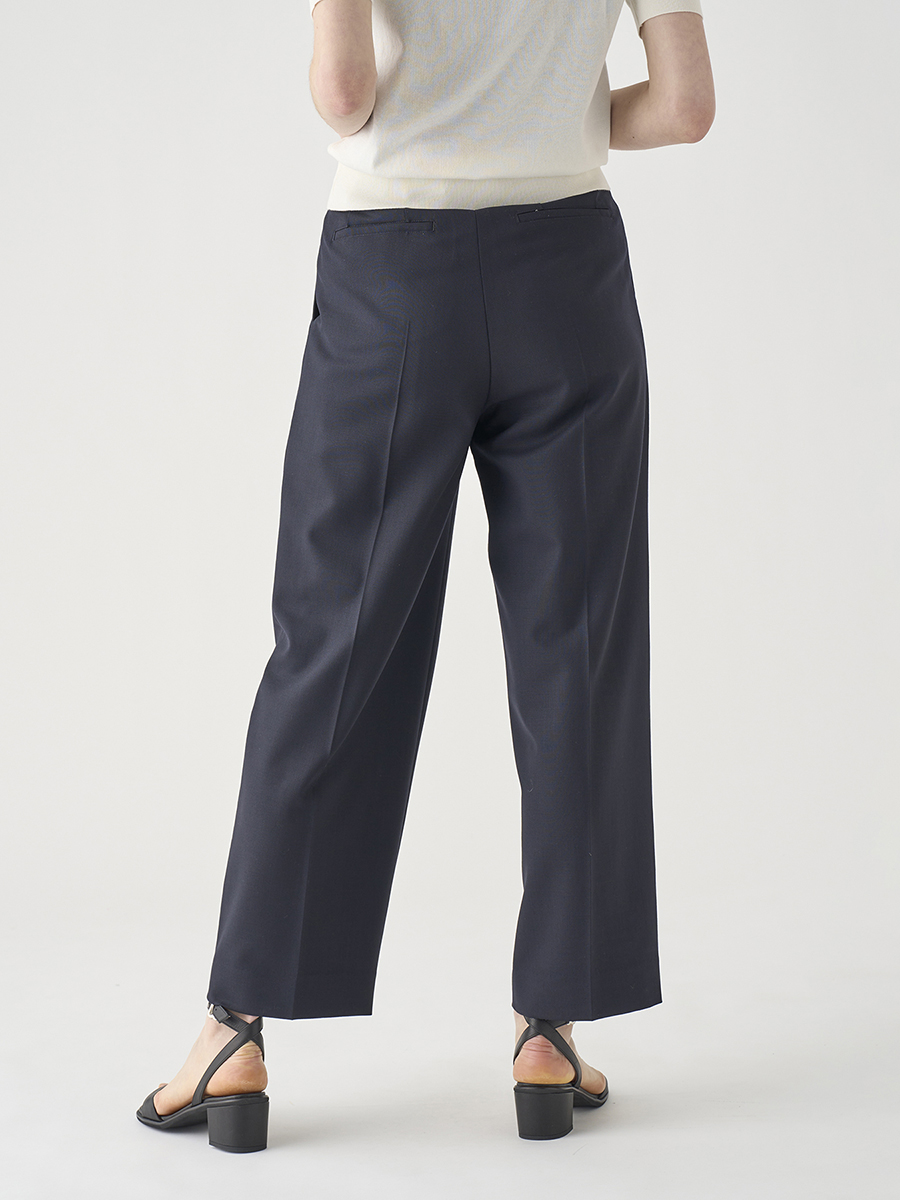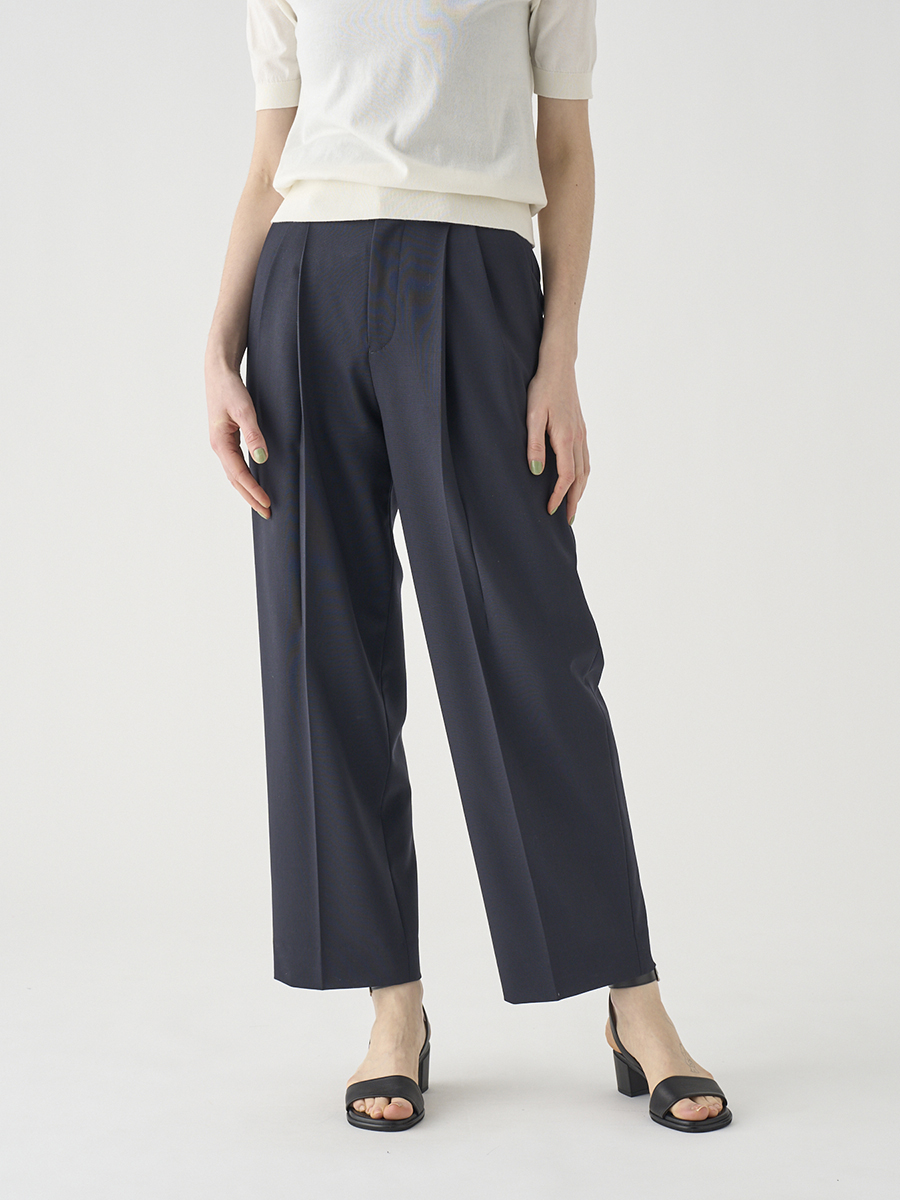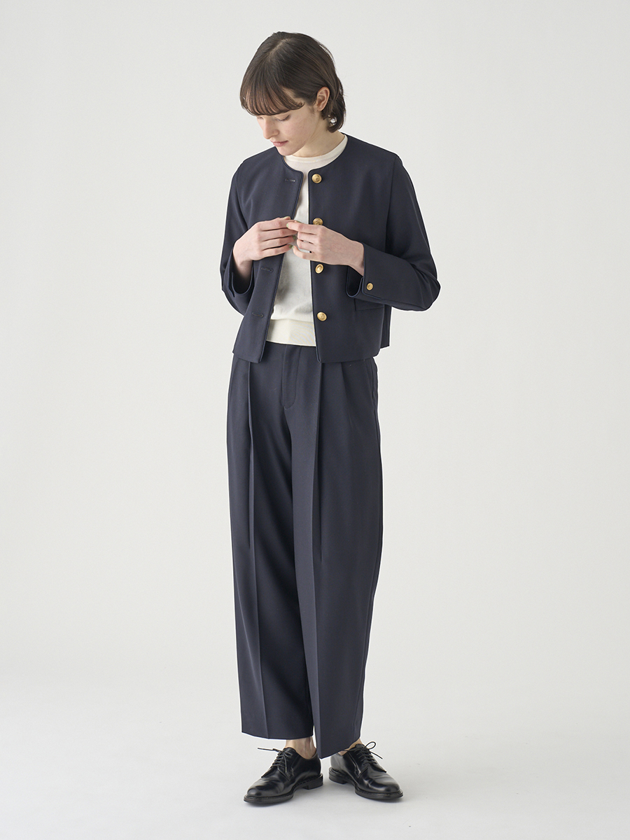 2タックのメンズライクなシルエットに、エレガントな質感の素材を組み合わせ、凛とした女性らしいパンツに仕上げました。同生地のジャケット「FJ151」とのセットアップも。