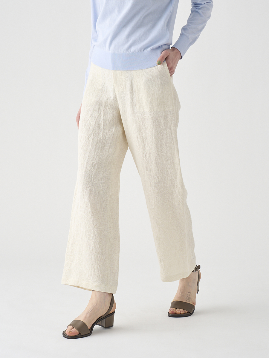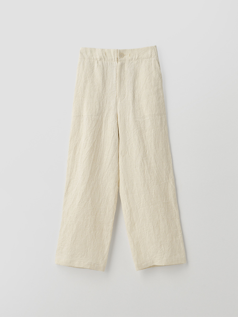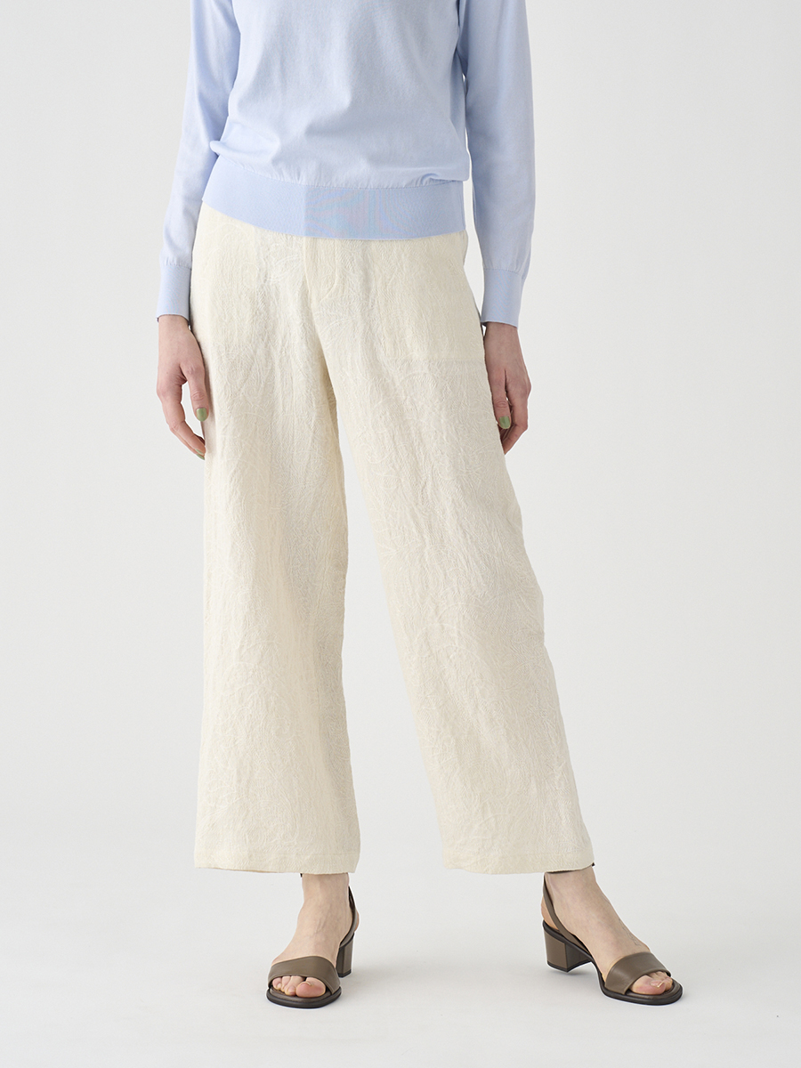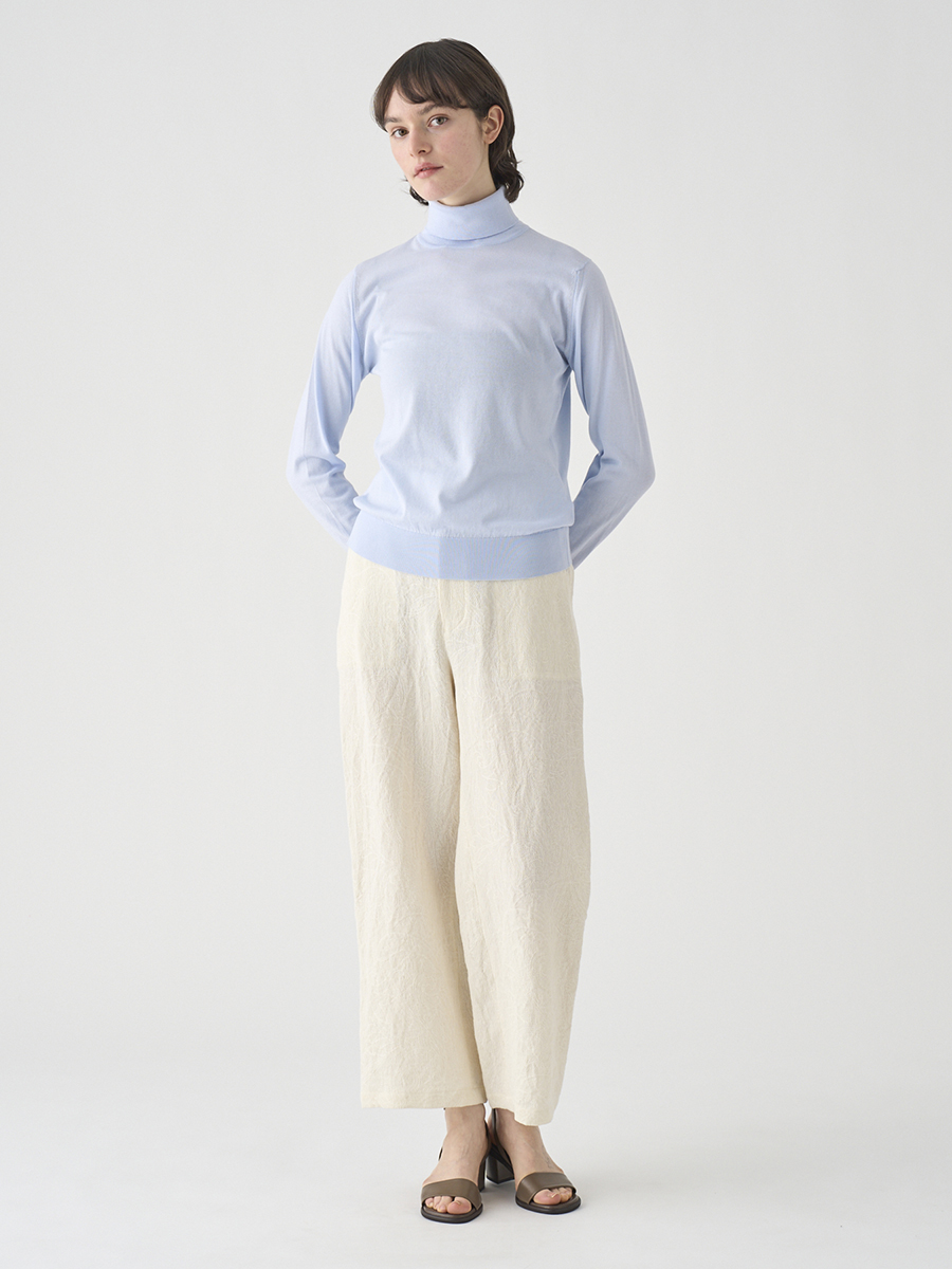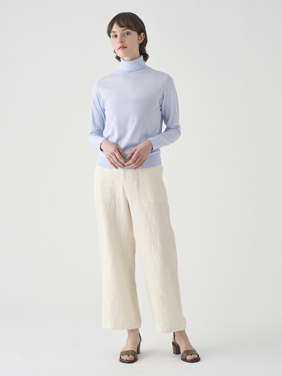 2026年のシーズンコンセプトを印象的に表現した、リネンジャカードのワイドパンツ。JOHN SMEDLEYのファインゲージニットと組み合わせることで、素材の風合いが活かされ、コーディネートに奥行きが生まれます。ウエストはイージーなゴム仕様とし、リラックスした穿き心地と優雅な佇まいを叶える一着に仕上げました。