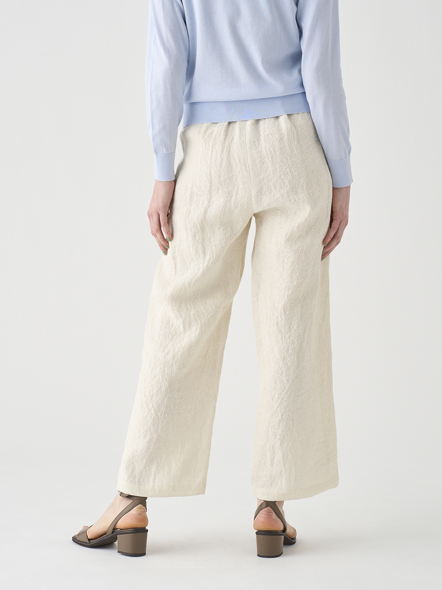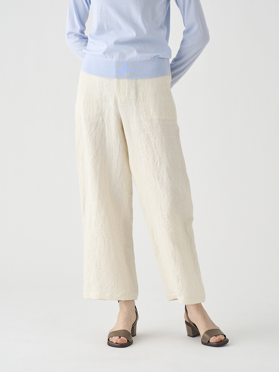 ニットの編地で表現される凹凸のある質感と職人技から着想を得た、繊細かつ印象的なジャカード織りのリネン生地を採用しました。リネンならではの軽やかなドライタッチの質感に、上品で華やかな印象が加わります。