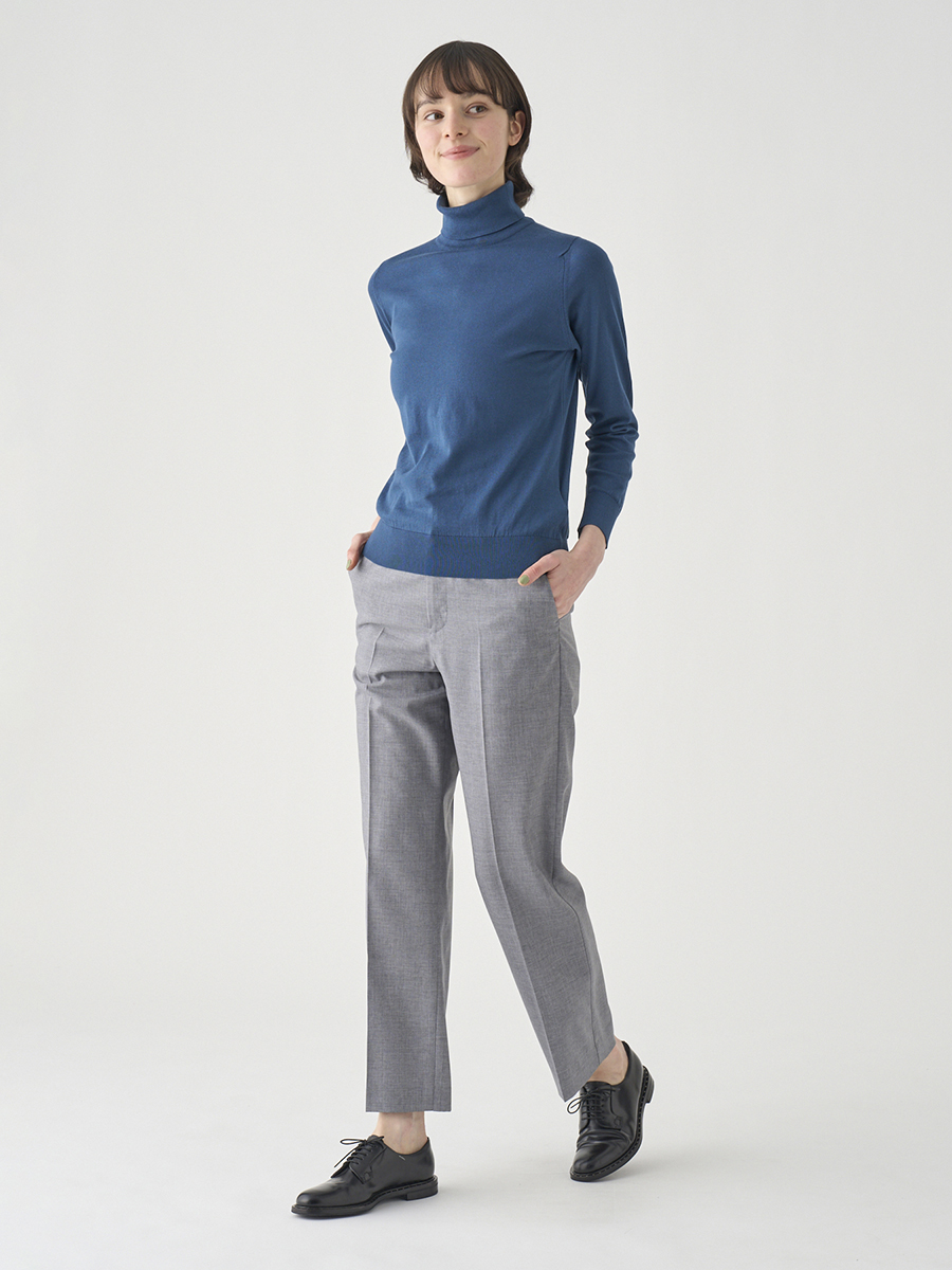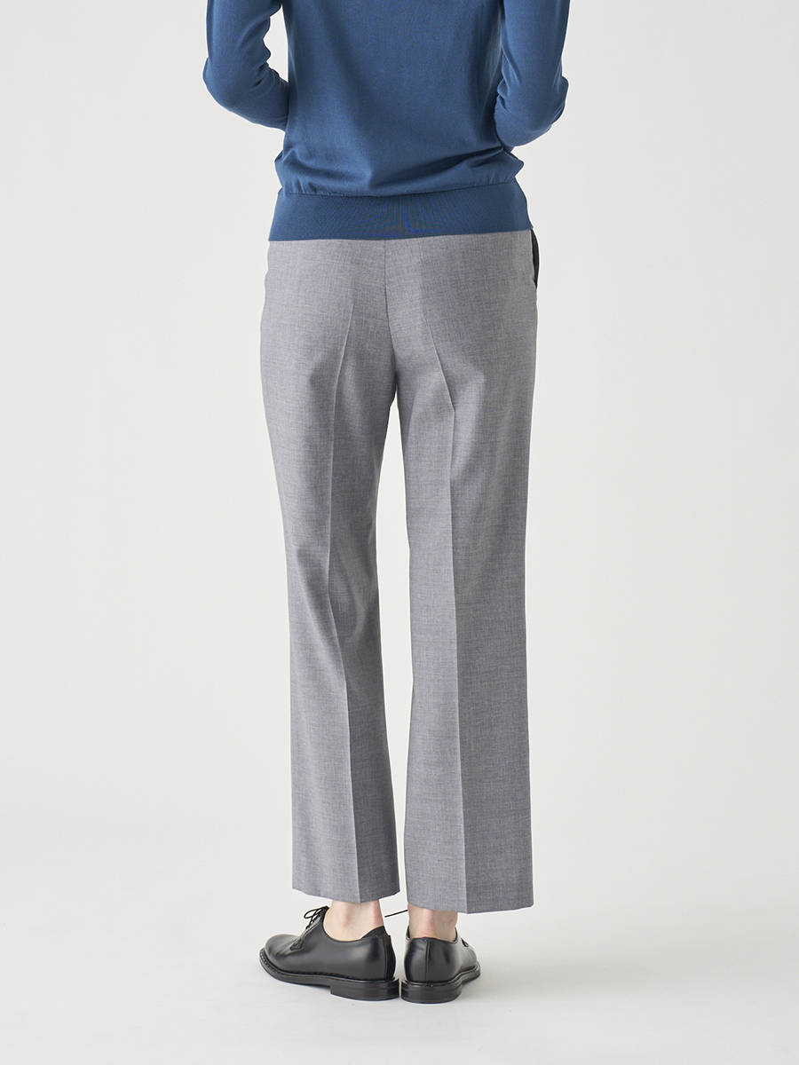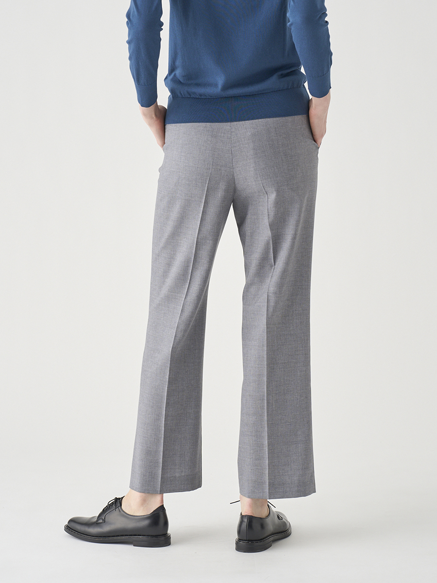 細めですっきりとしたシルエットのテーパードパンツ。フロント開きで、後ろウエストのみゴム仕様とすることで、ビジネスシーンにも対応可能なきれいさと、履いた時のリラックス感を両立させています。タイトなトップスにもボリュームのあるニットにも合わせやすく、足のラインを綺麗に見せてくれる、シーンを問わず活躍する万能なアイテムです。
