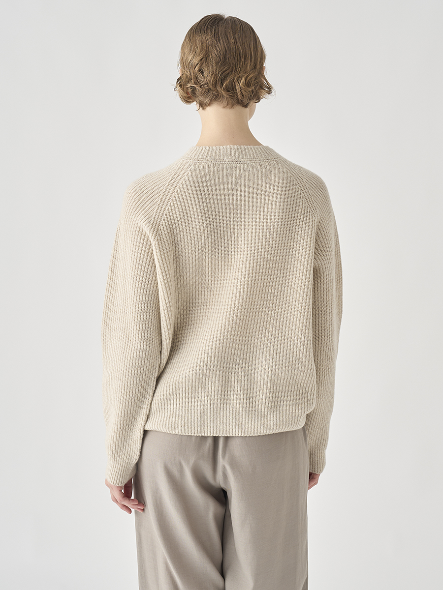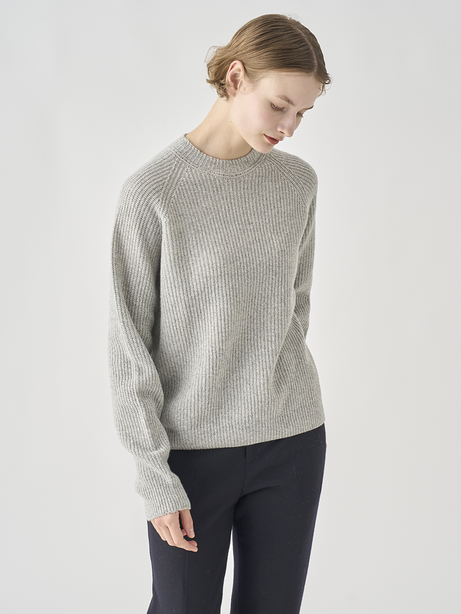 エコカシミヤを贅沢に50%使用した上質な素材感を生かし、ふんわりと包まれるような心地よさの、ごくシンプルなリブ編みのプルオーバーニット。柔らかなリブがカジュアル過ぎず、繊細な印象に。
