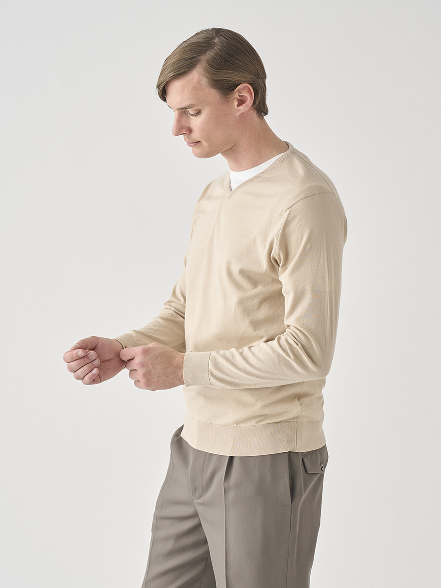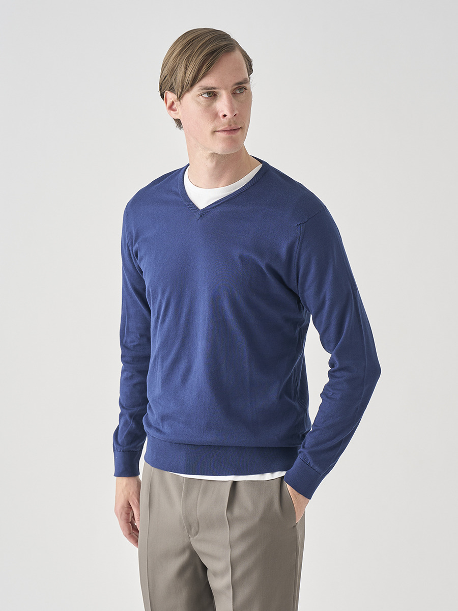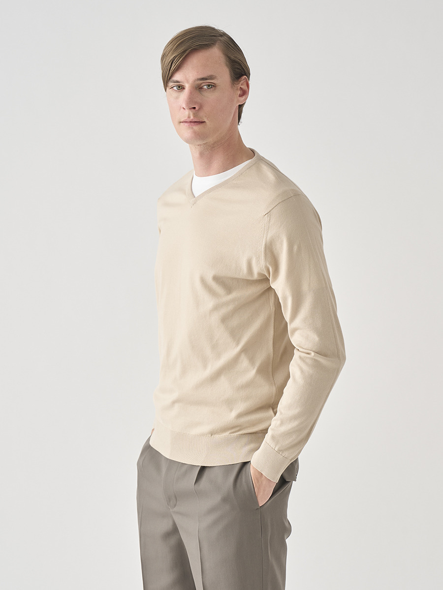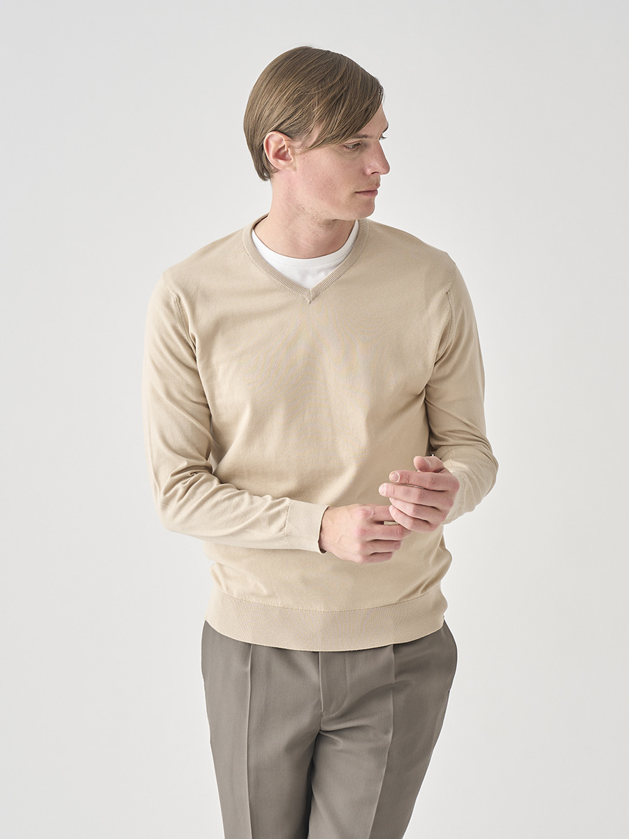 Vネックはトレンド感のある浅めに設定。30ゲージのしなやかな着心地をお楽しみ頂けます。