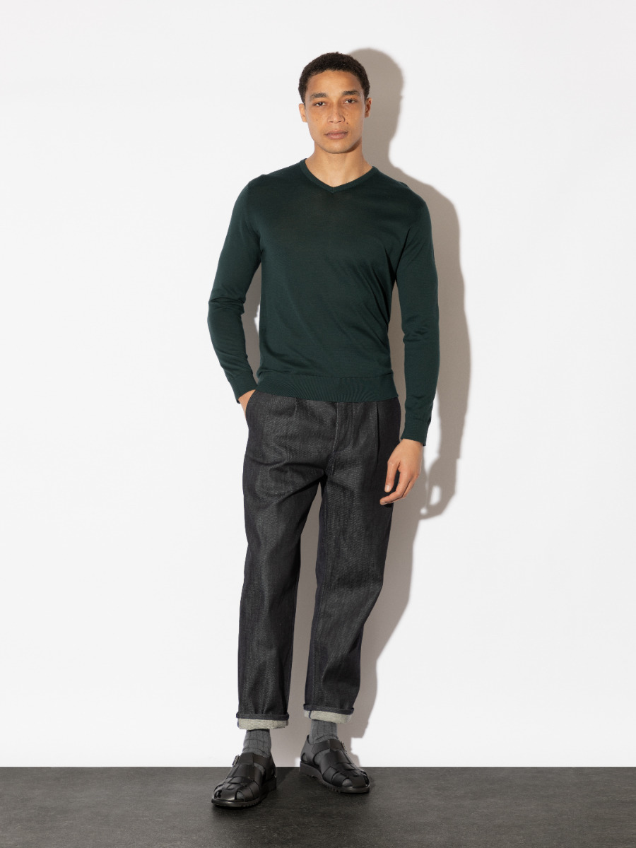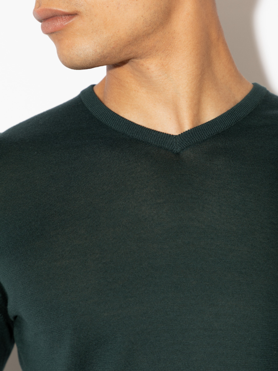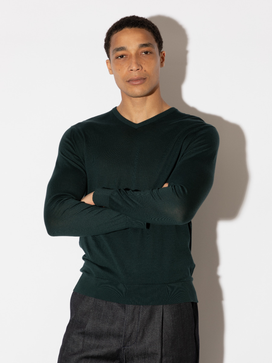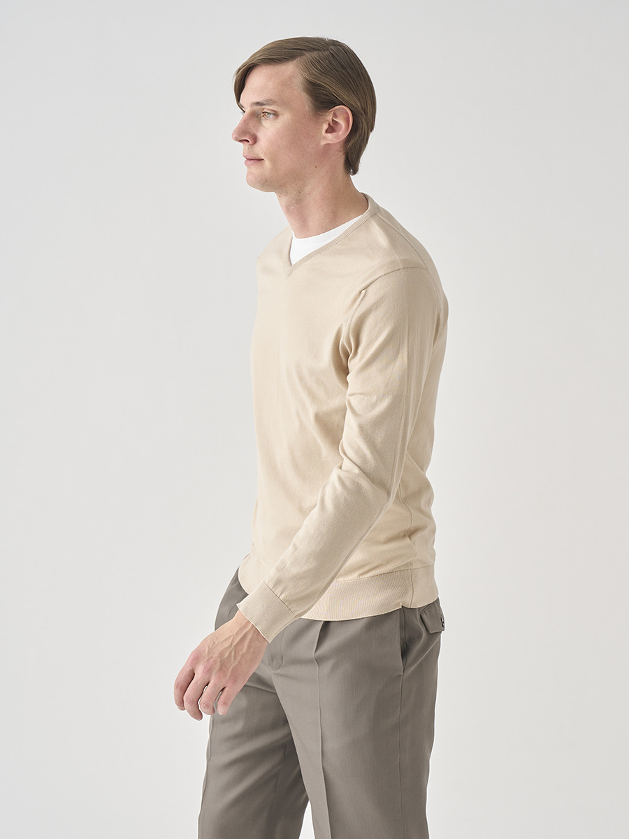 Vネックはトレンド感のある浅めに設定。30ゲージのしなやかな着心地をお楽しみ頂けます。