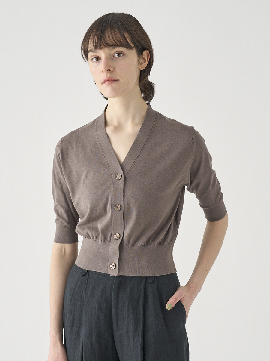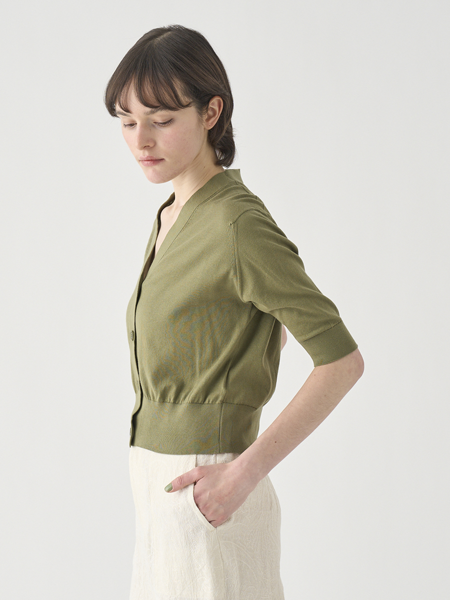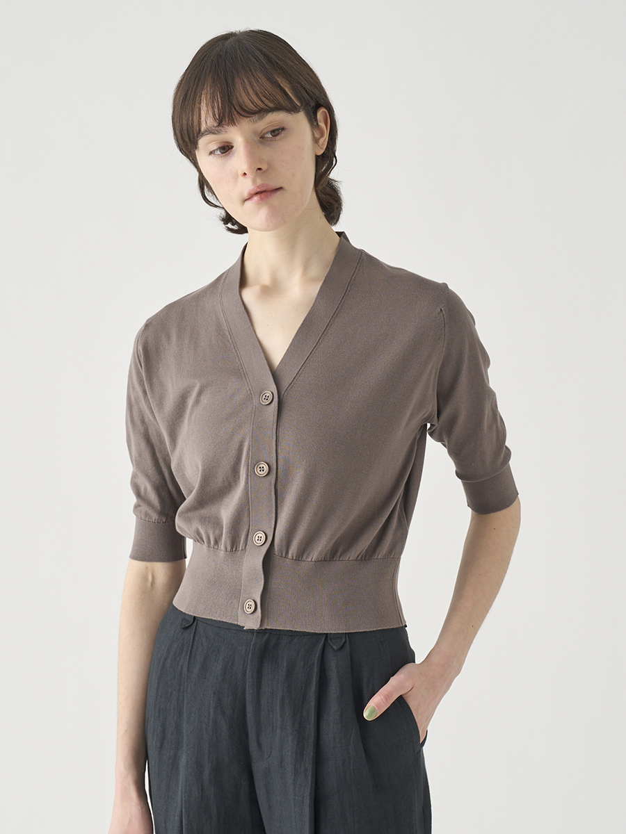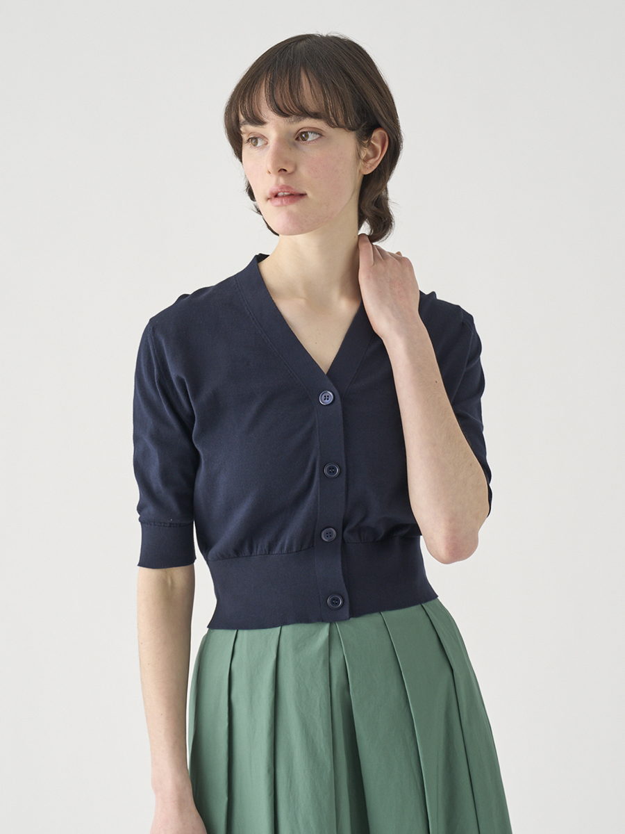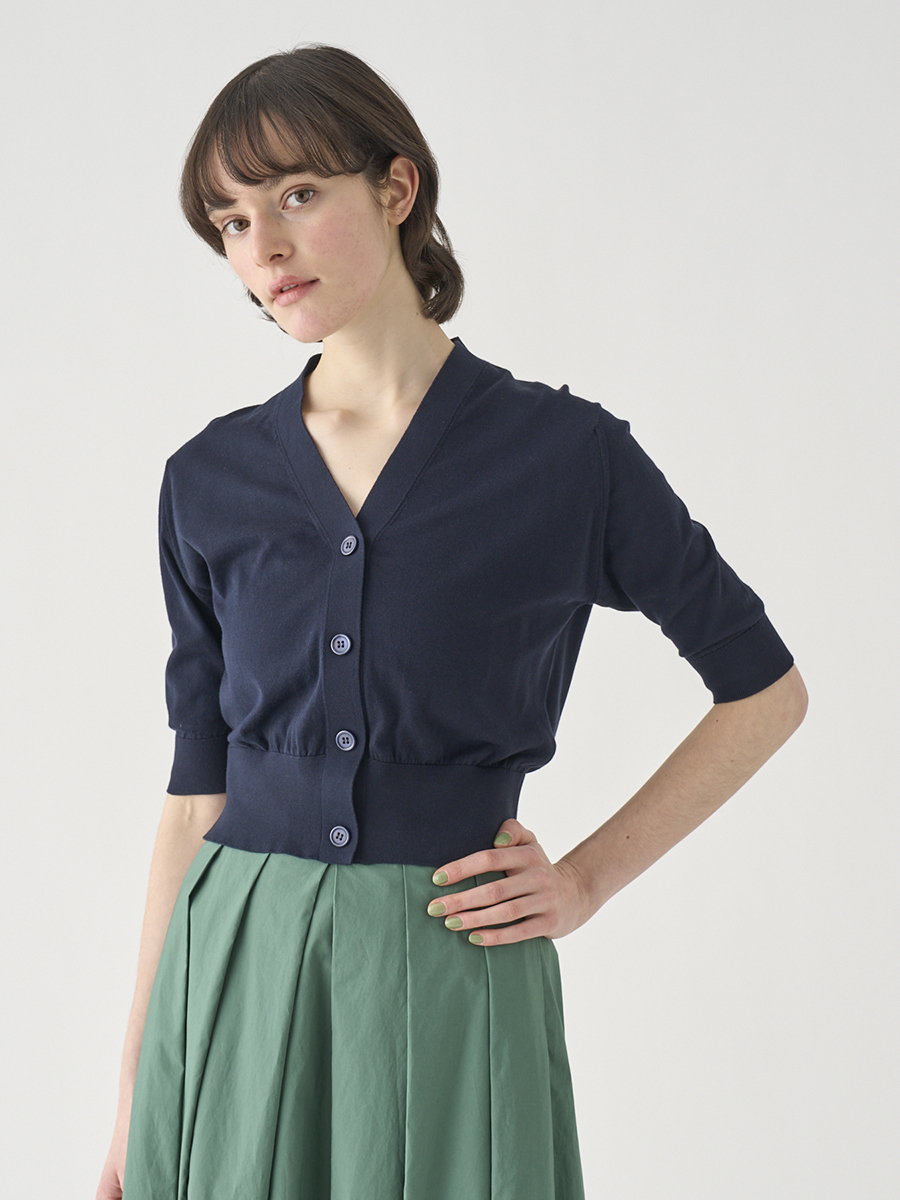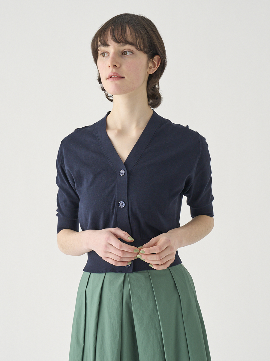 肘まで隠れる5分袖とすっきりとした短めの着丈が印象的なカーディガン。