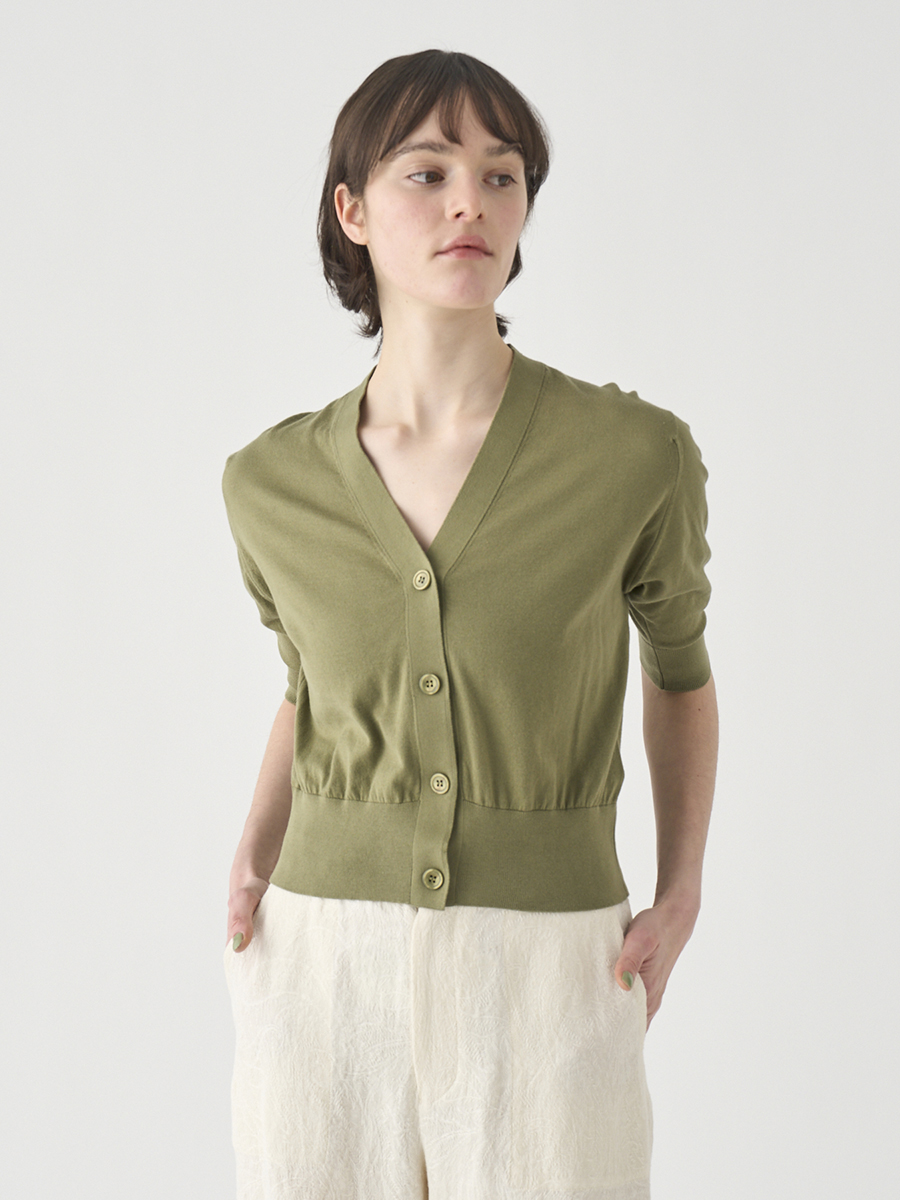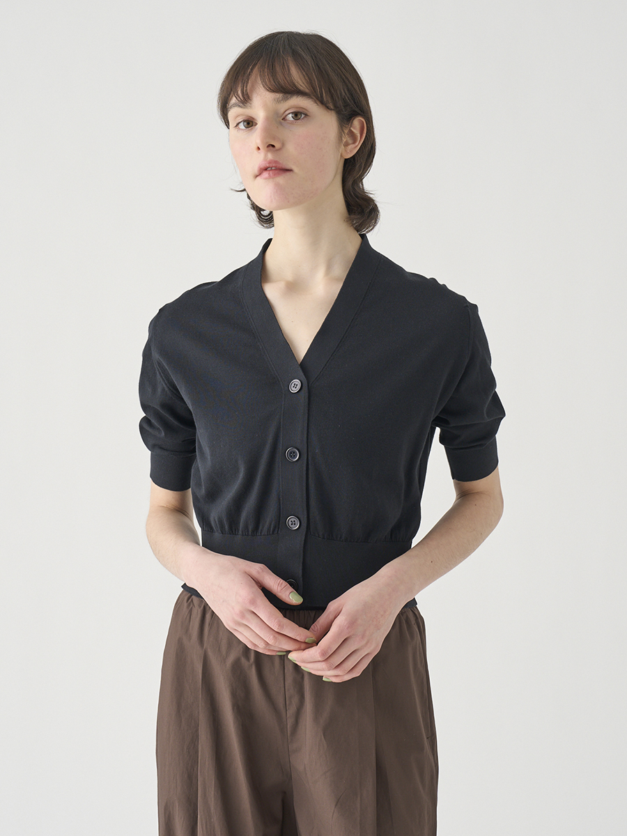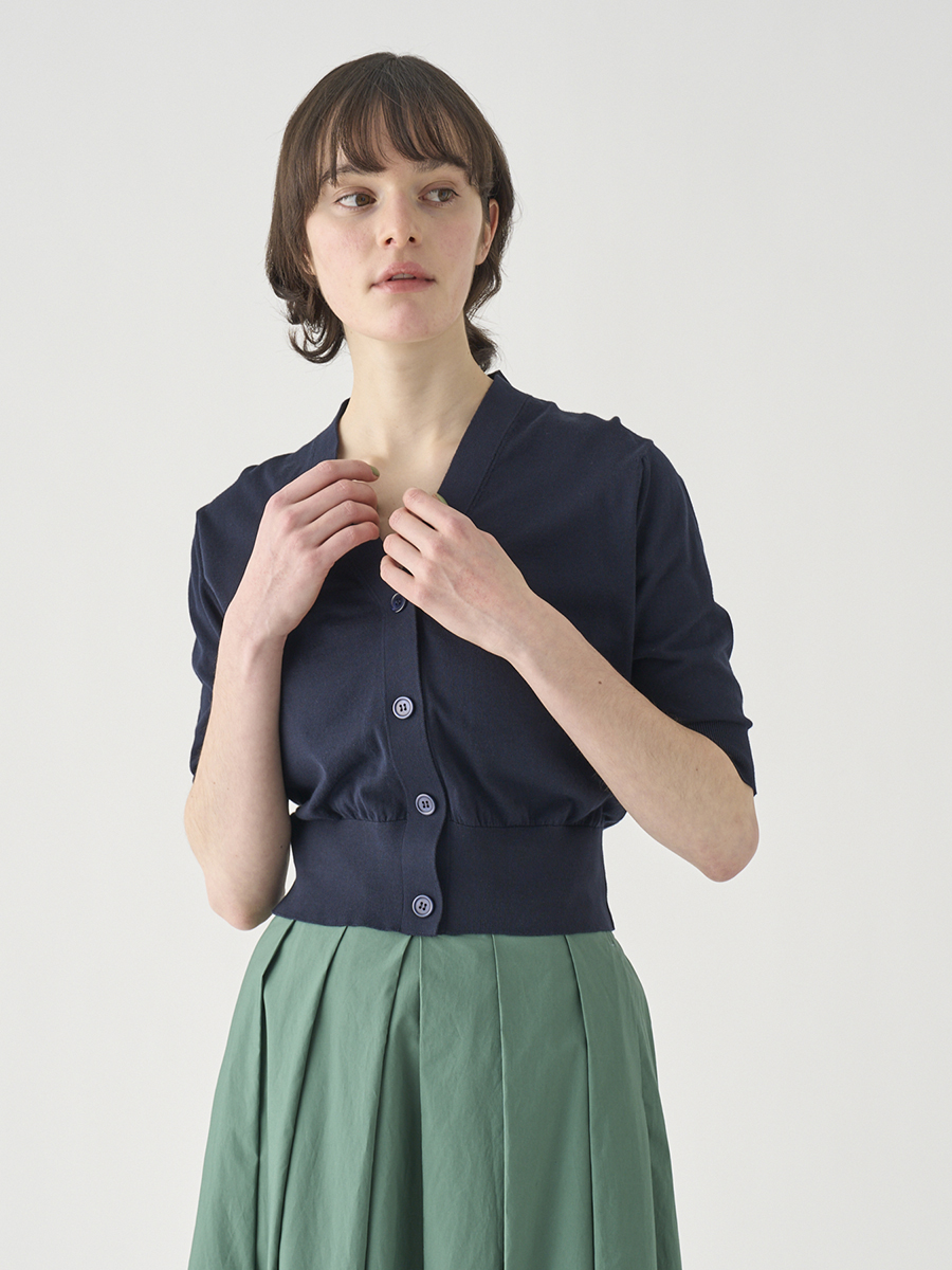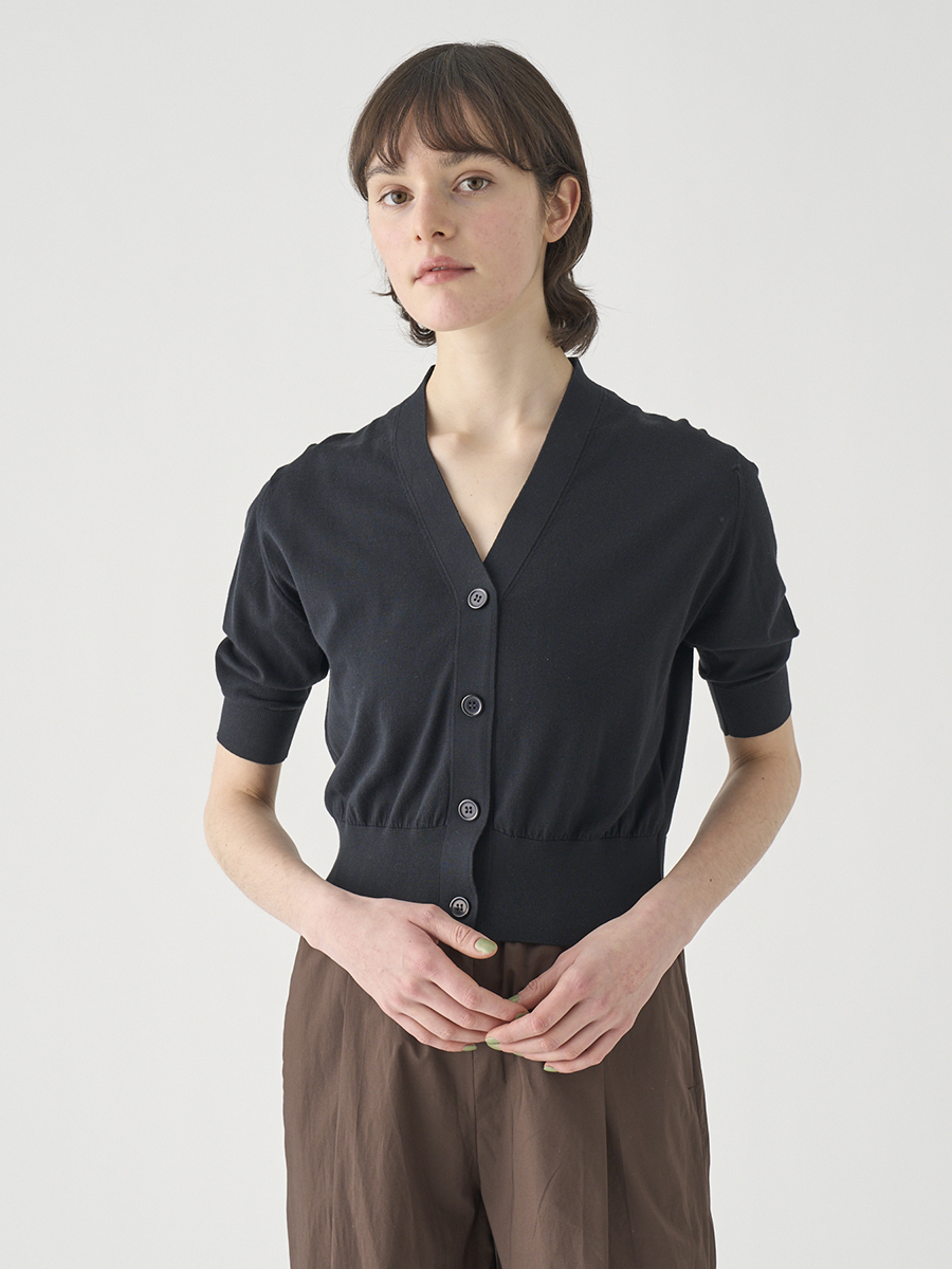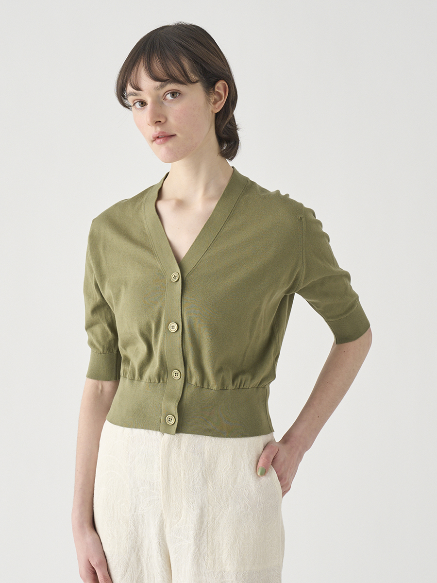肘まで隠れる5分袖とすっきりとした短めの着丈が印象的なカーディガン。