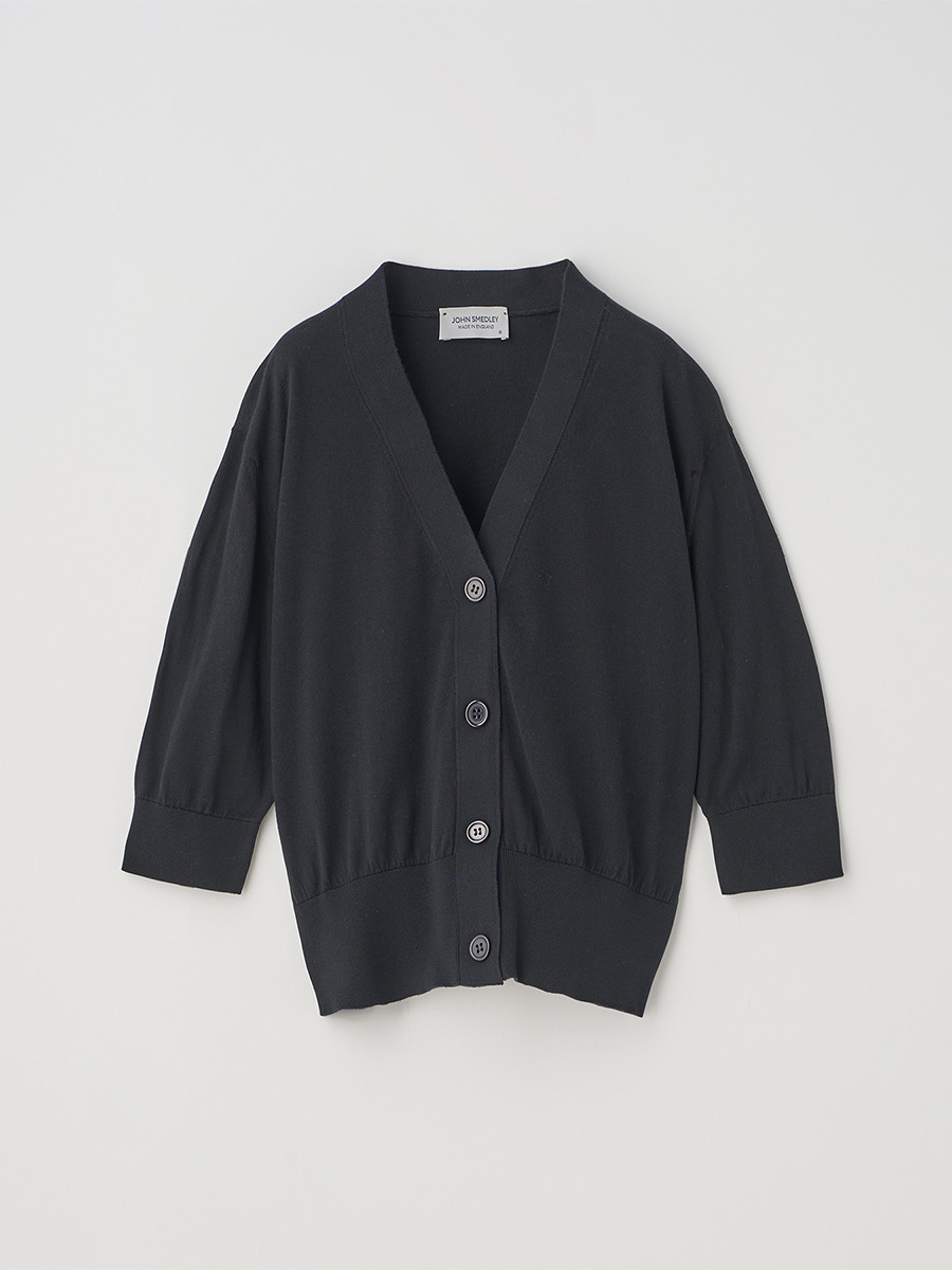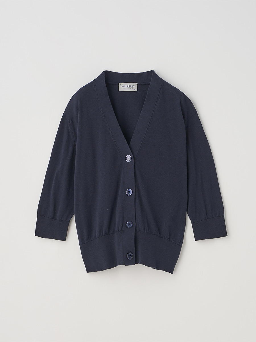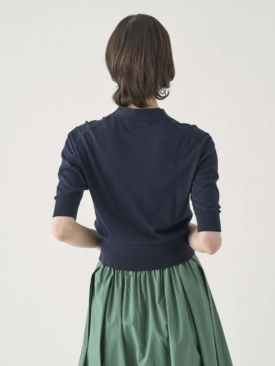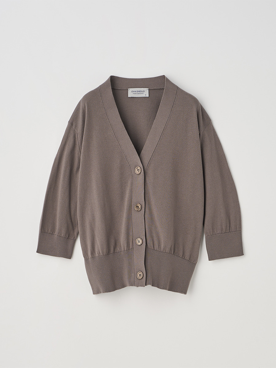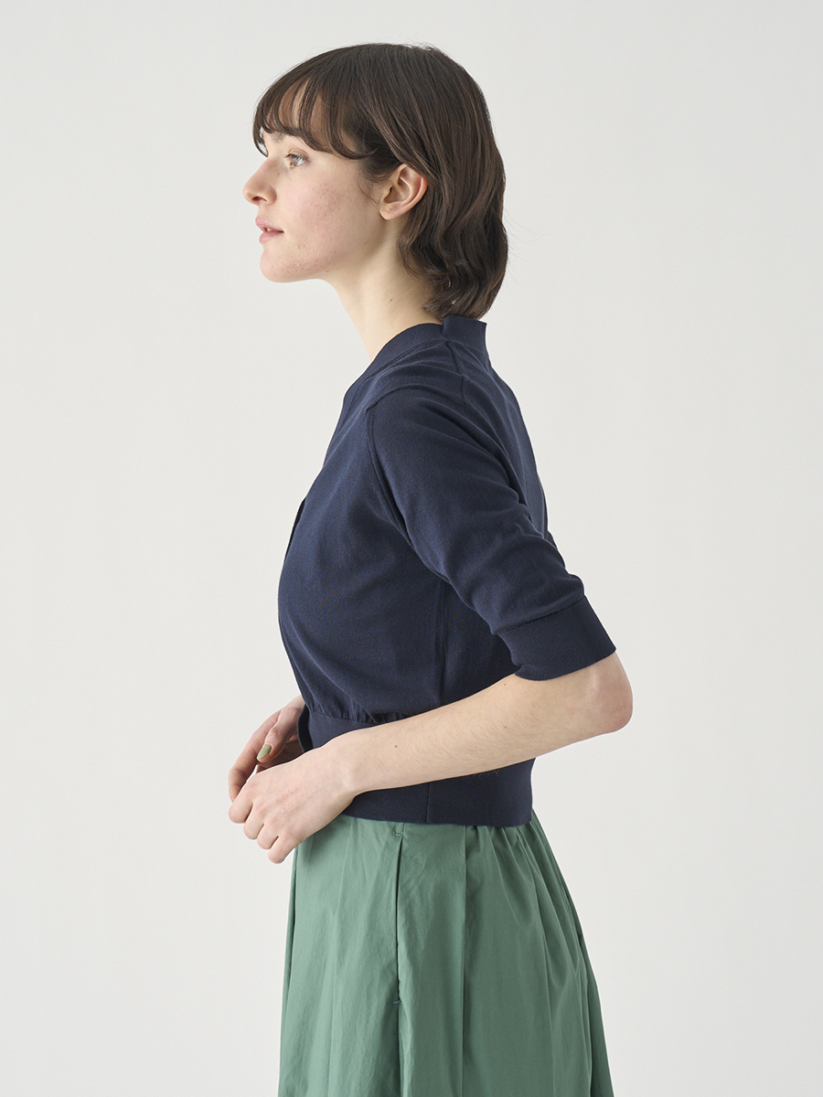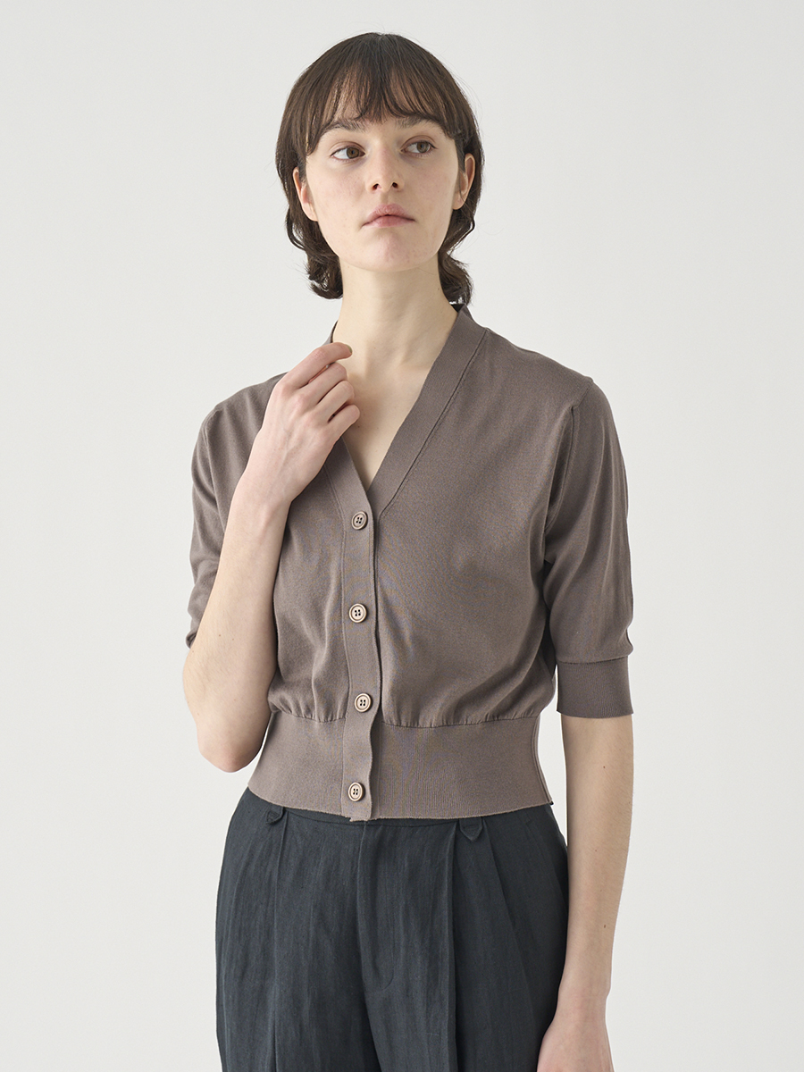 肘まで隠れる5分袖とすっきりとした短めの着丈が印象的なカーディガン。