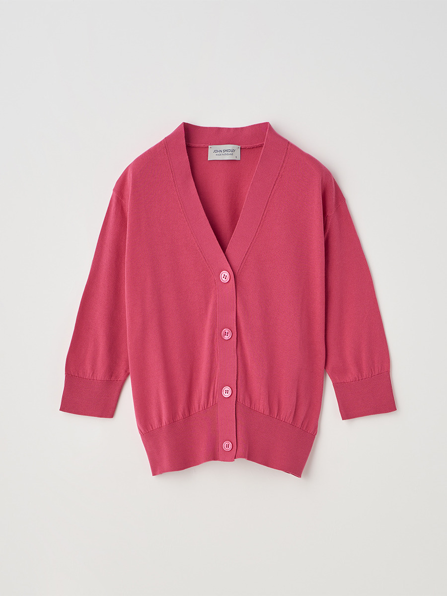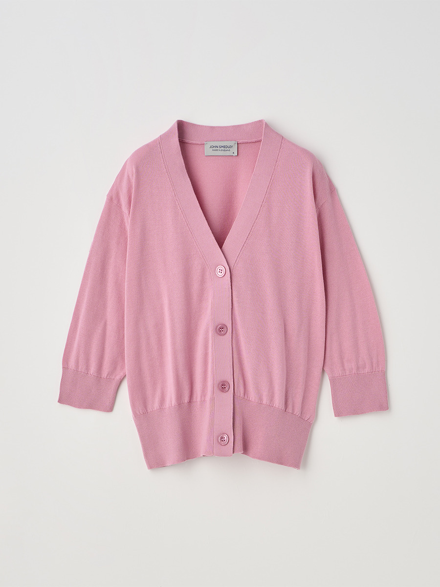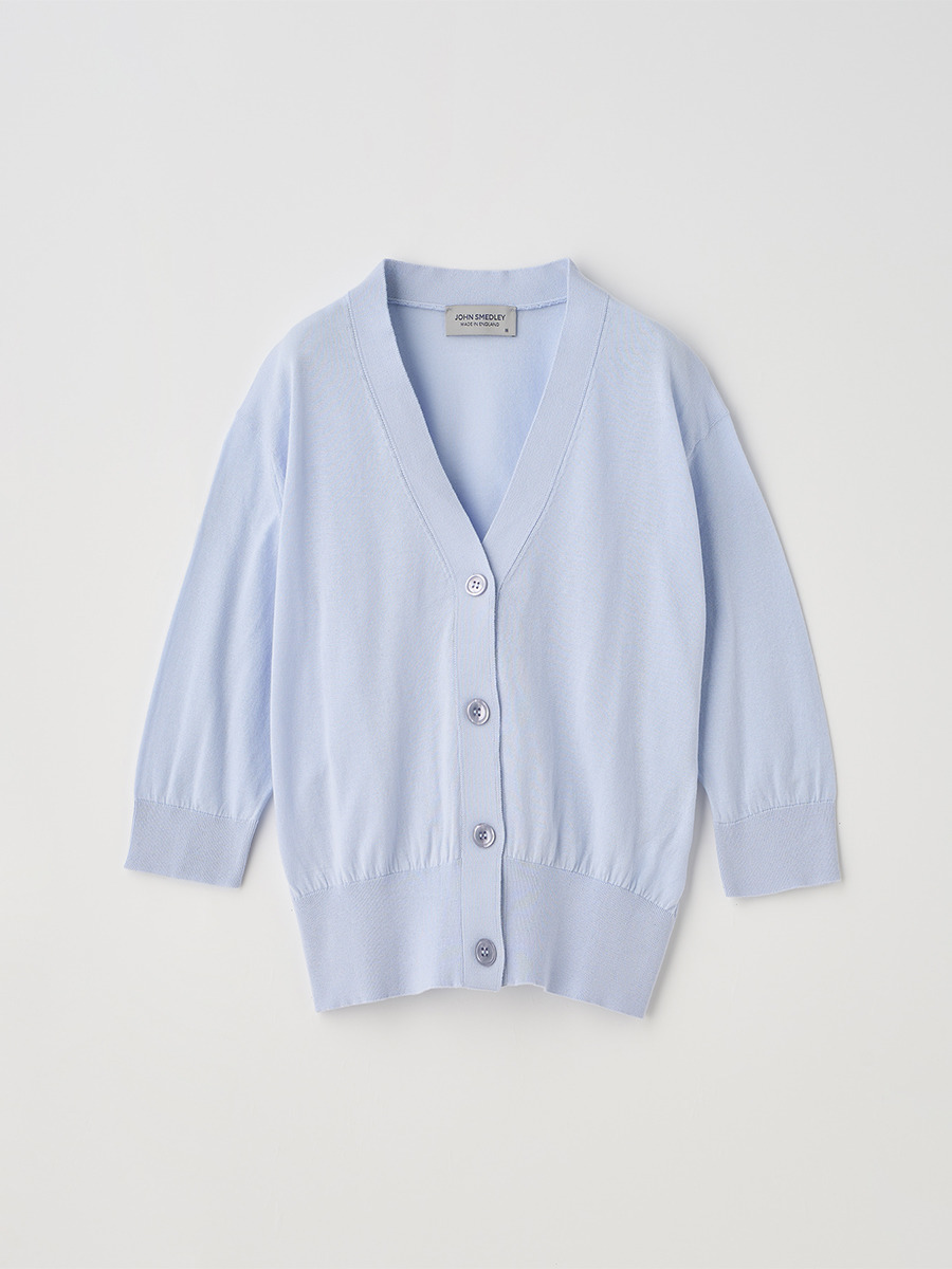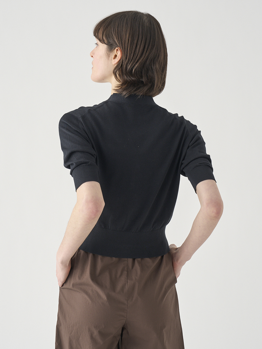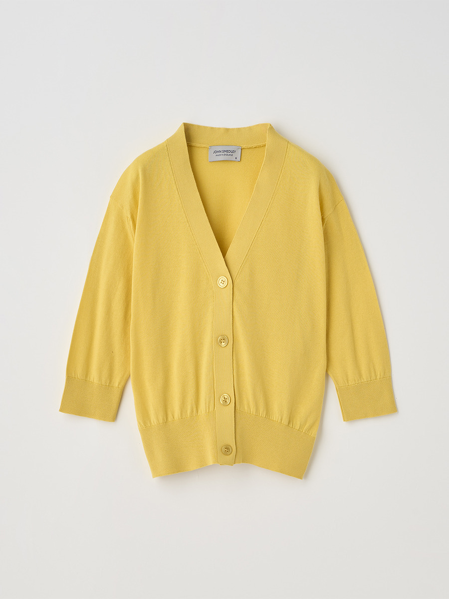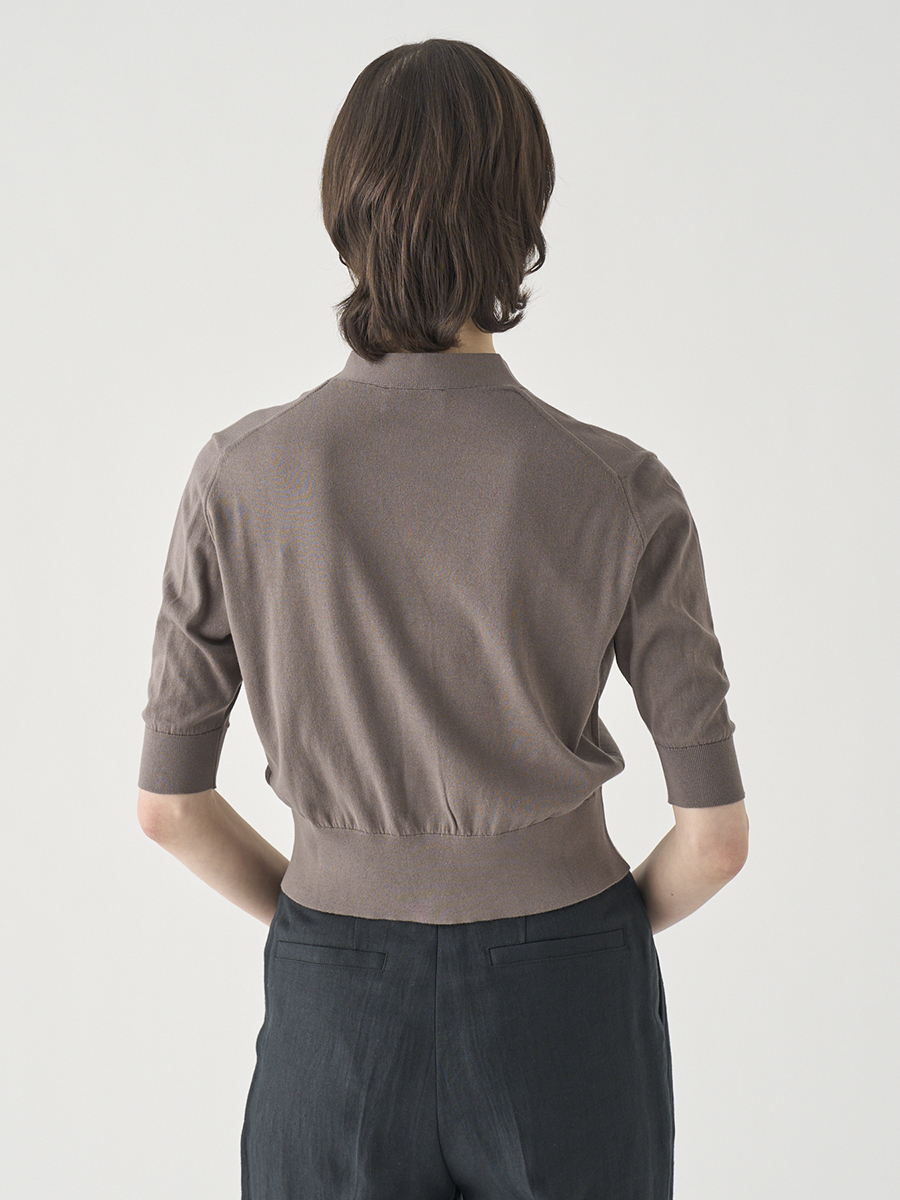 肘まで隠れる5分袖とすっきりとした短めの着丈が印象的なカーディガン。