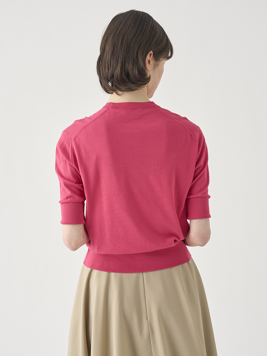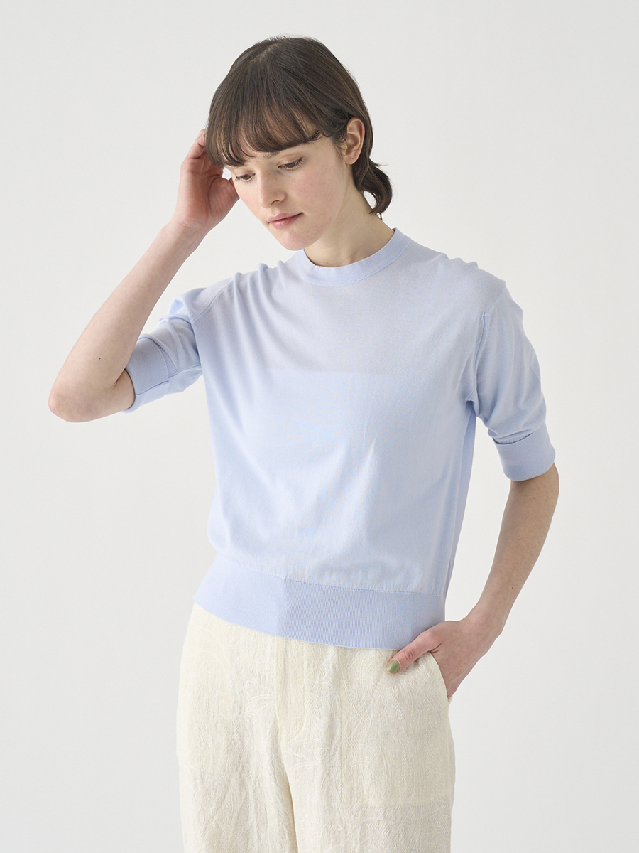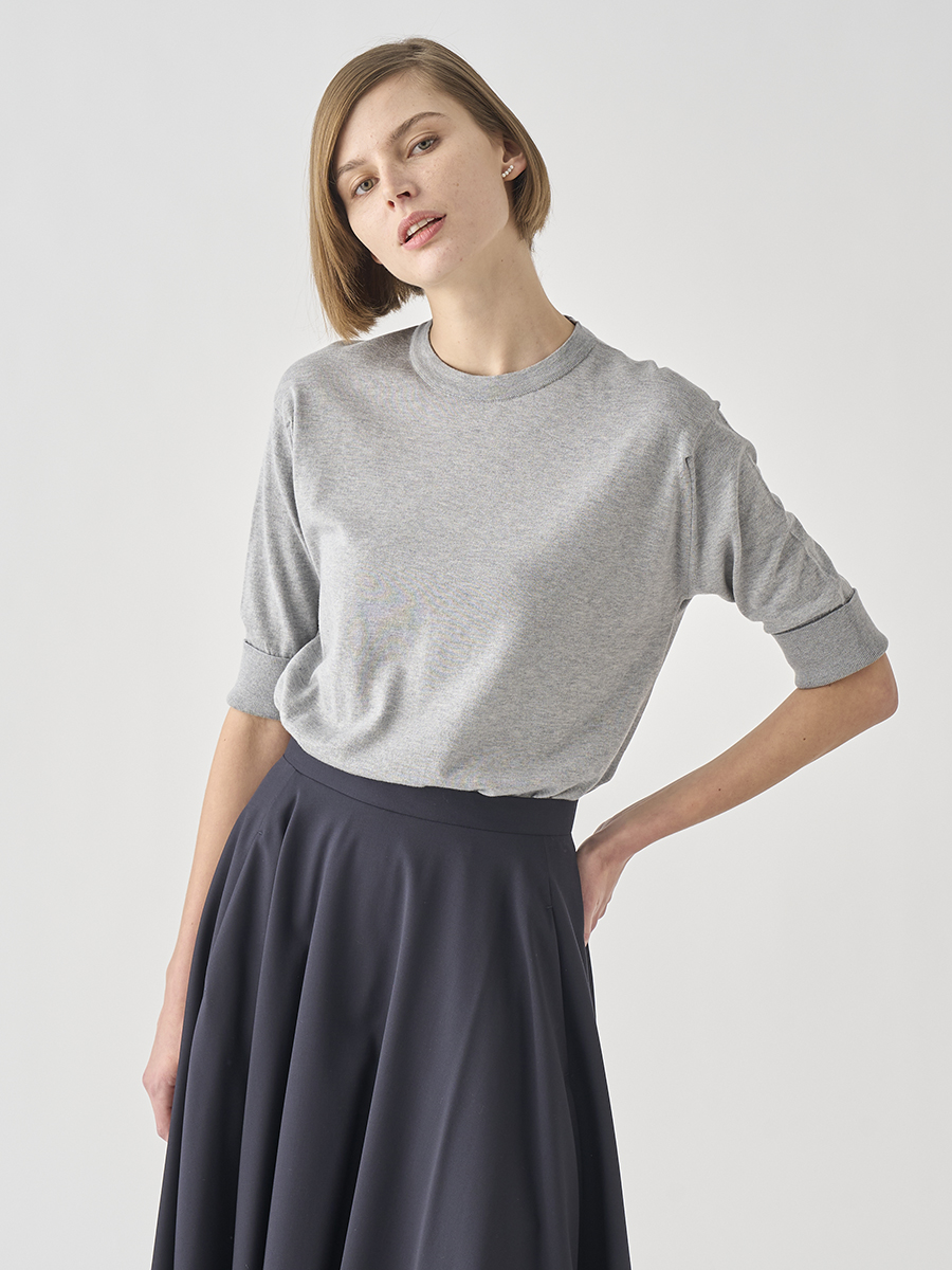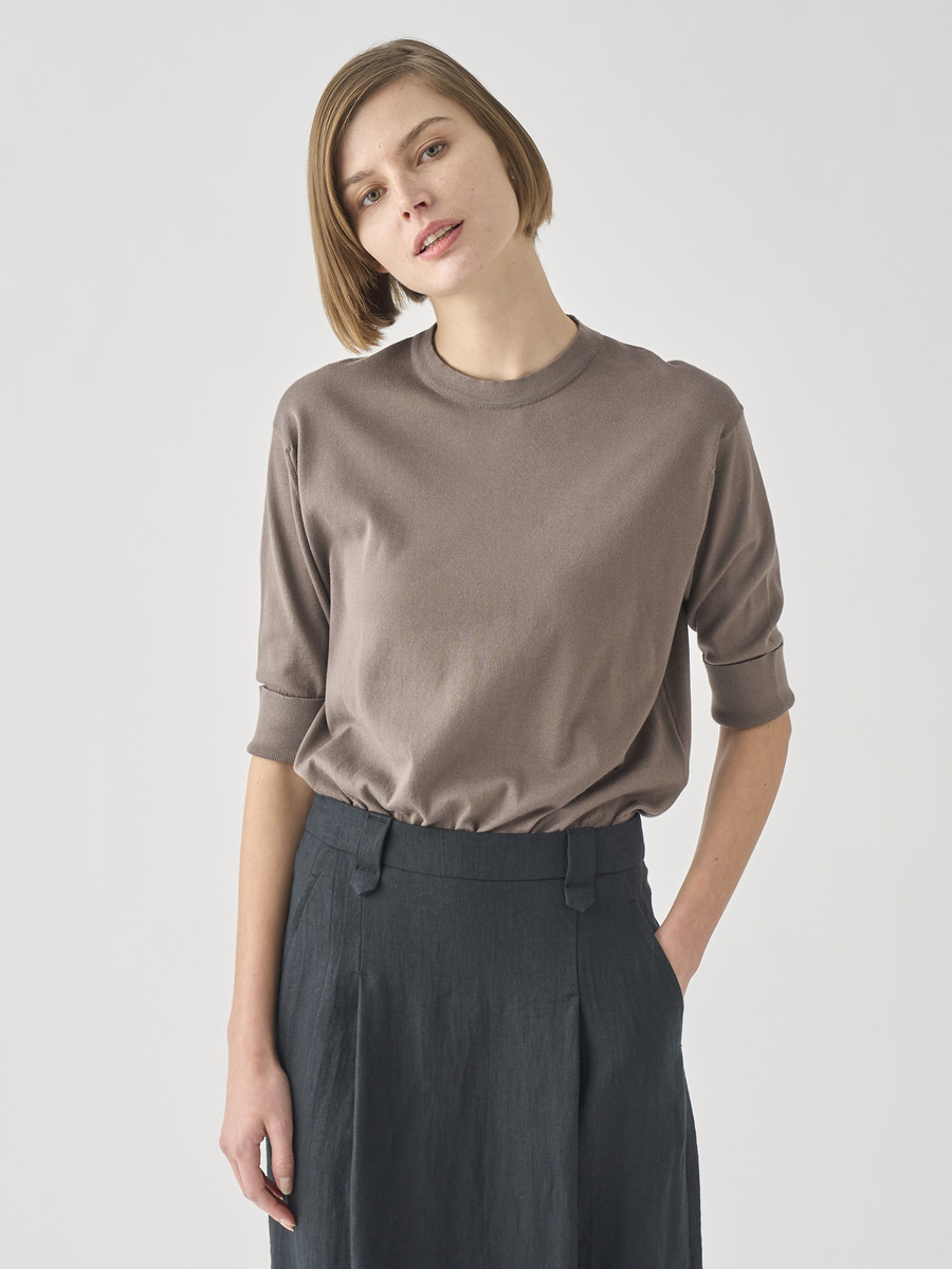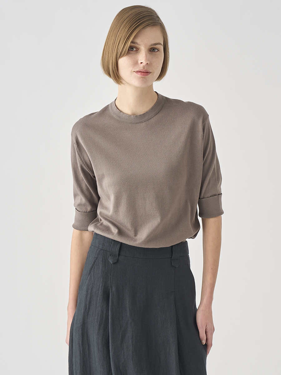 袖は長めのリブでターンバック仕様とし、折り返すことでさりげないデザイン性をプラス。モダンな印象の5分袖は腕周りをカバーしやすく、ON/OFFを問わず幅広いシーンにマッチします。シンプルながらも1枚で様になるニットは真夏まで大活躍。カットソーではカジュアルになりすぎてしまうシーンにもお試しください。