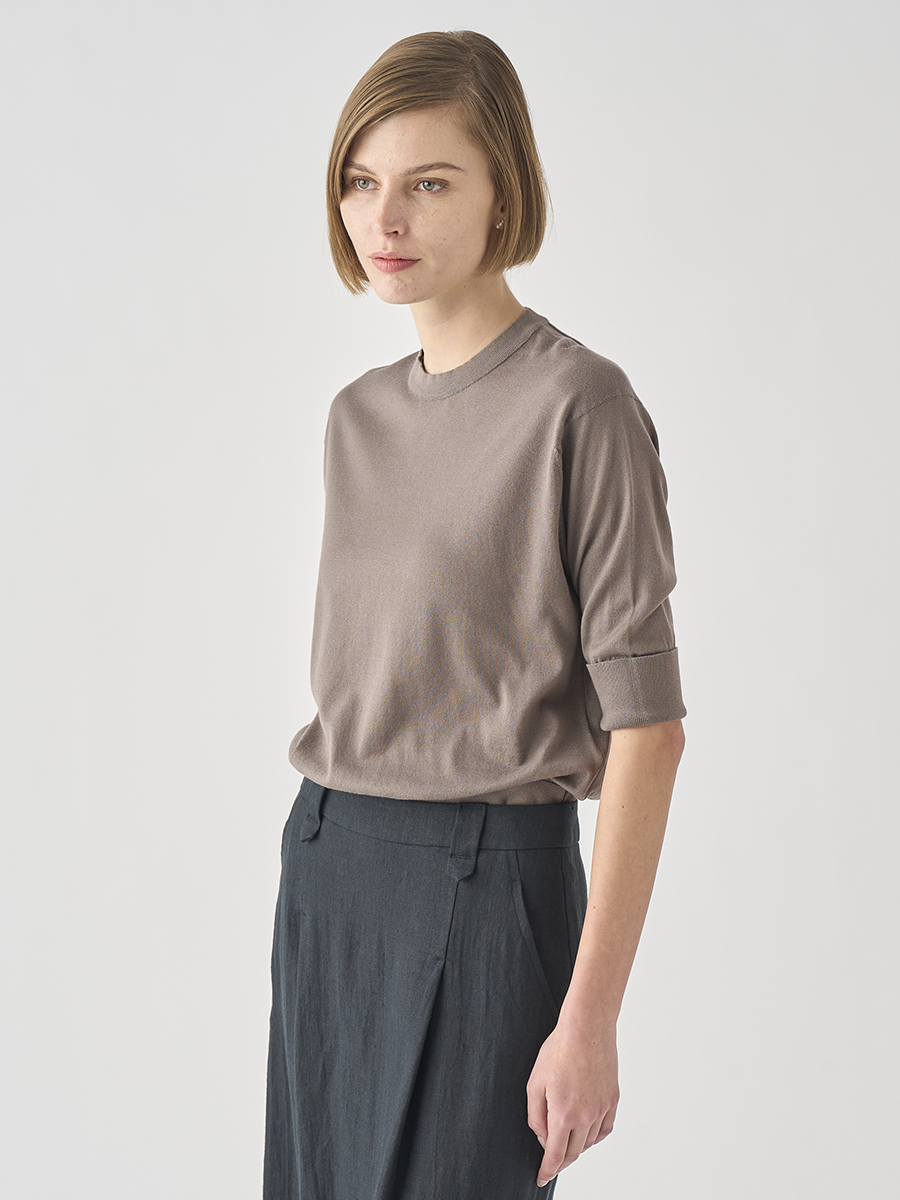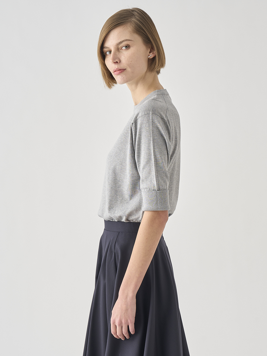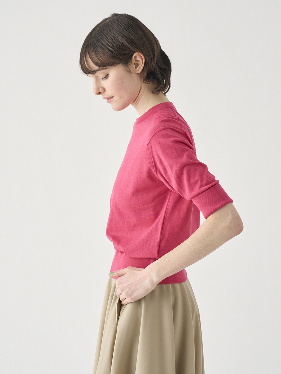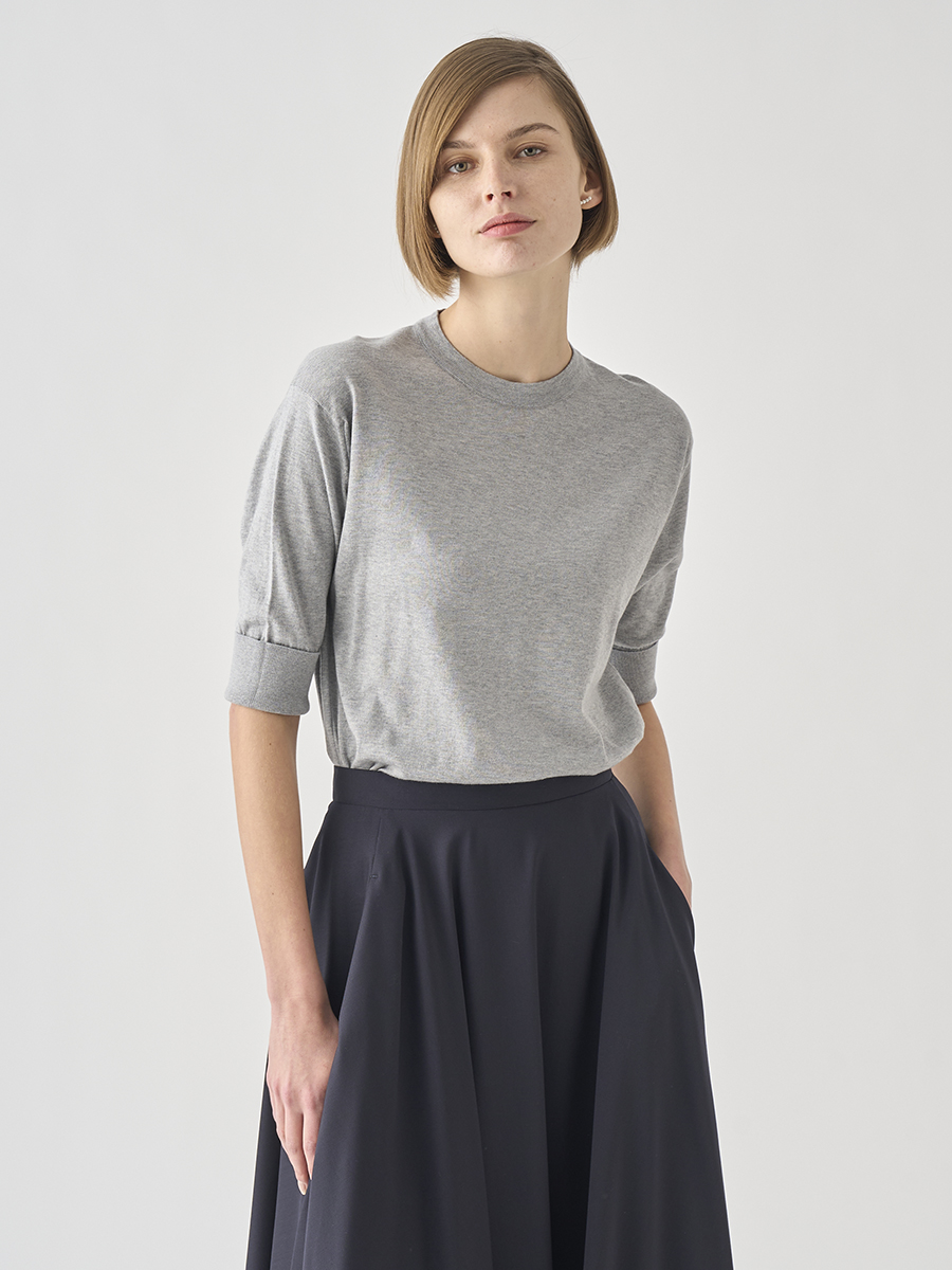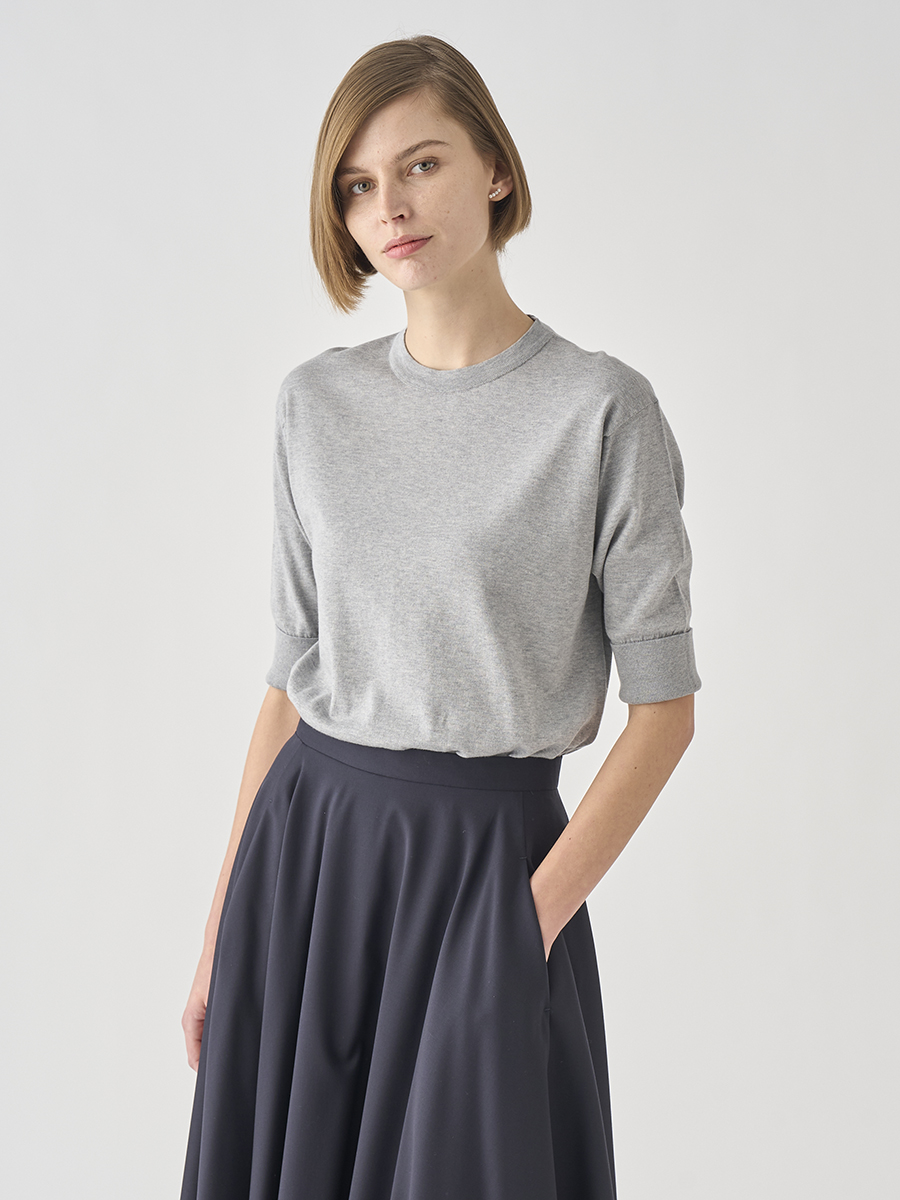 袖は長めのリブでターンバック仕様とし、折り返すことでさりげないデザイン性をプラス。モダンな印象の5分袖は腕周りをカバーしやすく、ON/OFFを問わず幅広いシーンにマッチします。シンプルながらも1枚で様になるニットは真夏まで大活躍。カットソーではカジュアルになりすぎてしまうシーンにもお試しください。