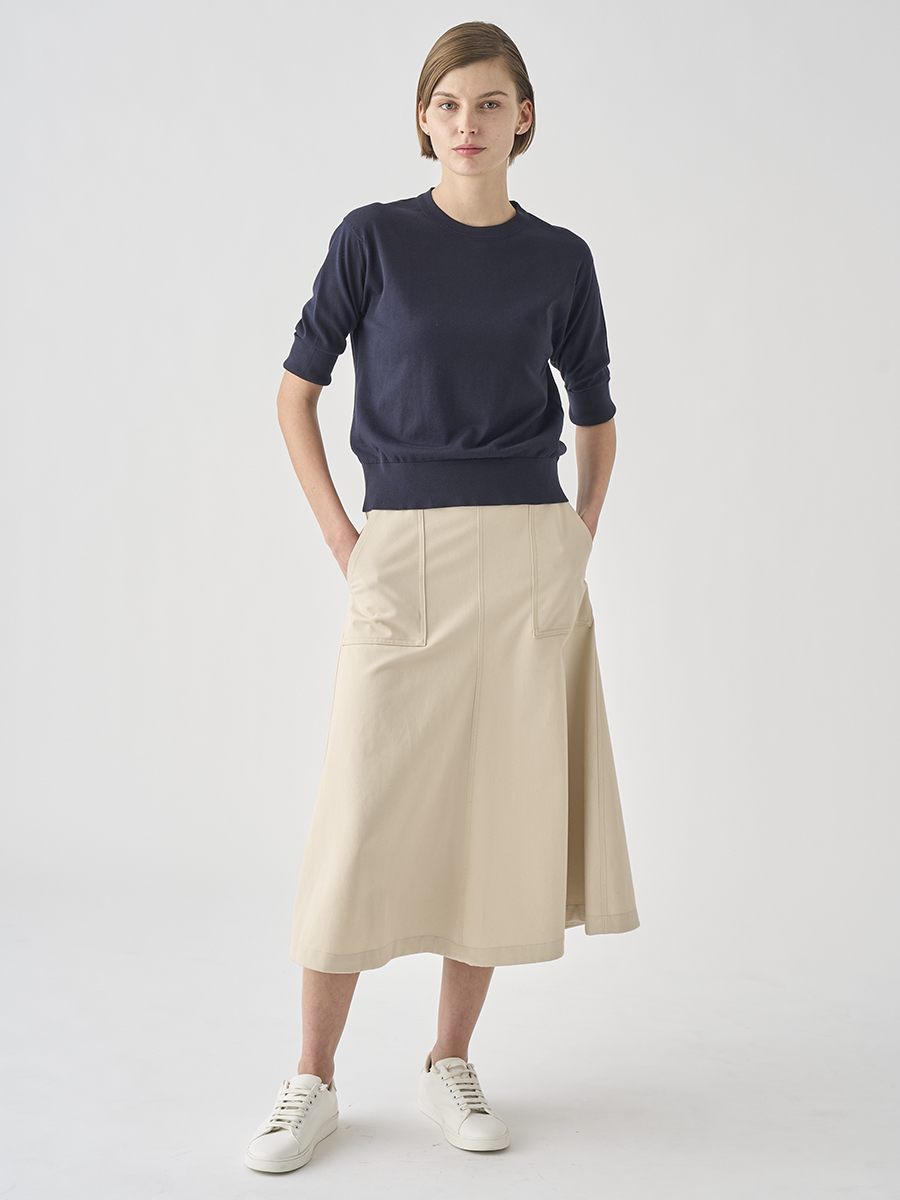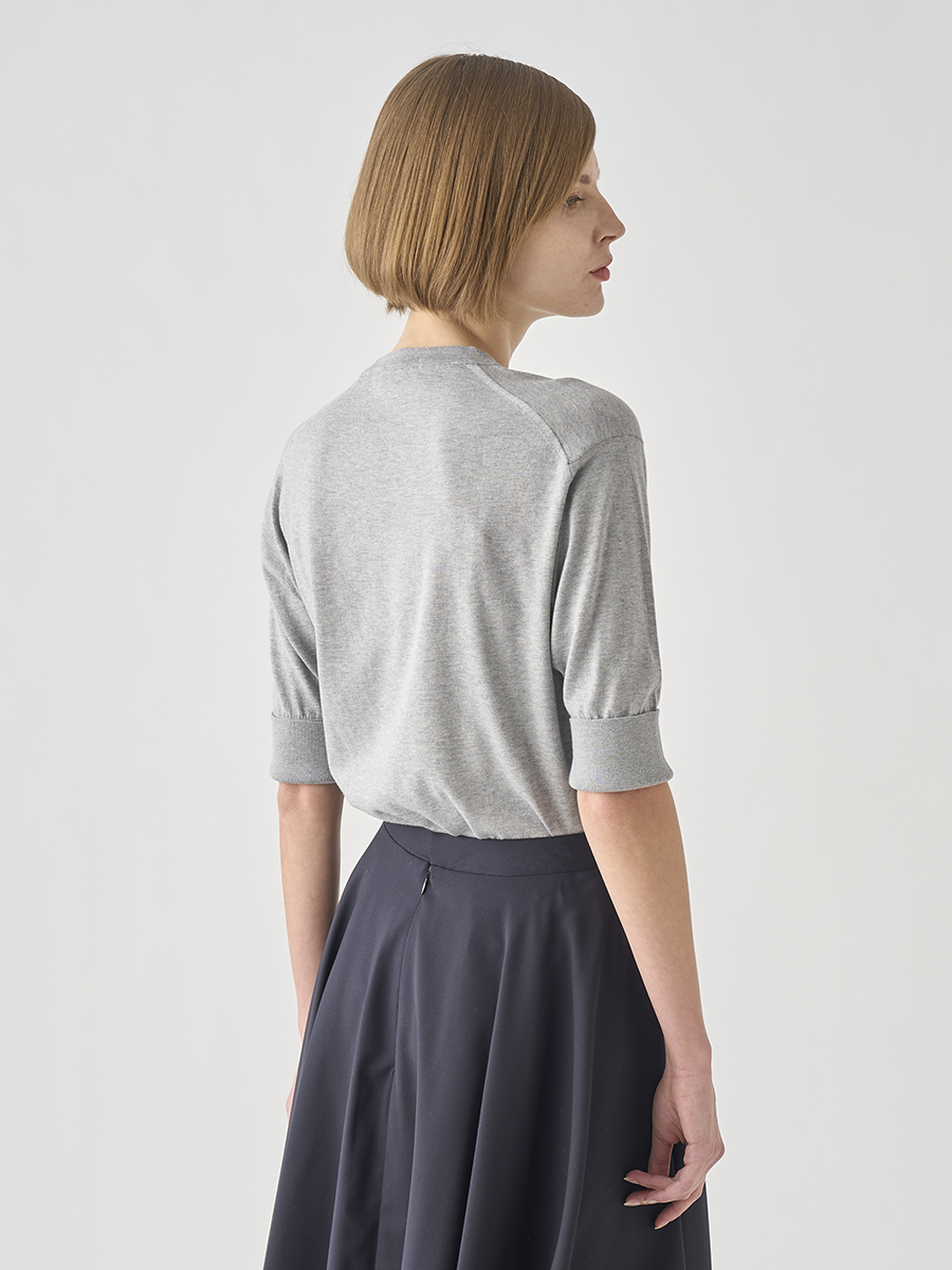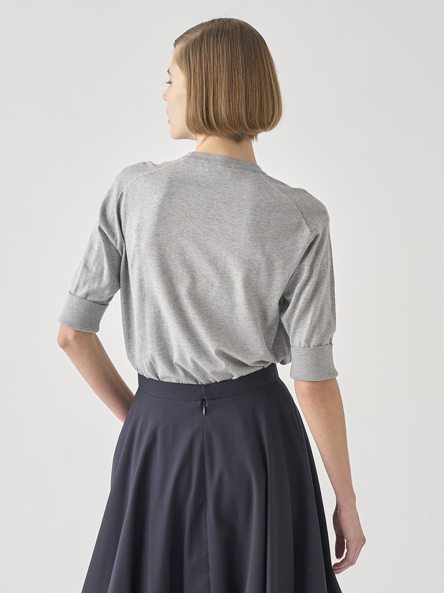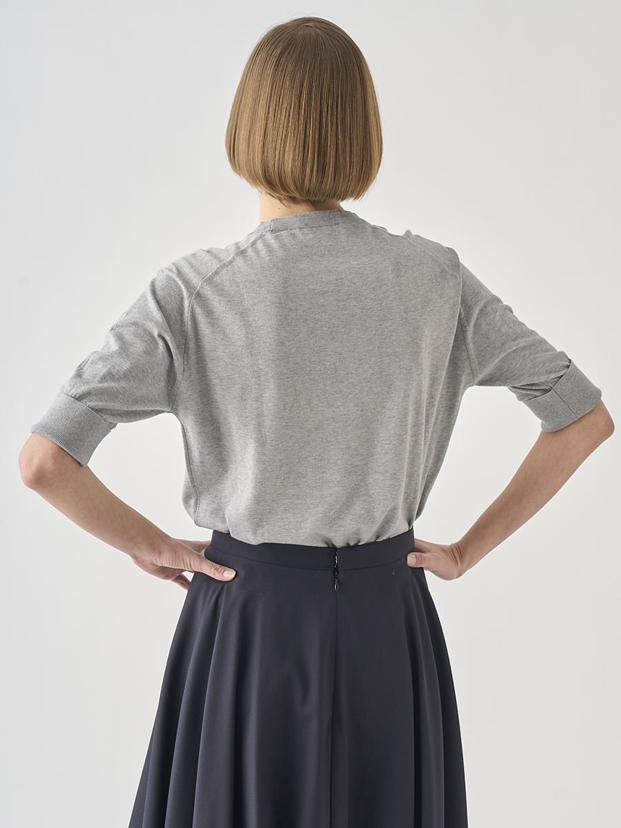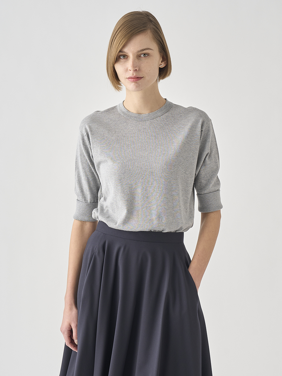 袖は長めのリブでターンバック仕様とし、折り返すことでさりげないデザイン性をプラス。モダンな印象の5分袖は腕周りをカバーしやすく、ON/OFFを問わず幅広いシーンにマッチします。シンプルながらも1枚で様になるニットは真夏まで大活躍。カットソーではカジュアルになりすぎてしまうシーンにもお試しください。