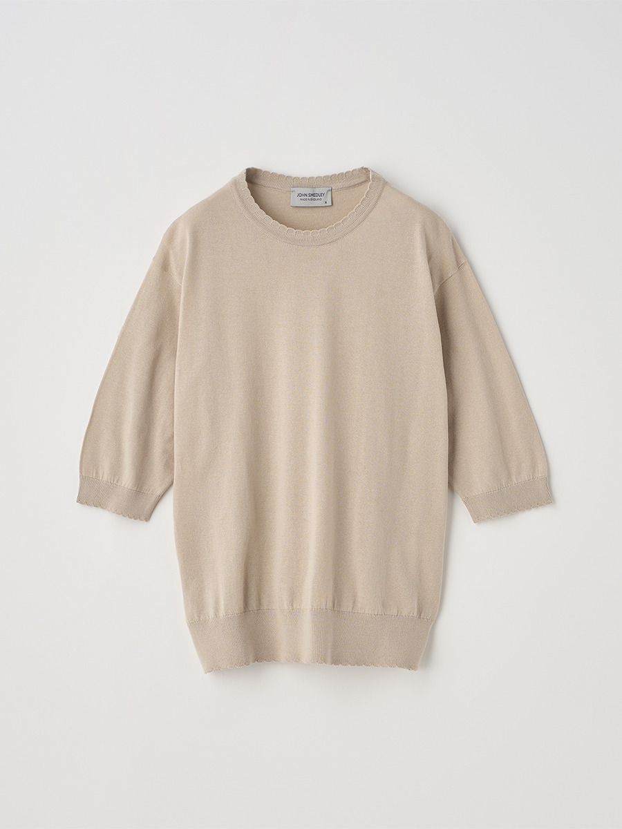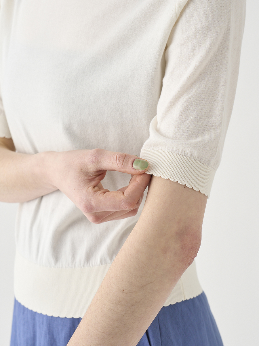 2026年のシーズンコンセプトを表現し、襟・袖・裾にスカラップ編みをあしらった半袖ニットプルオーバー。