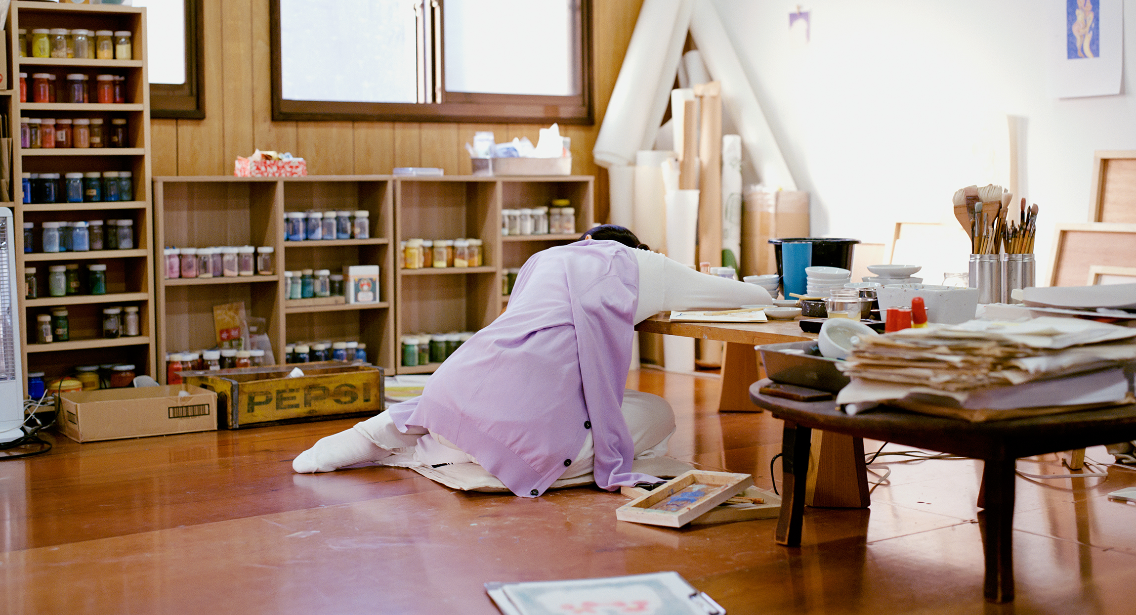 森さんが日々通っているアトリエは、日本画を専攻していた大学時代の先輩とのシェアスペース。集中して黙々と作業をしているというよりは、先輩と日常のことをお喋りしたり、共有スペースでおやつを食べたり、ときに昼寝をすることもあるそうです。