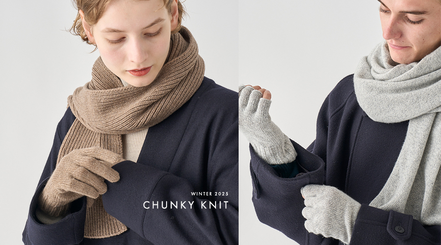 日が短くなるとともに、徐々に寒さが増す冬の季節は、柔らかさと温もりを感じるニットが一層恋しくなります。そこでおすすめしたいのが、チャンキーニット。贅沢な素材を使用したふっくらと柔らかいニットは、保温性に優れ、それ一枚で充分な温かさを確保してくれます。コーディネートの主役となるプルオーバー、アウター代わりのドライバーズニット、性別を問わず愛用できる雑貨など…様々に着用できるチャンキーニットは、冬に欠かせない存在となることでしょう。
