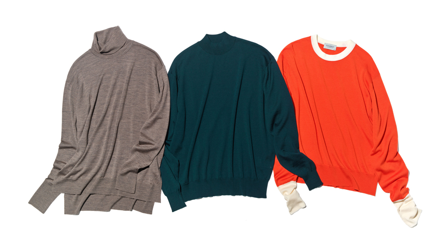 (左)リラックスフィットをとりいれたタートルネック「MALLERY」。前身頃に比べ後ろ身頃の着丈を長くしスリット