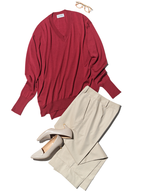 ほどよいネックの開きが美しいVネック「WHARTON」に合わせたのは、ワイドストレートのコットンパンツ。色数やアイテム数を抑えてシンプルにすることで、全体にリラックス感のあるシルエットを強調させます。タックアウトで着たり、フロントのみタックインして着たりと、ニュアンスの違いを楽しんで着こなせるのもポイントです。