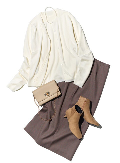 24Gのしっかりとした質感とボクシーなシルエットが特徴のカーディガン「WILLA」とモックネック「RENATA」のアンサンブルスタイル。全体を淡いトーンに揃えることで、リラックス感を与えながらも優雅で洗練された印象に。ロングスカートやブーツで縦のシルエットを強調することで、淡い色のアンサンブルも甘くなりすぎずに着こなせます。