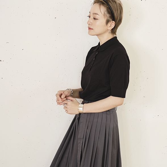 端正で上品なイメージにしようと思い、ロングスカート にポロシャツはインして、色もトーンを揃えました。 でも、髪の毛を明るくしたばかりなので、それがハズし というか遊びになって、まじめな感じになり過ぎず、 私らしいかなと思っています。襟付きのニットなので、 前髪はアップにして、顔まわりはすっきりと。