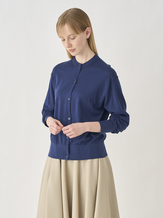 風にたなびくおおらかなアイテムが、肩肘張らない大人の雰囲気をつくりだしてくれます。ただし、ボタンがないからこそ、中に着るアイテム選びは大切にしたいところ。繊細な生地感であり、襟がついた端正なシャツを選ぶことで、緊張と緩和が調和する優雅な着こなしになります。シャツは第1ボタンを開けると、ボタンレスカーディガンに馴染みます。